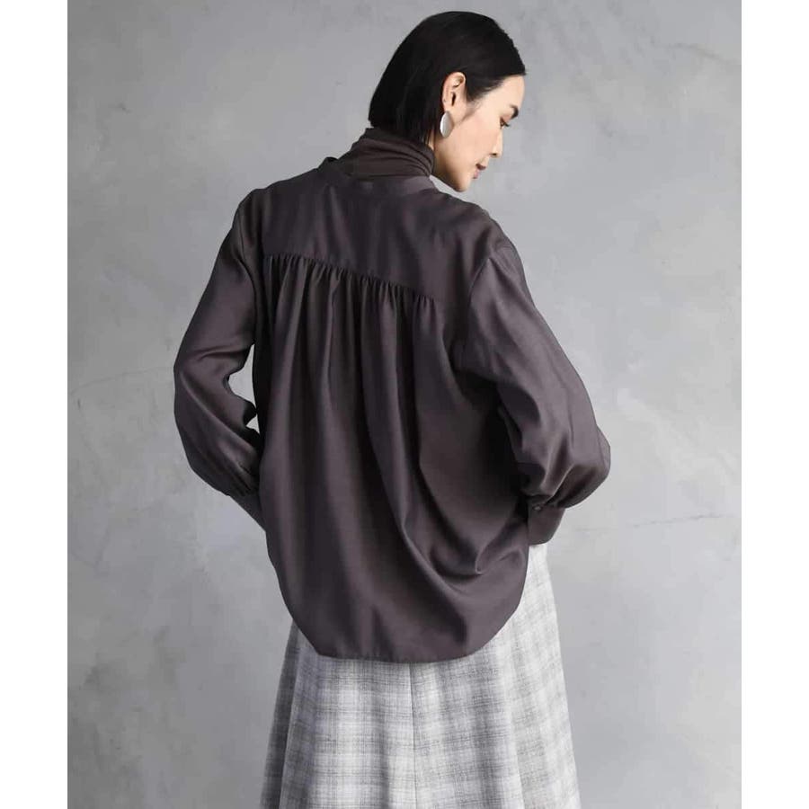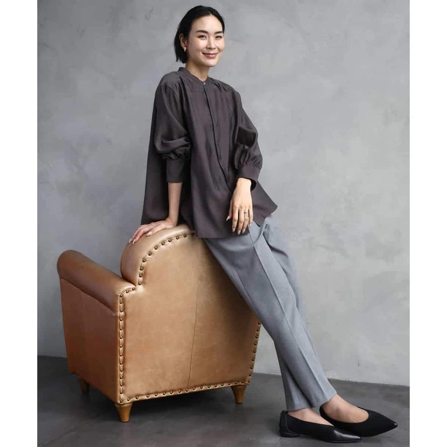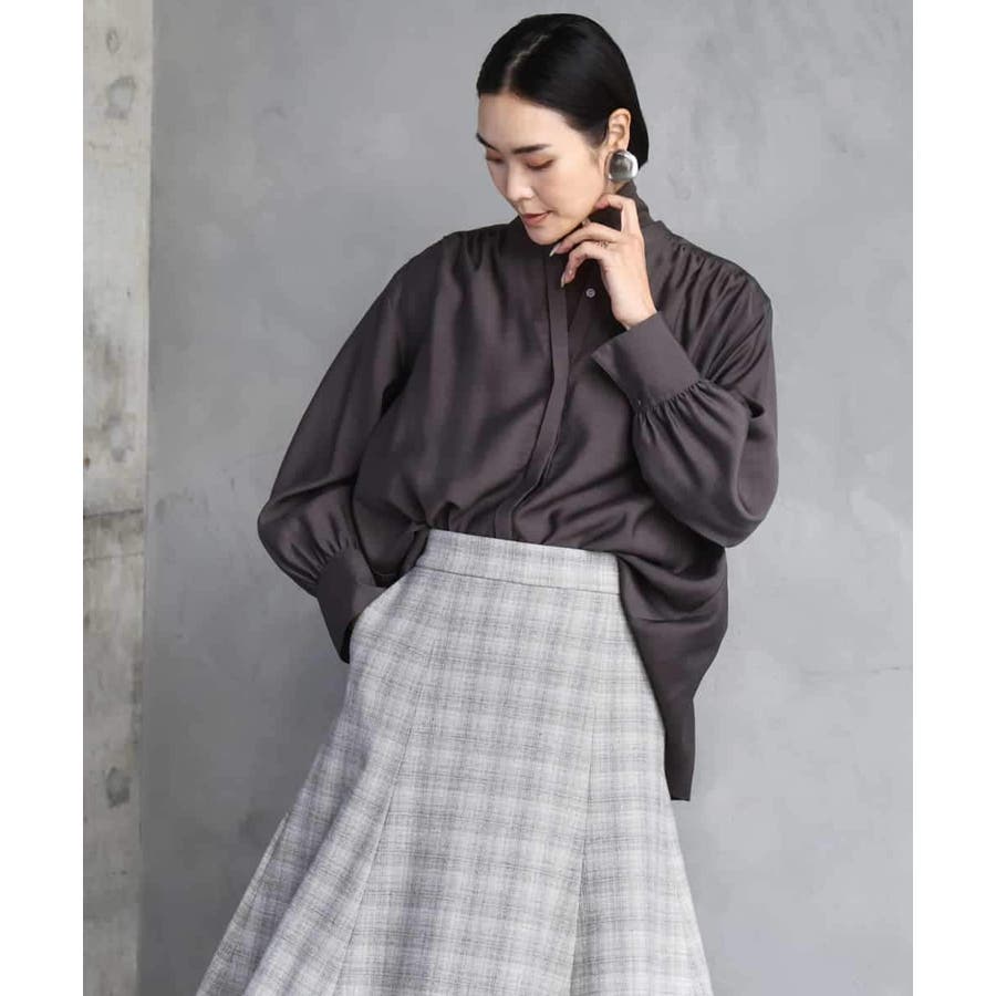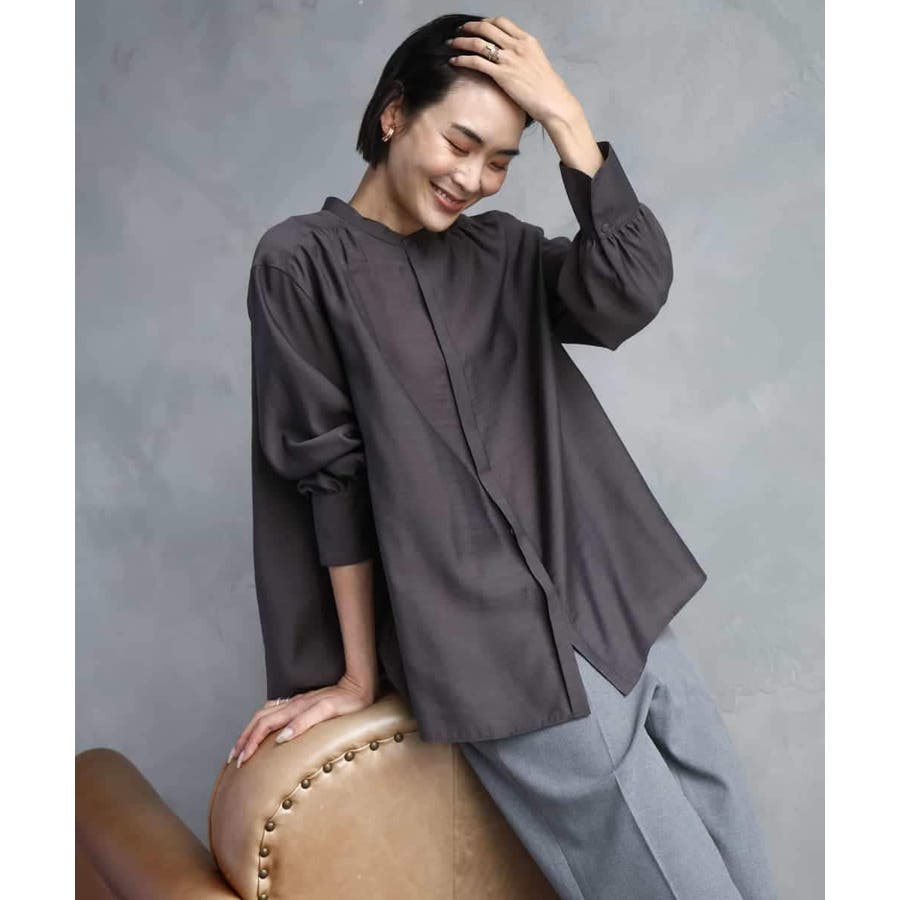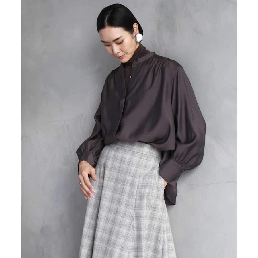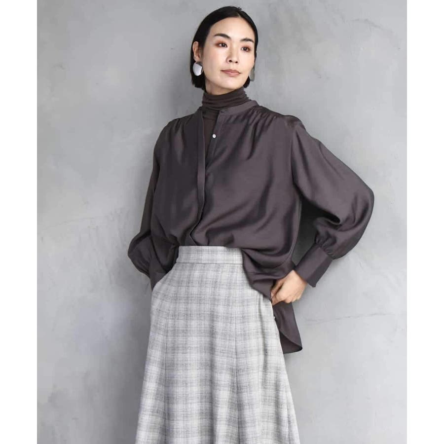 程よい透け感のある軽やかな素材で、ボトムスを選ばず幅広くコーディネートできます。スカートやパンツに合わせて、シーンに応じた上品な着こなしが楽しめます。軽やかで適度なハリ感がボディラインを拾わず、美しいシルエットをキープ。インナーにハイネックカットソー[FMKAD19130]を重ねたレイヤードスタイルがおすすめです。同デザインのチェック柄[FMBAD09260]もご用意いたしております。