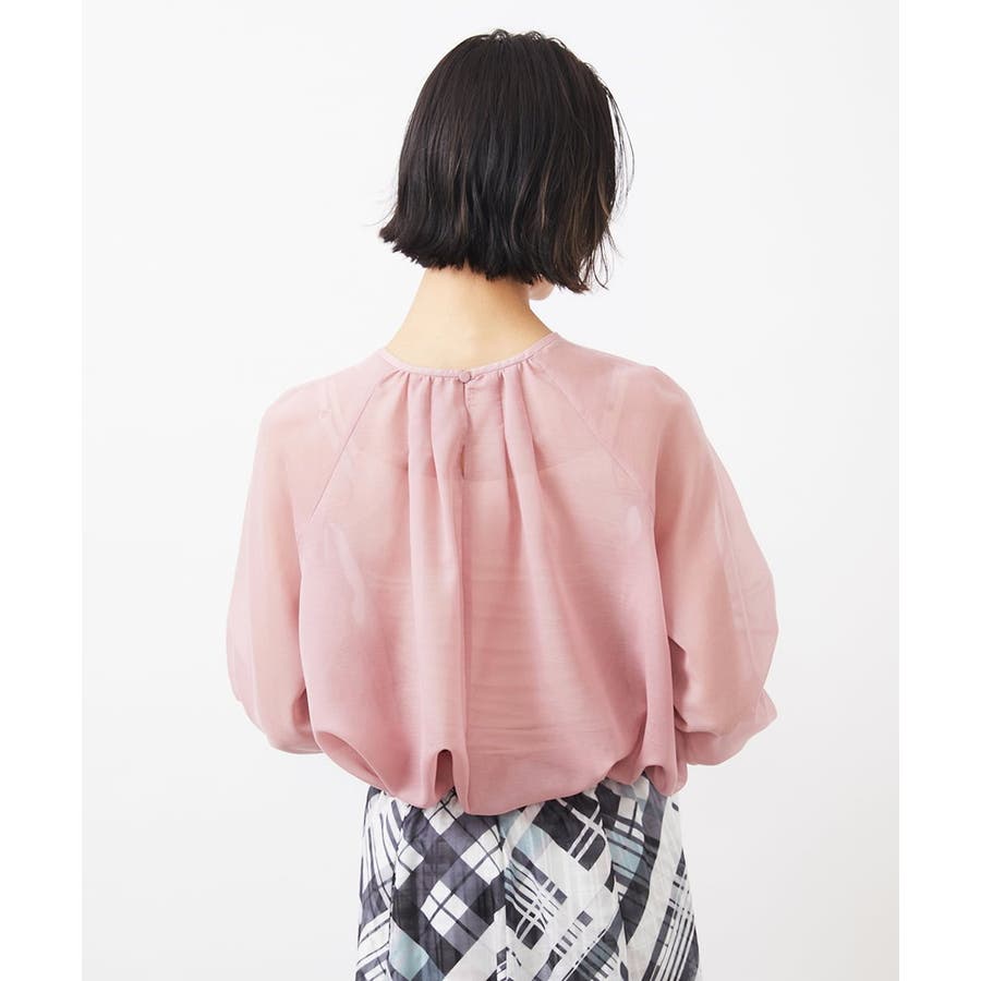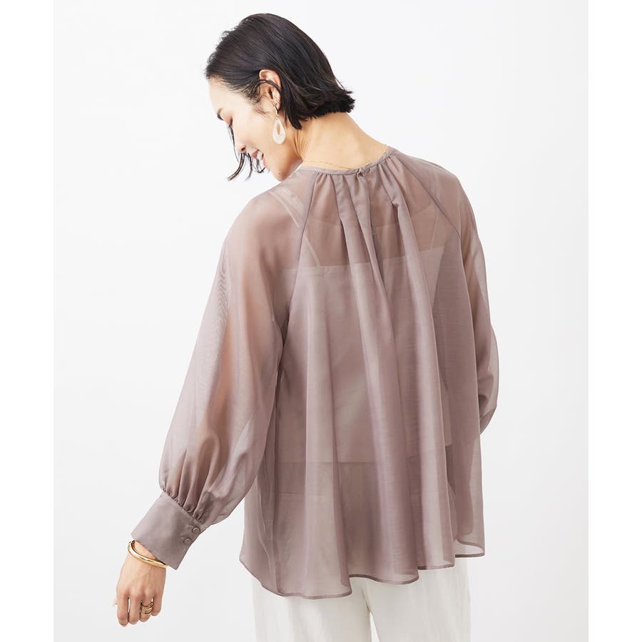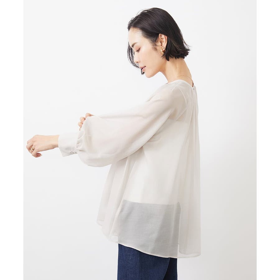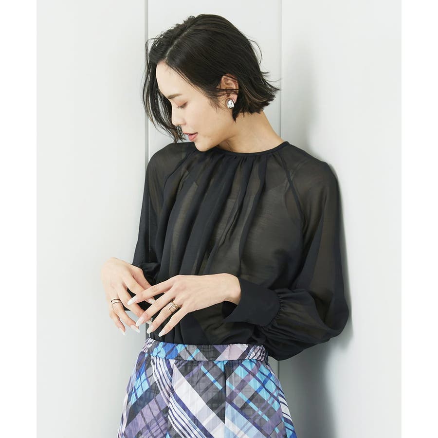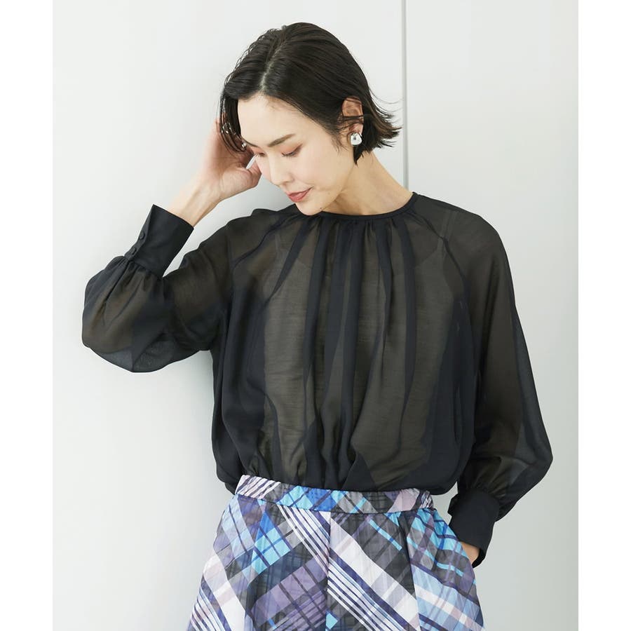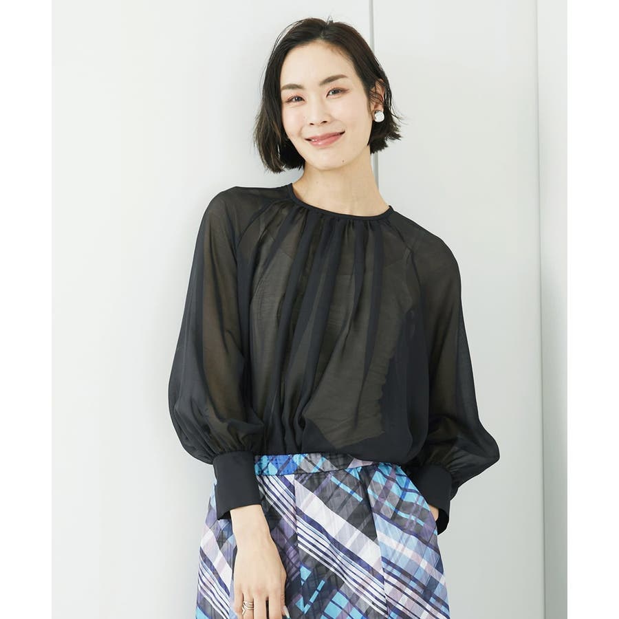 素材の特性を活かしたシアーブラウス。インでもアウトでも着られるレングス設定です。ボリュームのあるパフスリーブも前はすっきり、後ろにボリュームを持たせることで横から見た時も袖が太すぎずフェミニンな印象に仕上がっています。40サイズは限定店舗展開です。