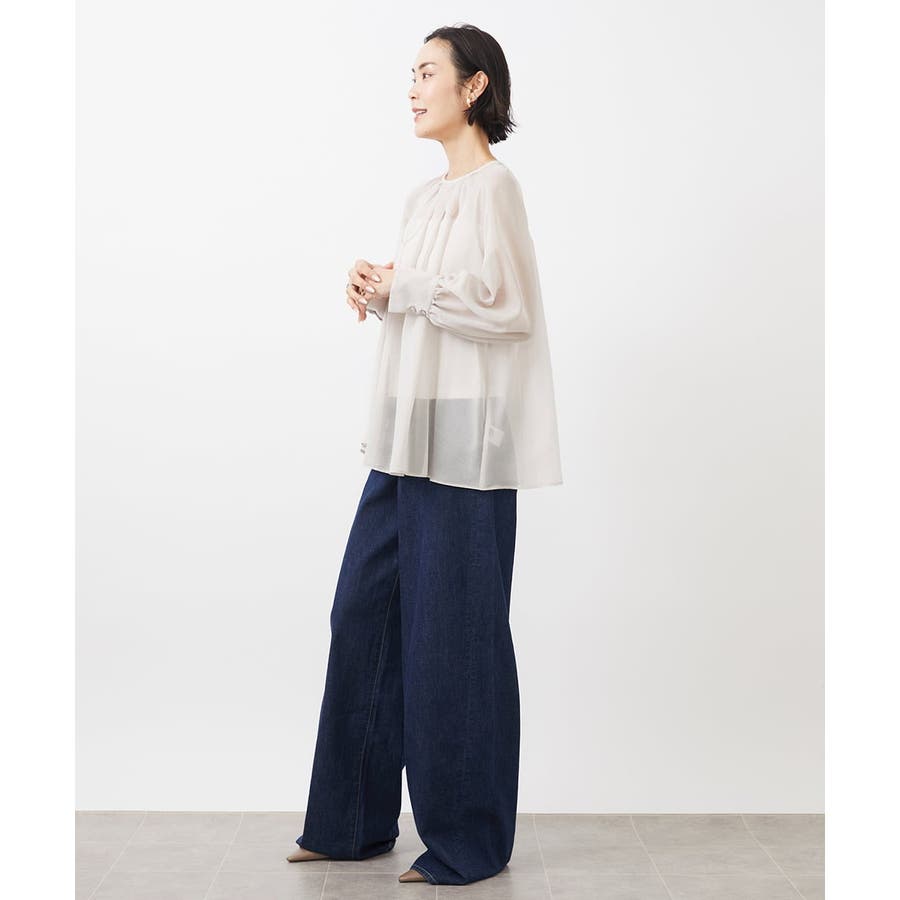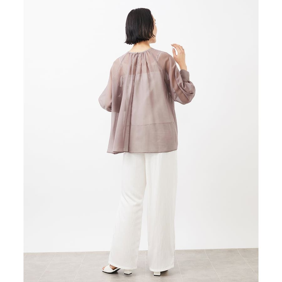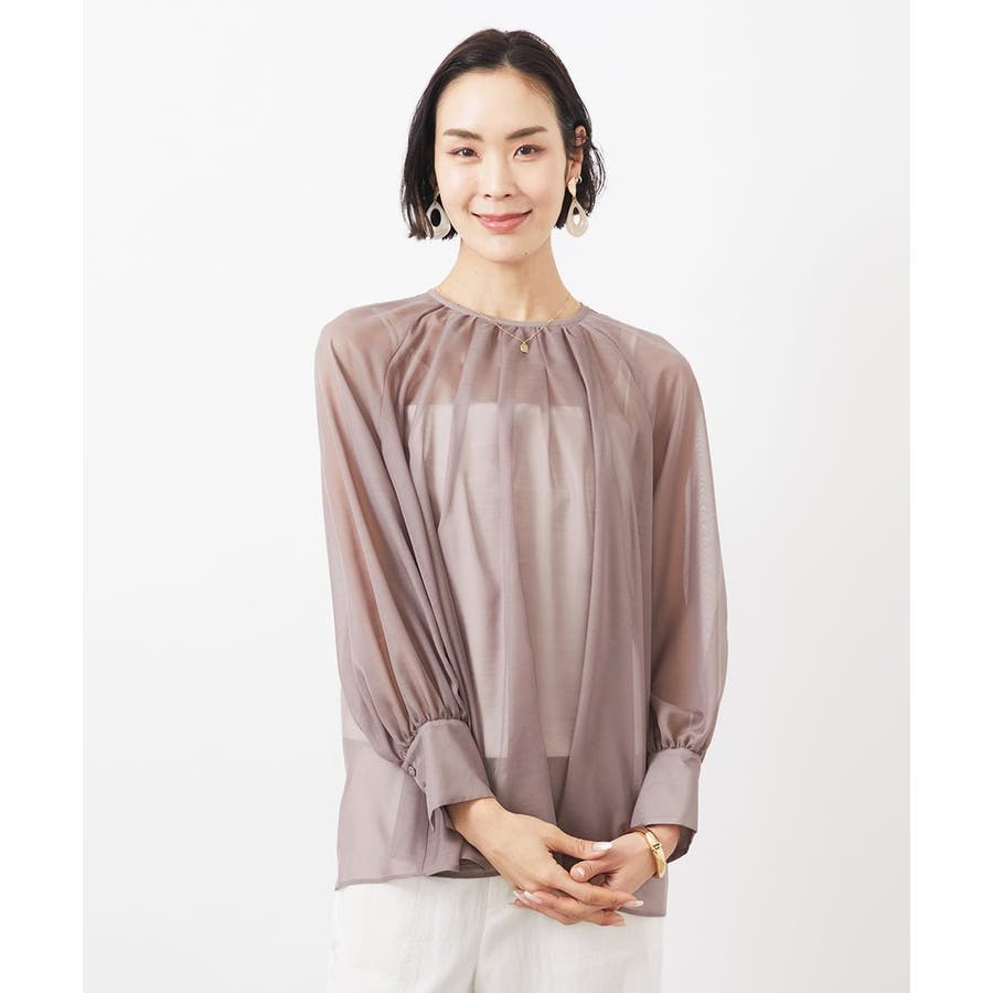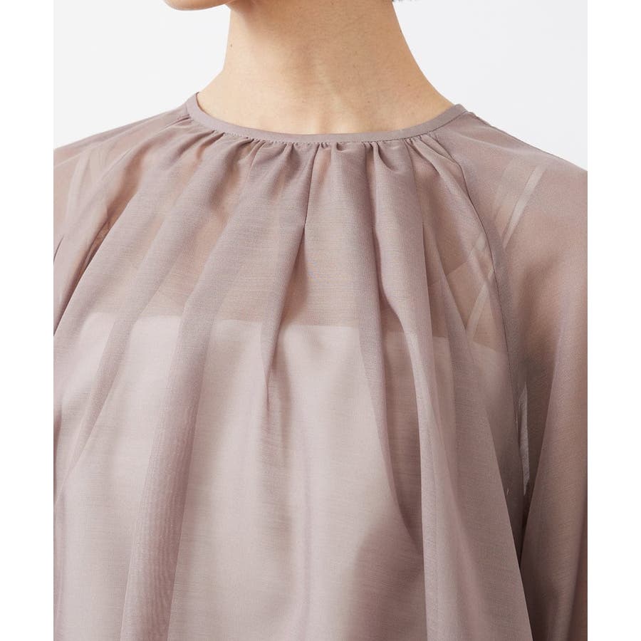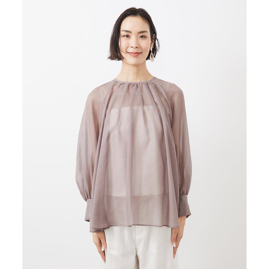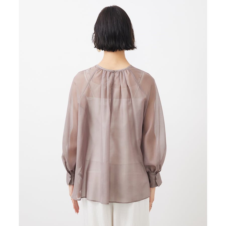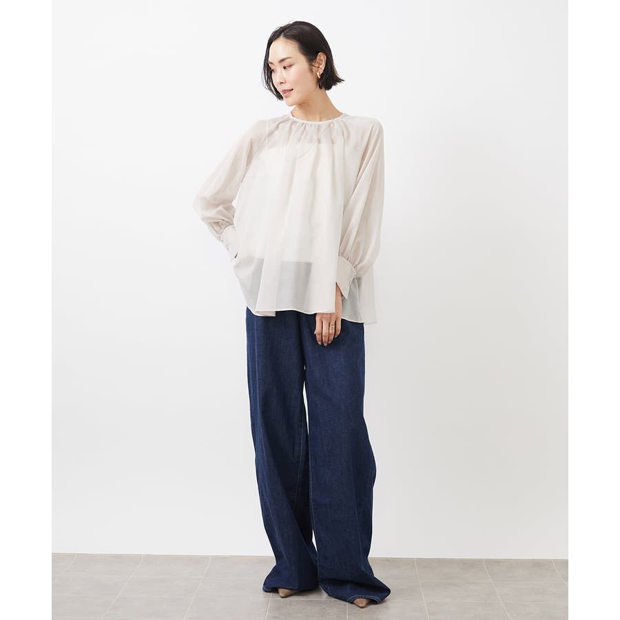 素材の特性を活かしたシアーブラウス。インでもアウトでも着られるレングス設定です。ボリュームのあるパフスリーブも前はすっきり、後ろにボリュームを持たせることで横から見た時も袖が太すぎずフェミニンな印象に仕上がっています。40サイズは限定店舗展開です。