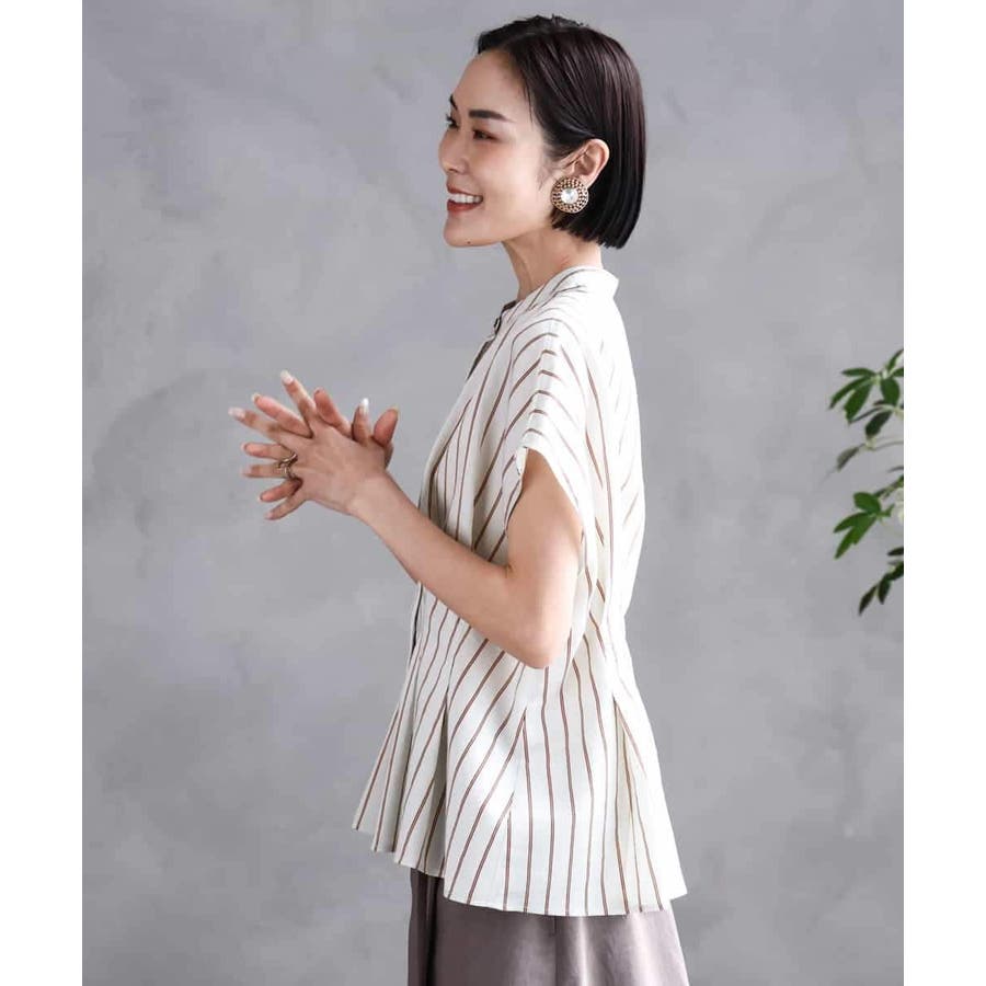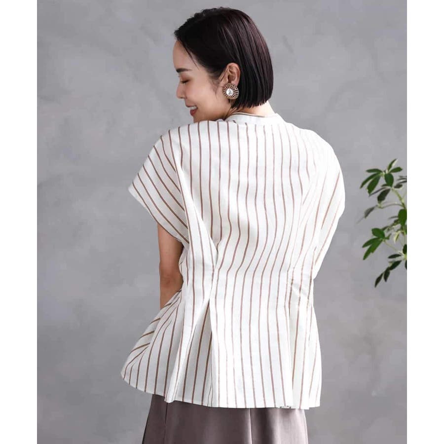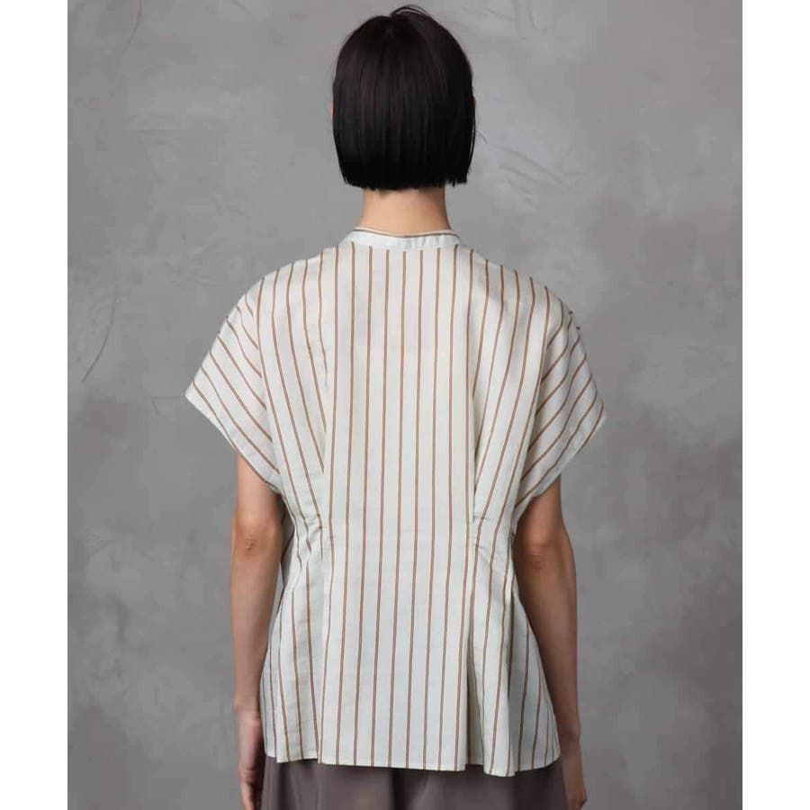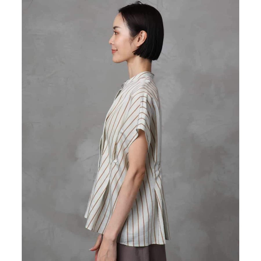 安心感のある適度なゆとりを残しつつ、緩やかにウエストをシェイプさせる事で着心地の良さとスタイルアップ効果も両立させたペプラムデザイン。ニュアンスカラーのストライプは、夏の焼けた肌にもなじみの良いこなれたカラーでコーディネートもしやすいのがポイントです。