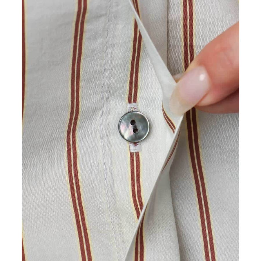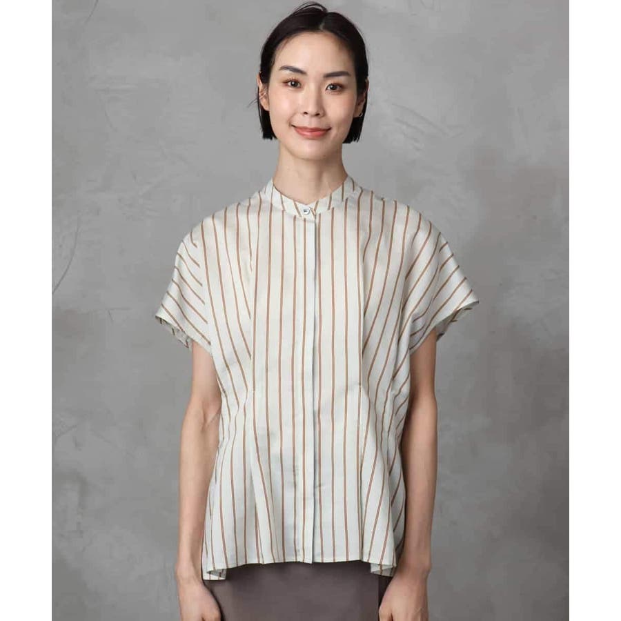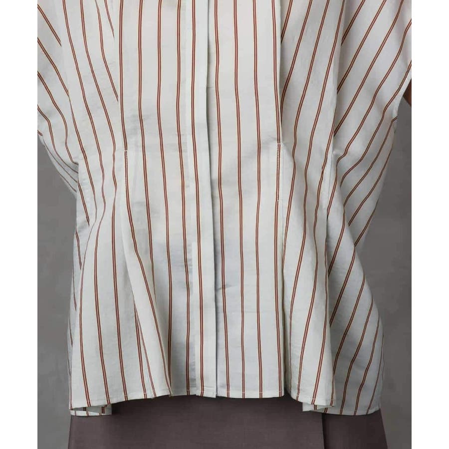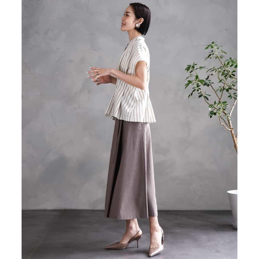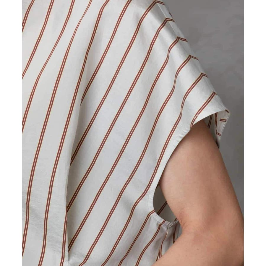 安心感のある適度なゆとりを残しつつ、緩やかにウエストをシェイプさせる事で着心地の良さとスタイルアップ効果も両立させたペプラムデザイン。ニュアンスカラーのストライプは、夏の焼けた肌にもなじみの良いこなれたカラーでコーディネートもしやすいのがポイントです。