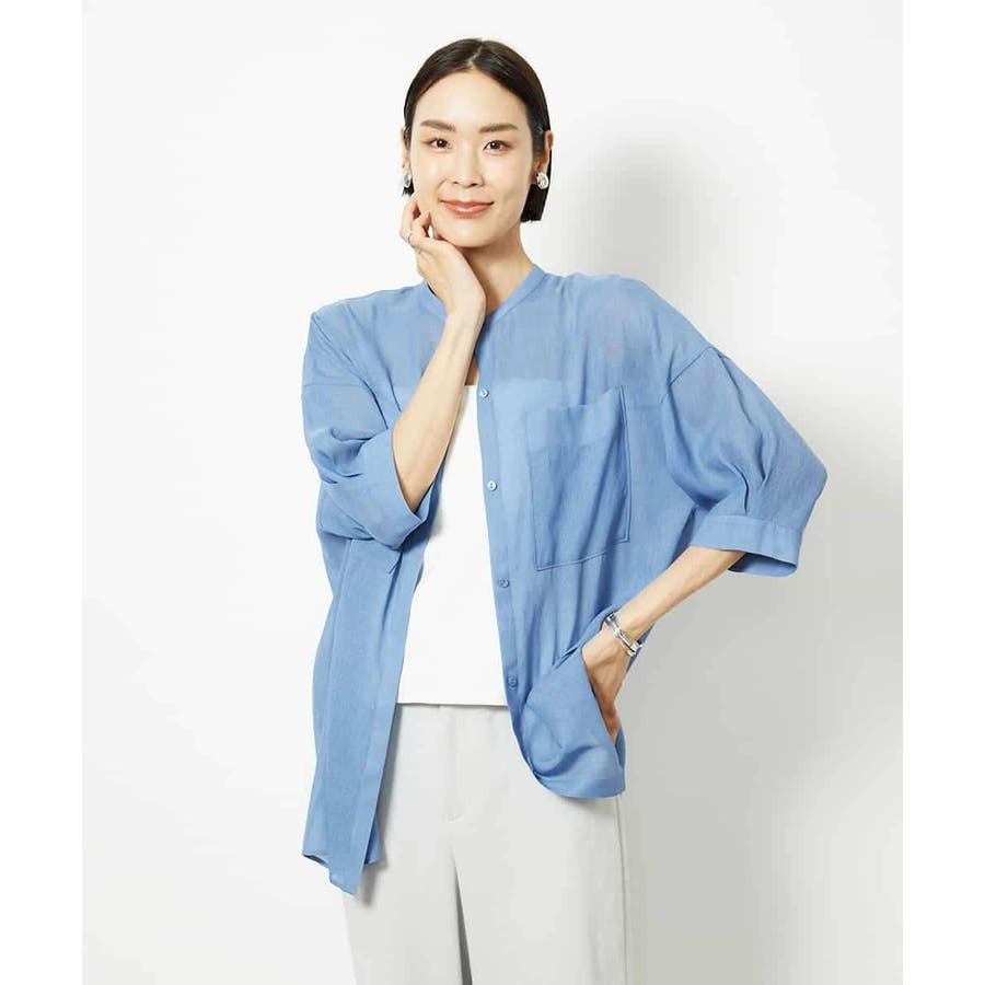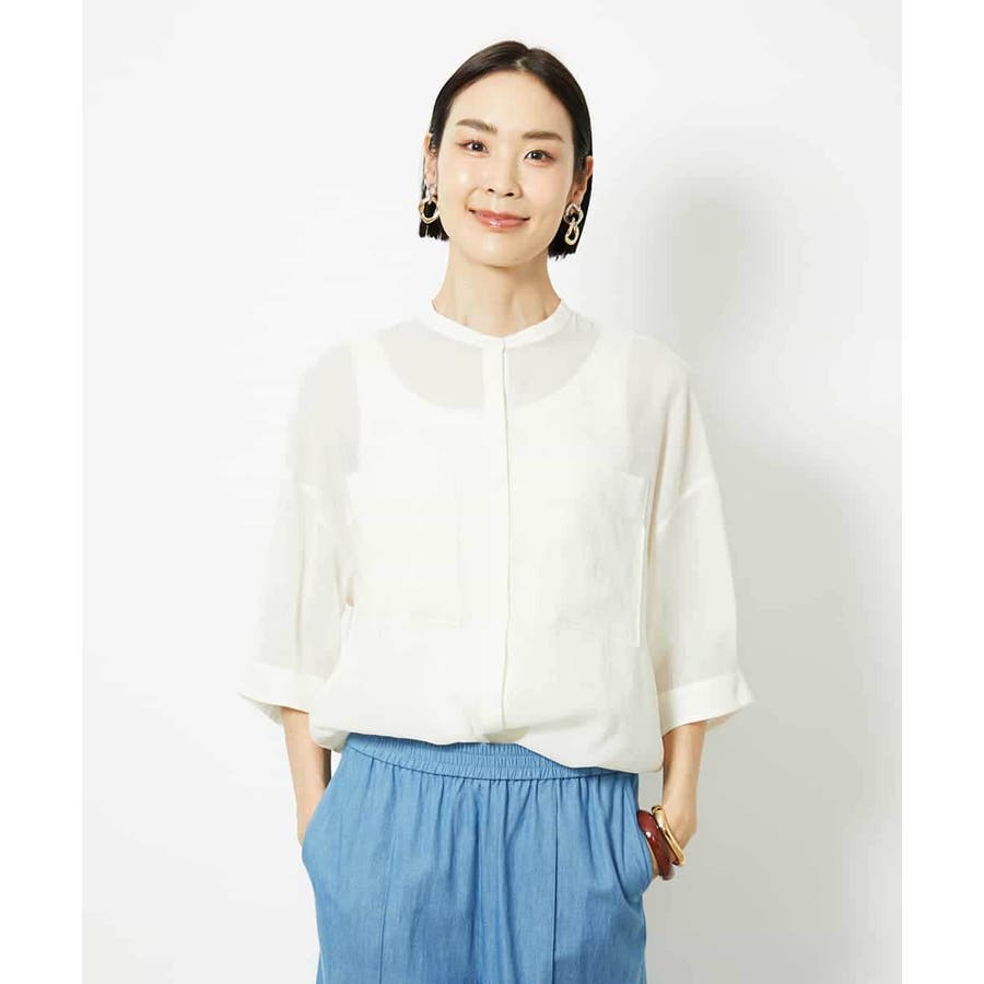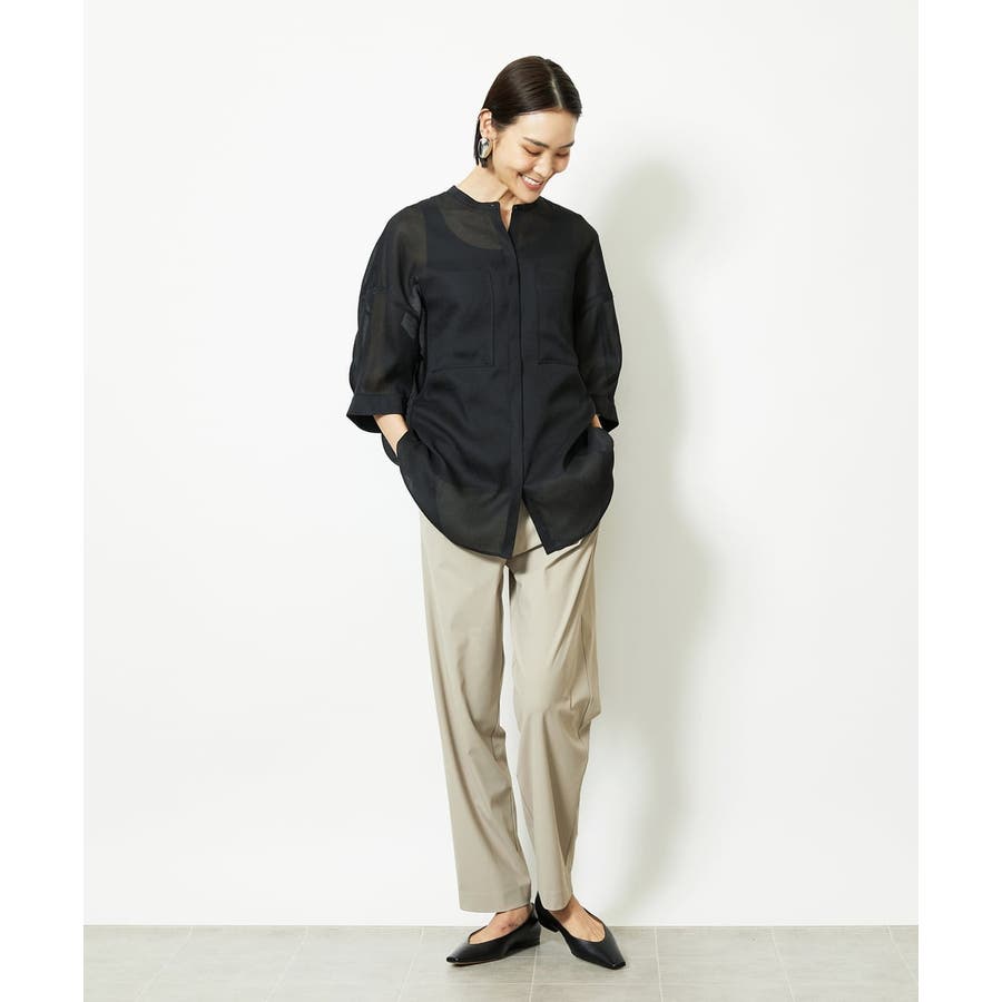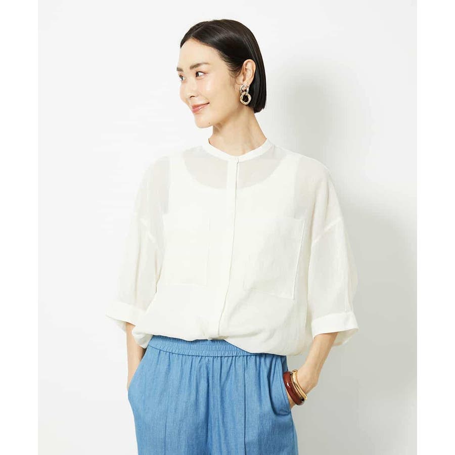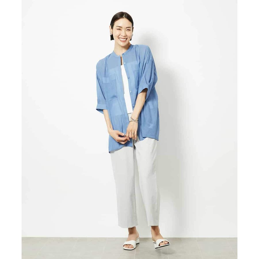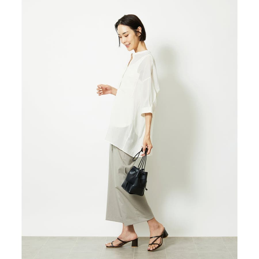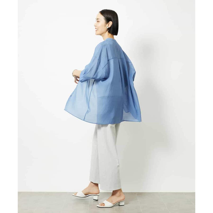 軽やかな素材で、風通しがよく暑い季節も快適に過ごせます。襟元を後ろに抜いて着るとこなれ感が出て、パフスリーブがさりげなくフェミニンな印象に。前だけインすることで、上半身がコンパクトにまとまり、旬な着こなしに仕上がります。前を開けて羽織りとしても使える、着回し力の高い一着です。40サイズは限定店舗展開です。