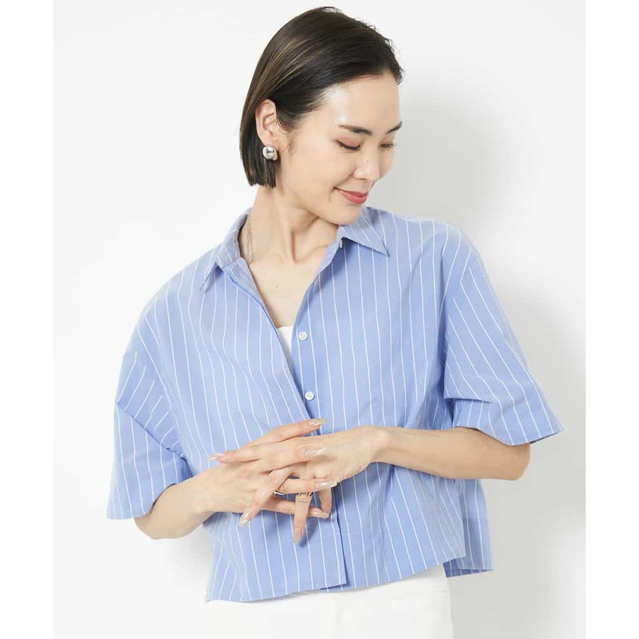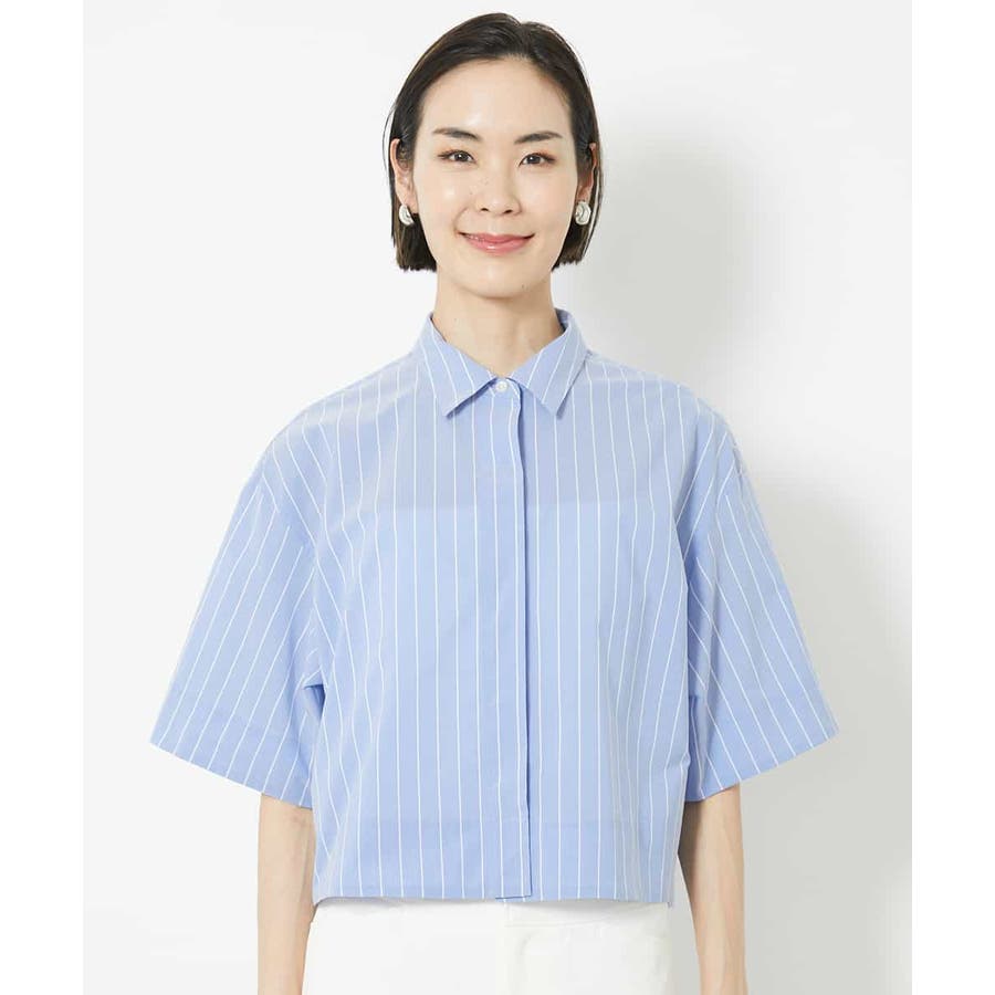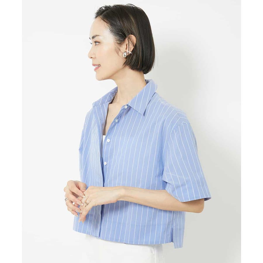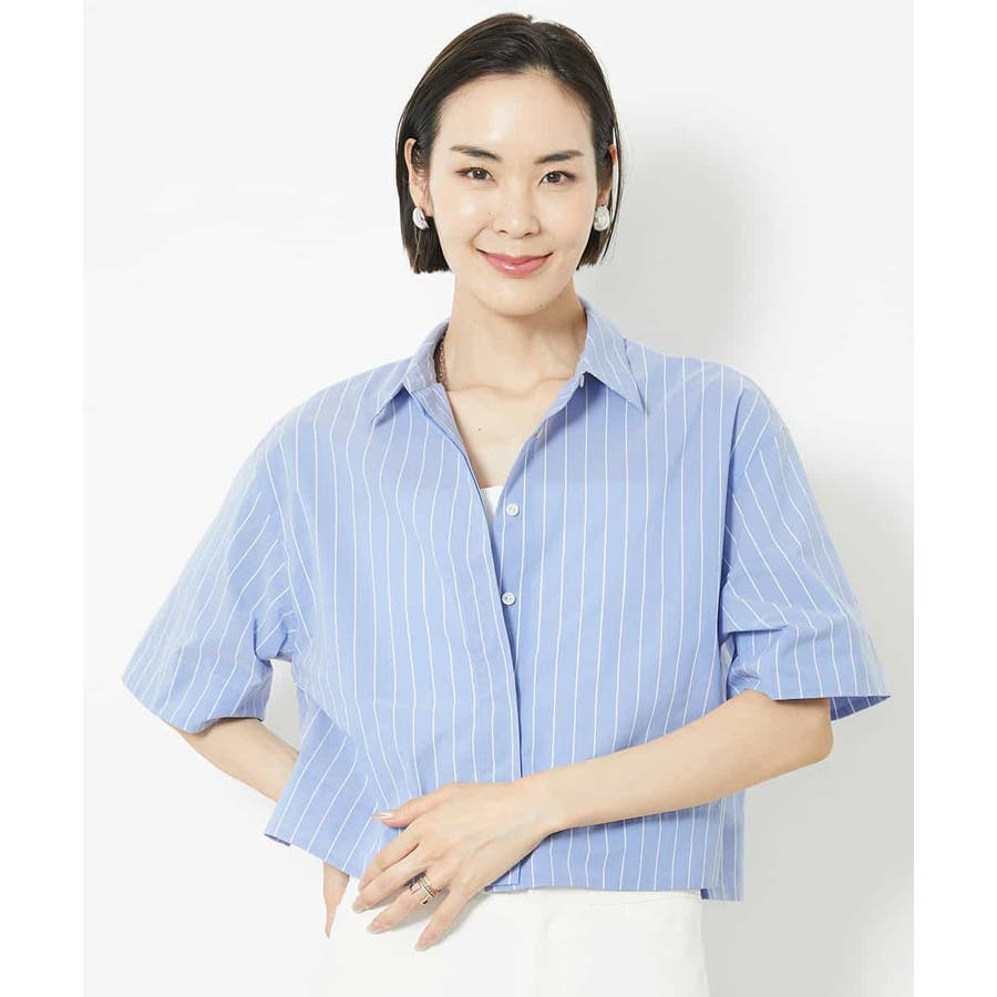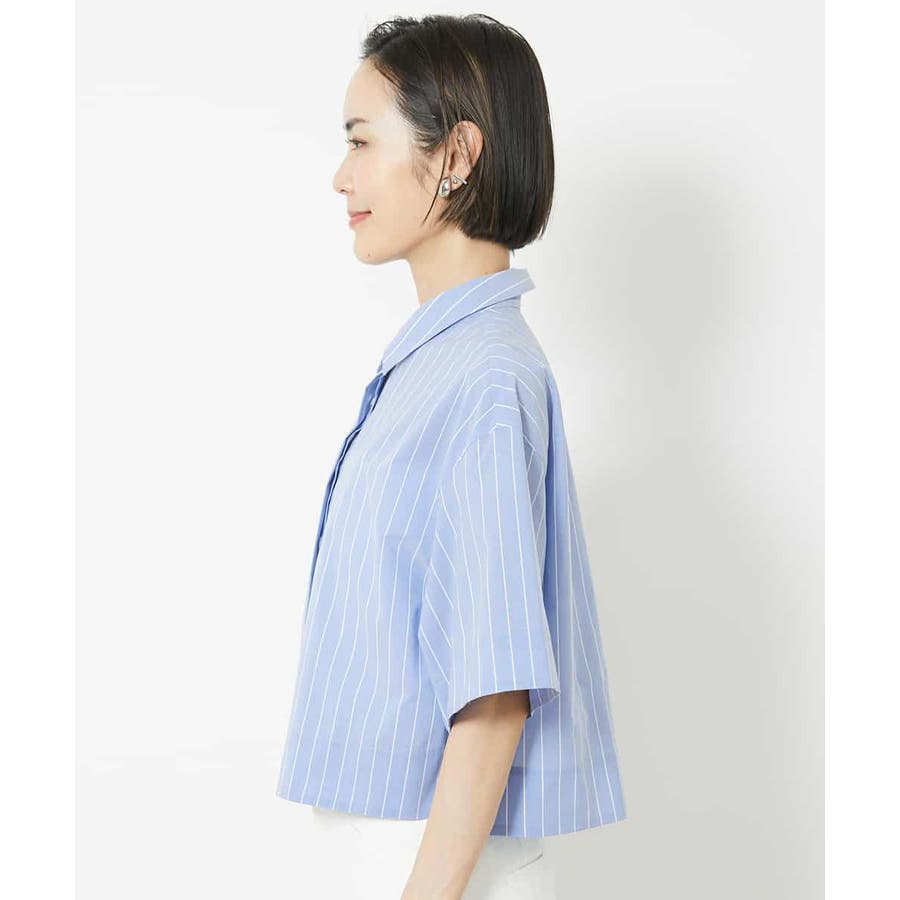 爽やかなストライプの素材でショート丈のシャツブラウスをご用意いたしました。リラックス感のあるサイズ感に設定し、一枚着としても、軽い羽織代わりにしても使い勝手の良いシャツアイテムです。ひじにかかる安心の袖丈も嬉しいポイント。40サイズは限定店舗展開です。