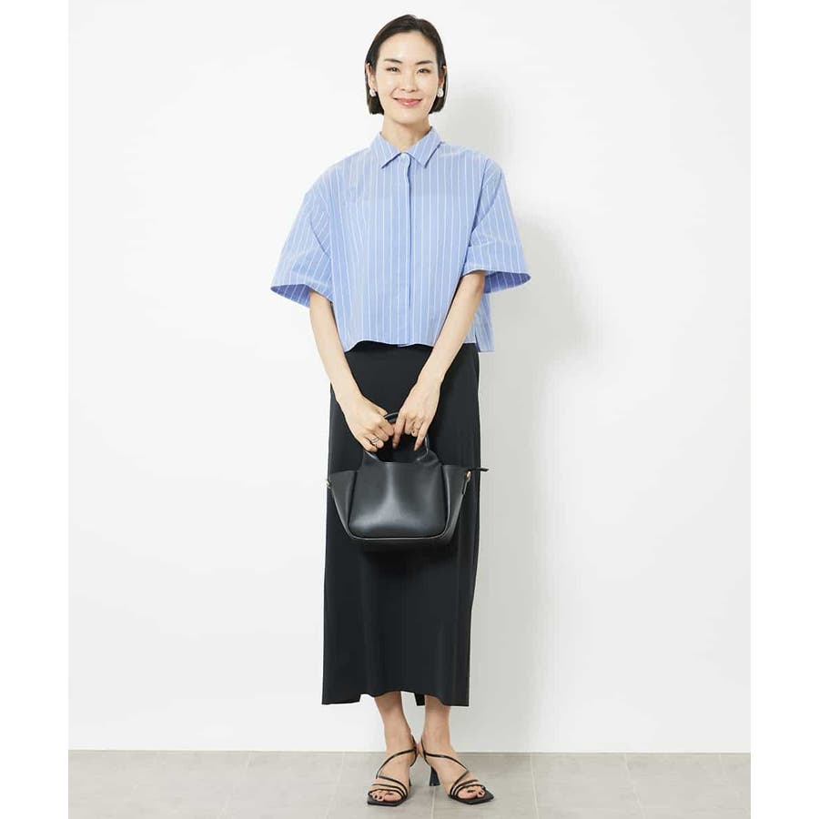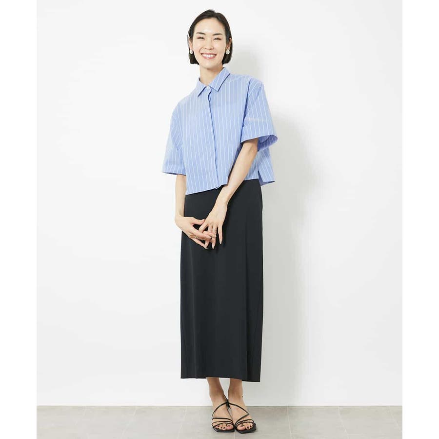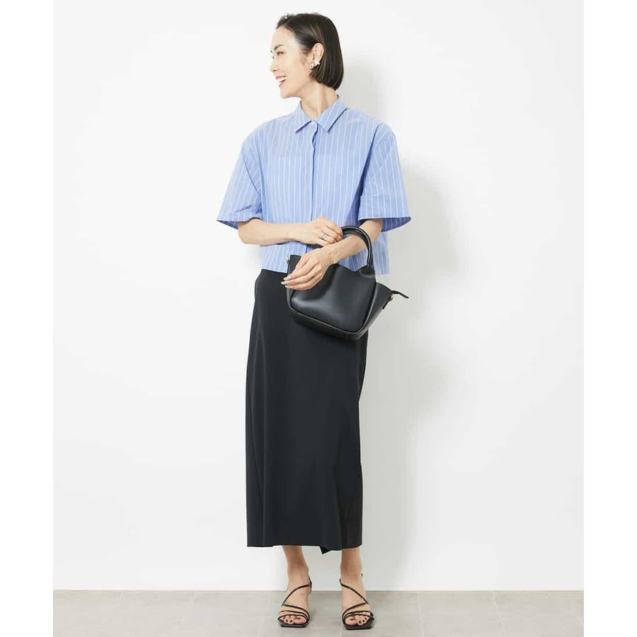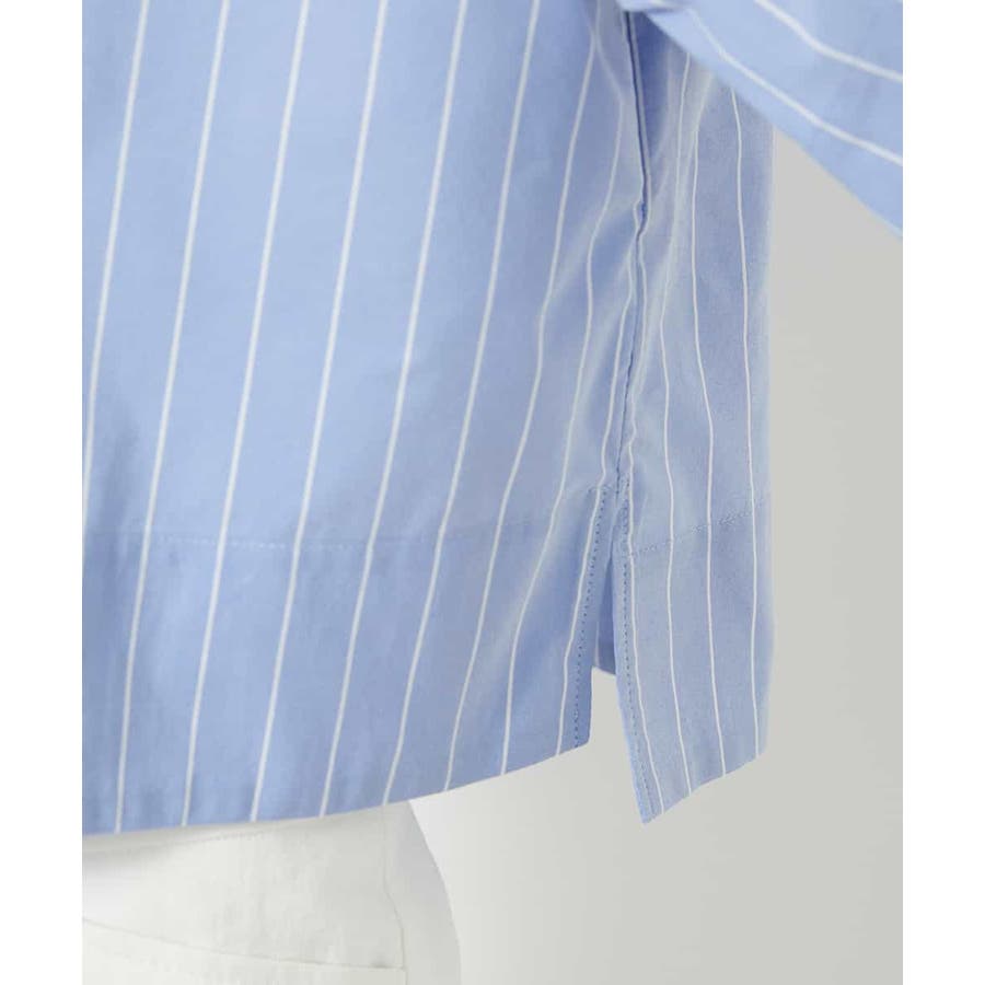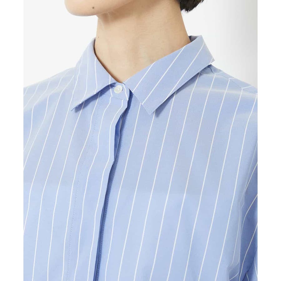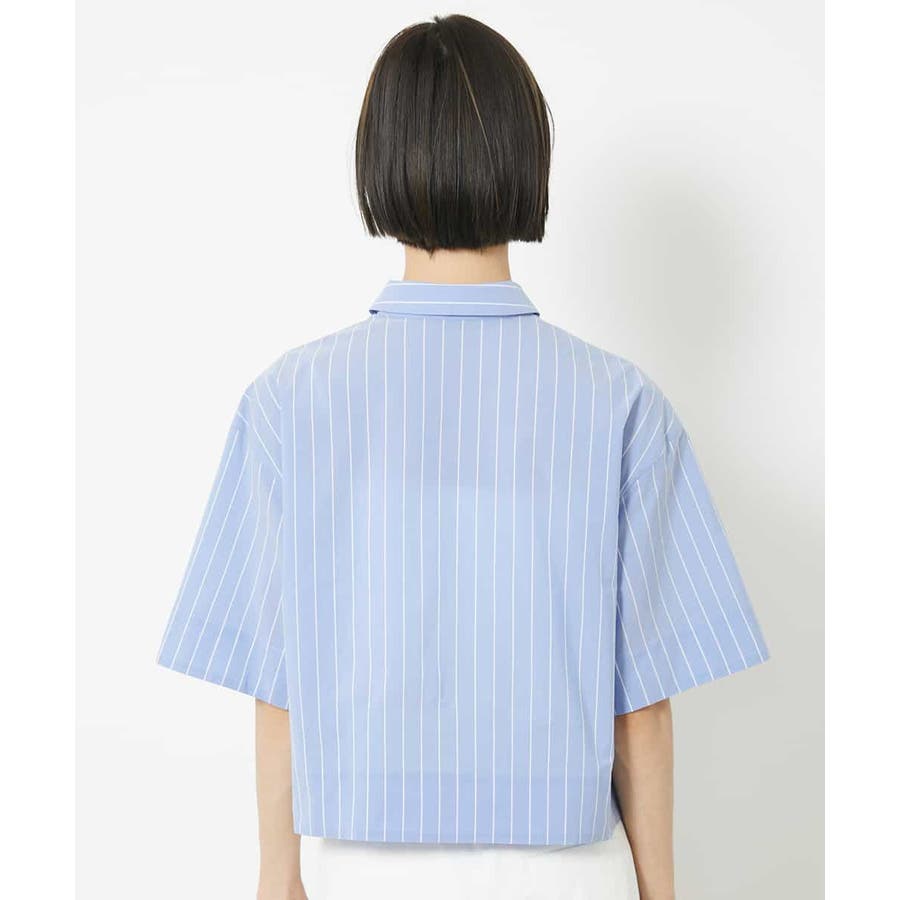 爽やかなストライプの素材でショート丈のシャツブラウスをご用意いたしました。リラックス感のあるサイズ感に設定し、一枚着としても、軽い羽織代わりにしても使い勝手の良いシャツアイテムです。ひじにかかる安心の袖丈も嬉しいポイント。40サイズは限定店舗展開です。