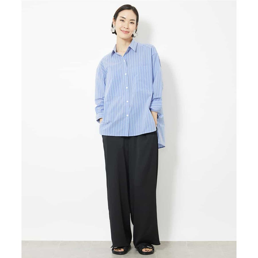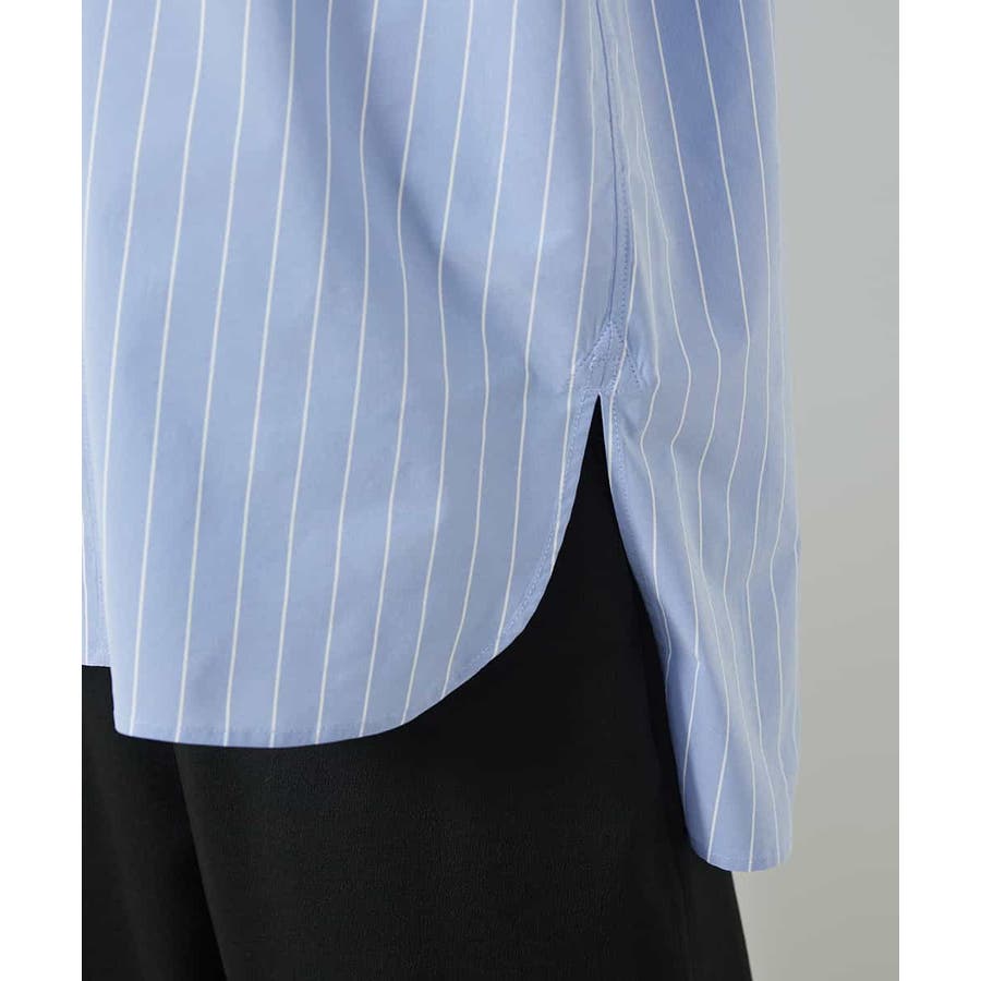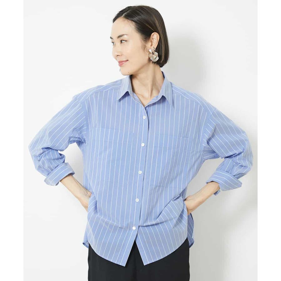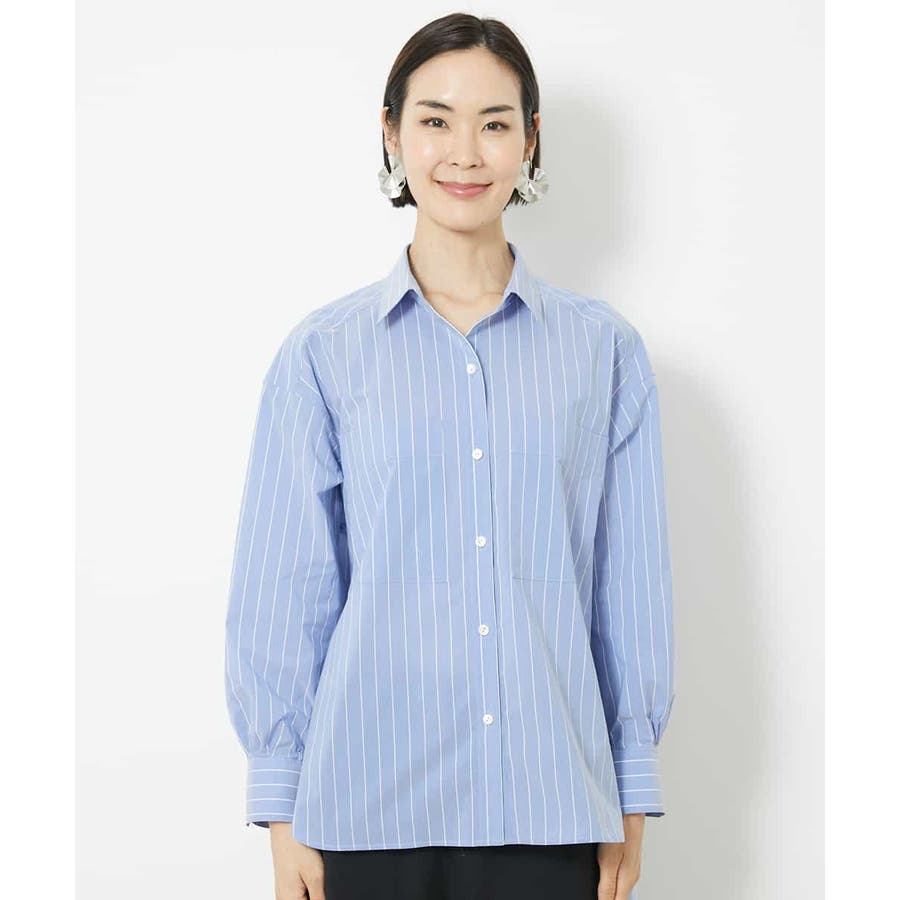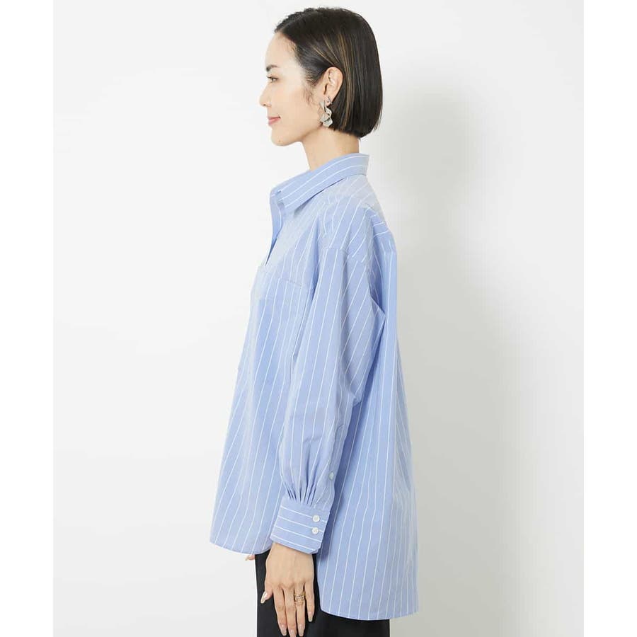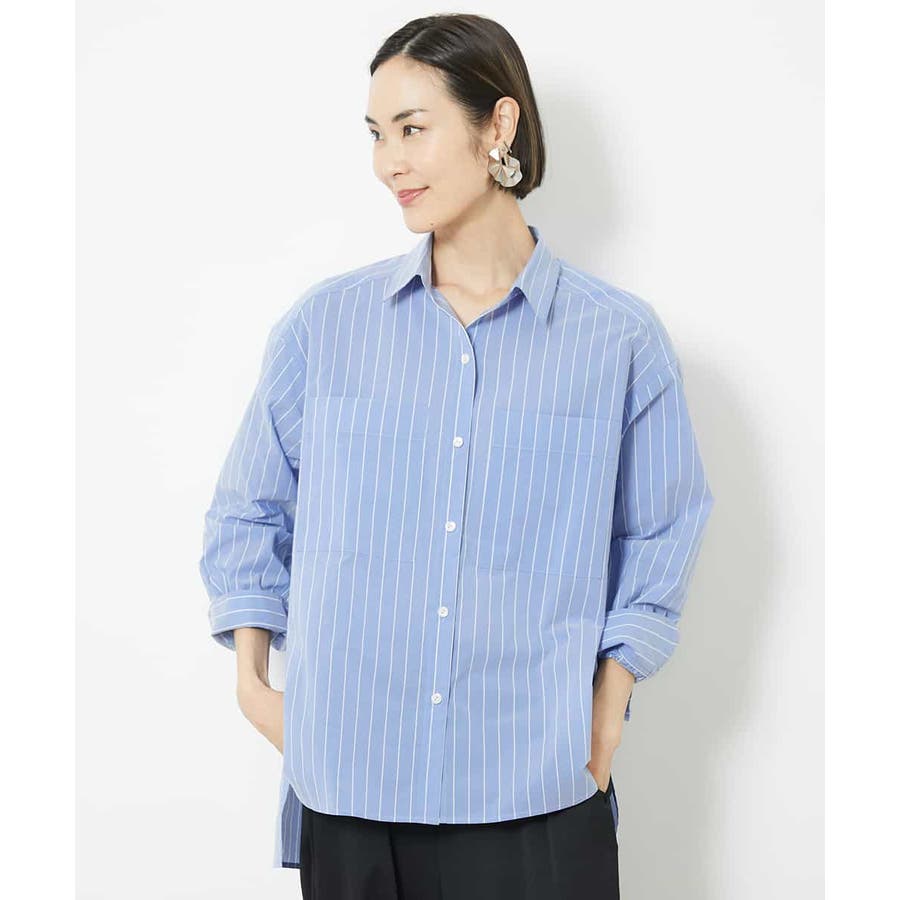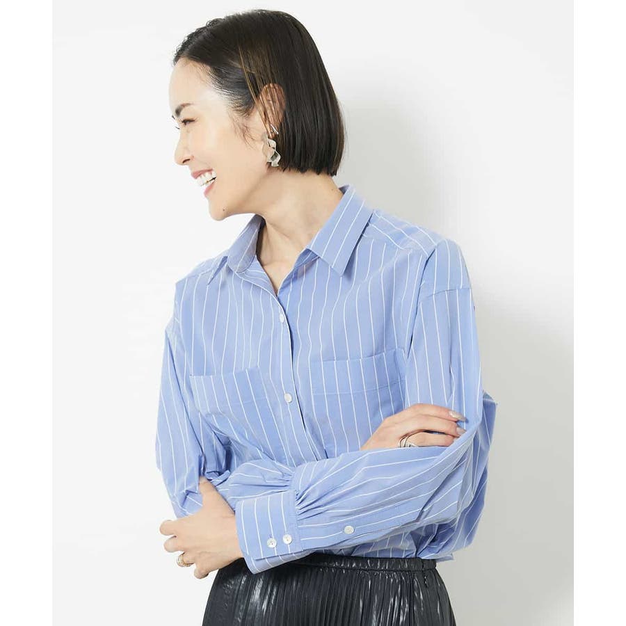爽やかなストライプの素材のシャツブラウスをご用意いたしました。リラックス感のあるサイズ感に設定し、一枚着としても、軽い羽織代わりにしても使い勝手の良いシャツアイテムです。またカーディガンやアウターのインナーにしたりとシーズンレスで使える着回し力の高いアイテムです。 40サイズは限定店舗展開です。