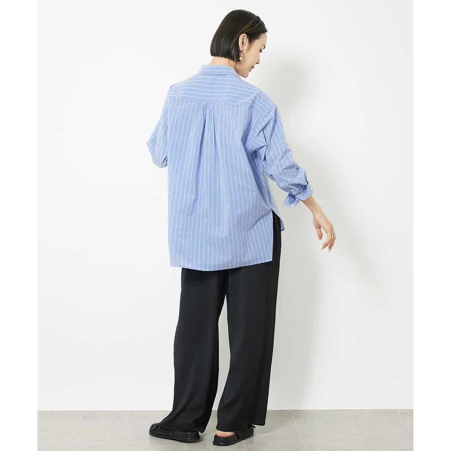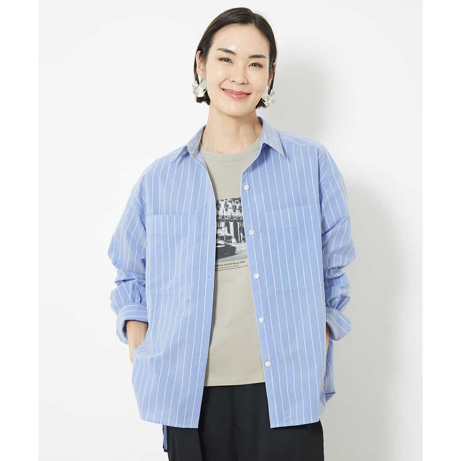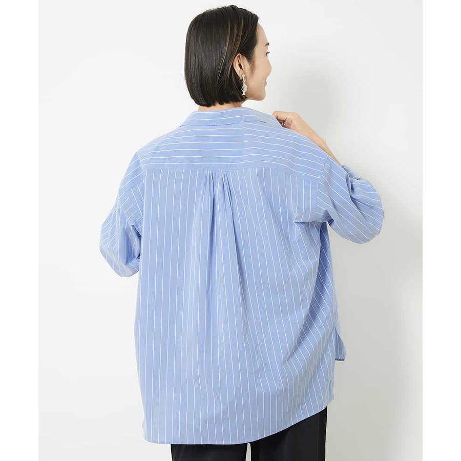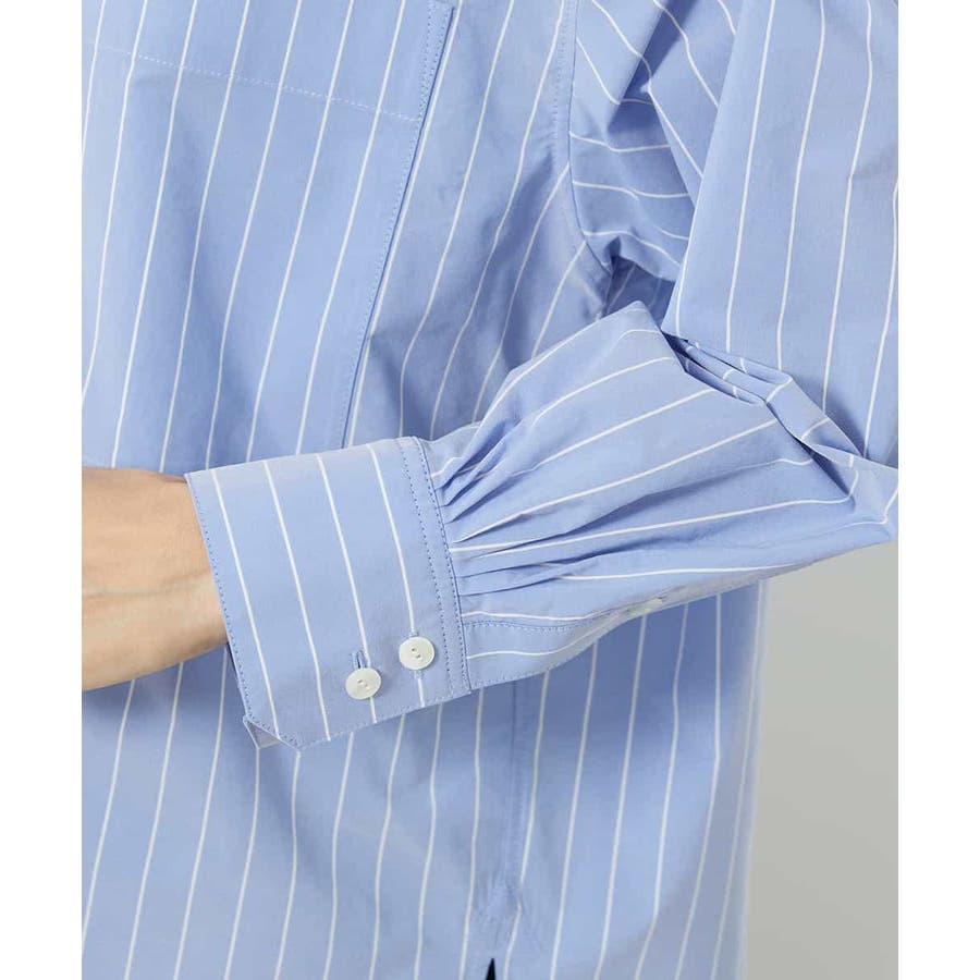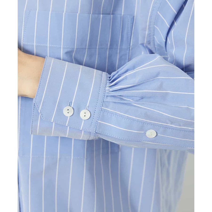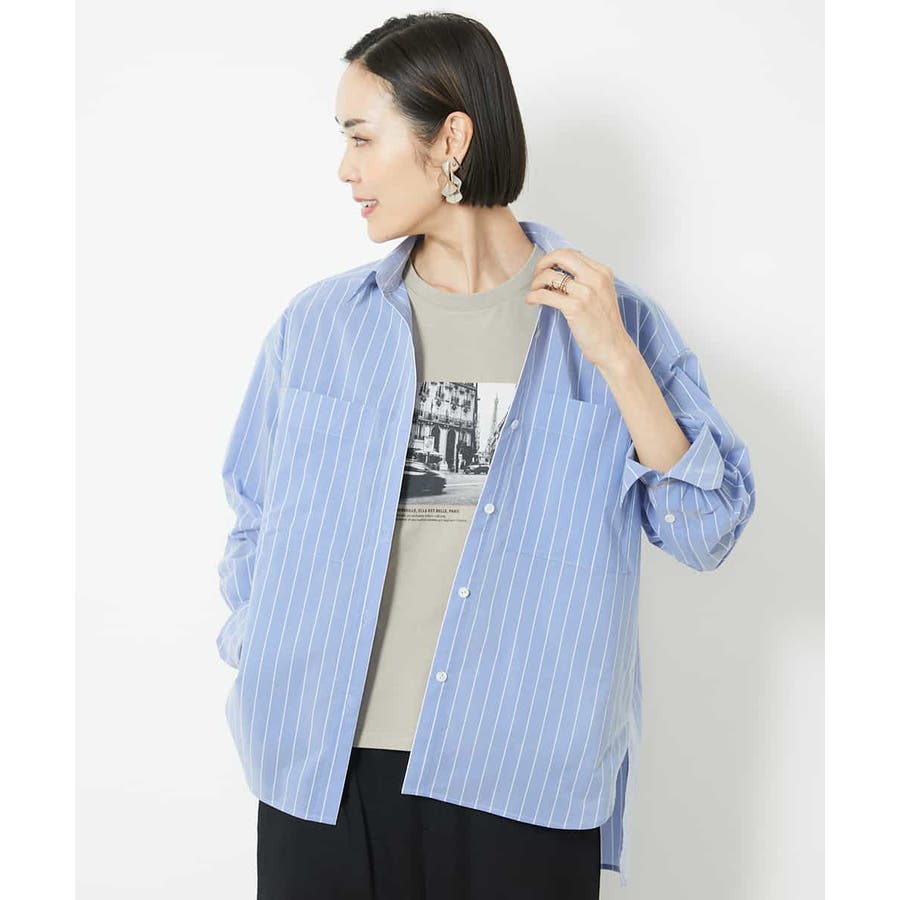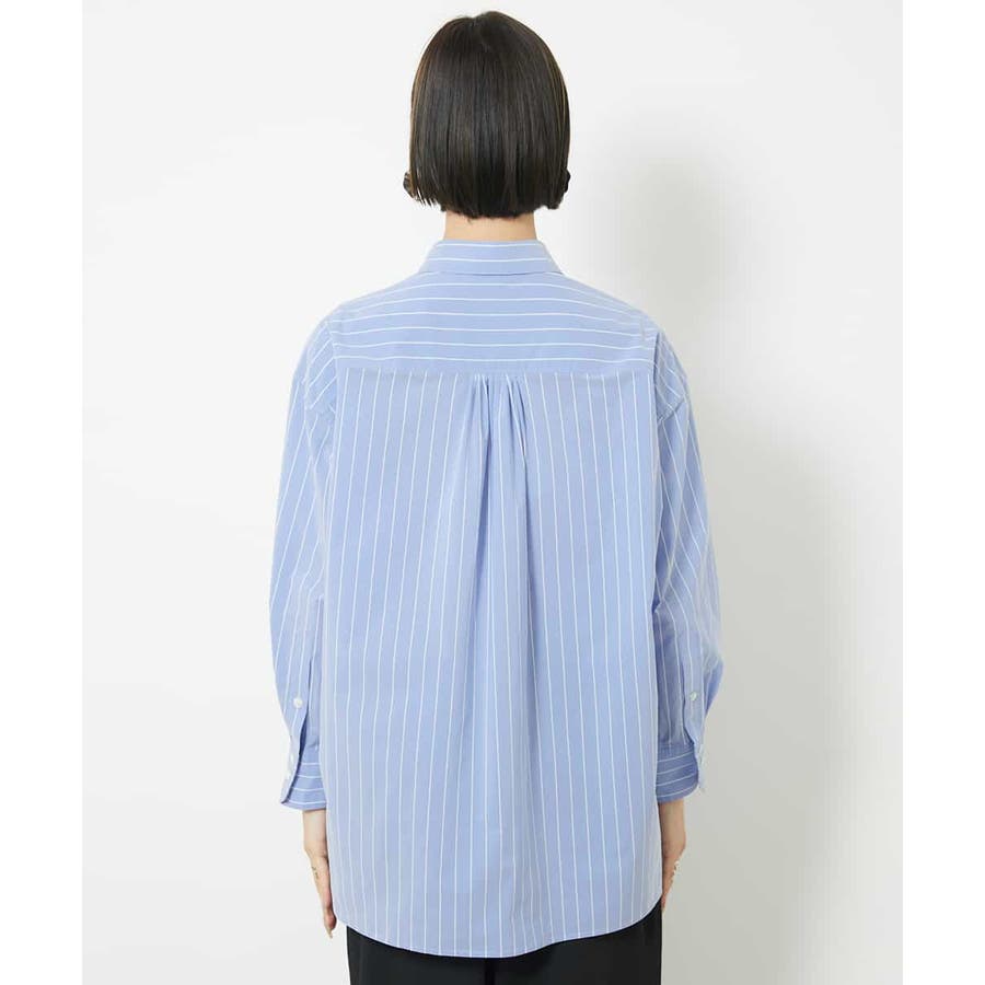 爽やかなストライプの素材のシャツブラウスをご用意いたしました。リラックス感のあるサイズ感に設定し、一枚着としても、軽い羽織代わりにしても使い勝手の良いシャツアイテムです。またカーディガンやアウターのインナーにしたりとシーズンレスで使える着回し力の高いアイテムです。 40サイズは限定店舗展開です。