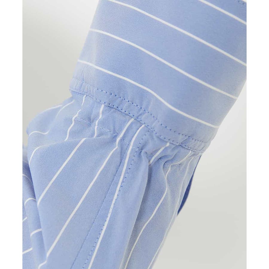 リサイクルポリエステルを使用したデザイン性とサスティナブルを両立した先染めストライプ生地。さらっとした肌触りで爽やかな発色の素材。強すぎないストライプが合わせやすい素材です。