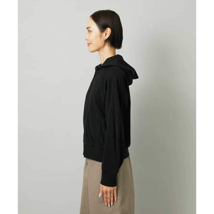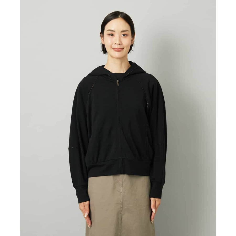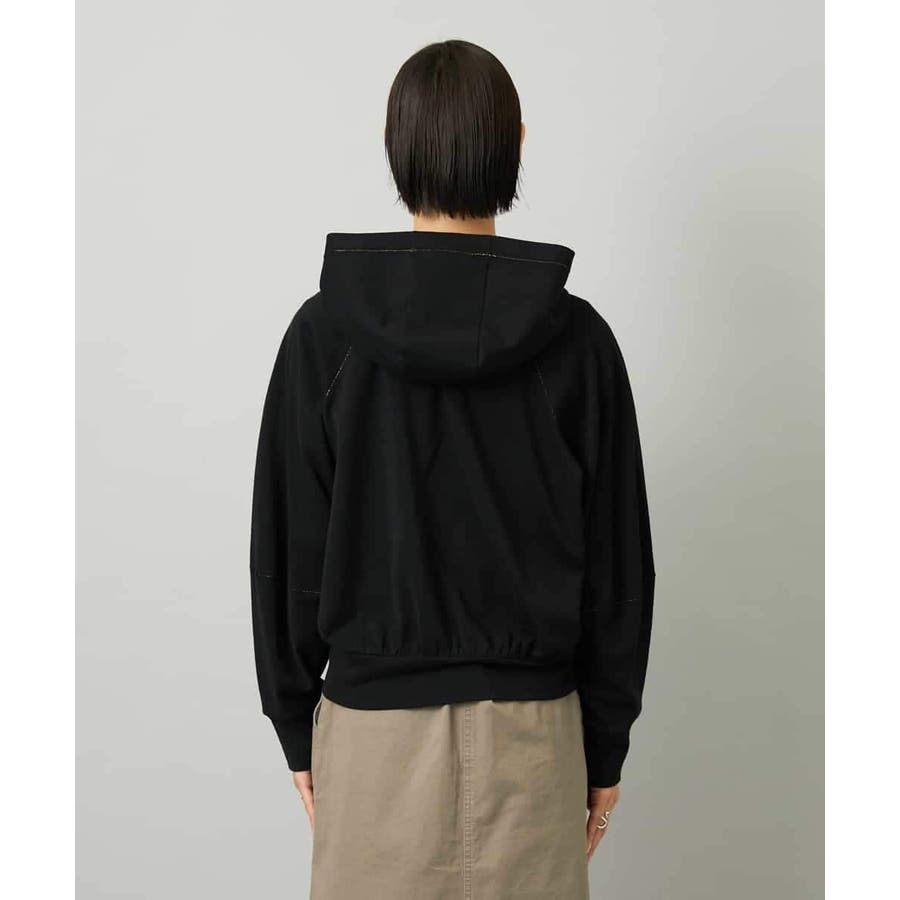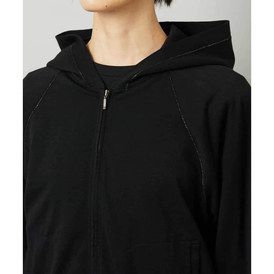 ほんのりシアーな表情が魅力のジップアップパーカーは、ラメ糸を効かせた3本針ステッチがさりげないアクセントに。