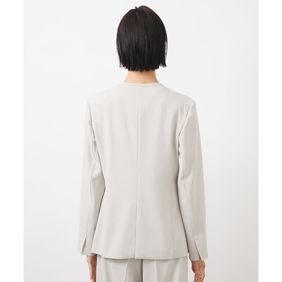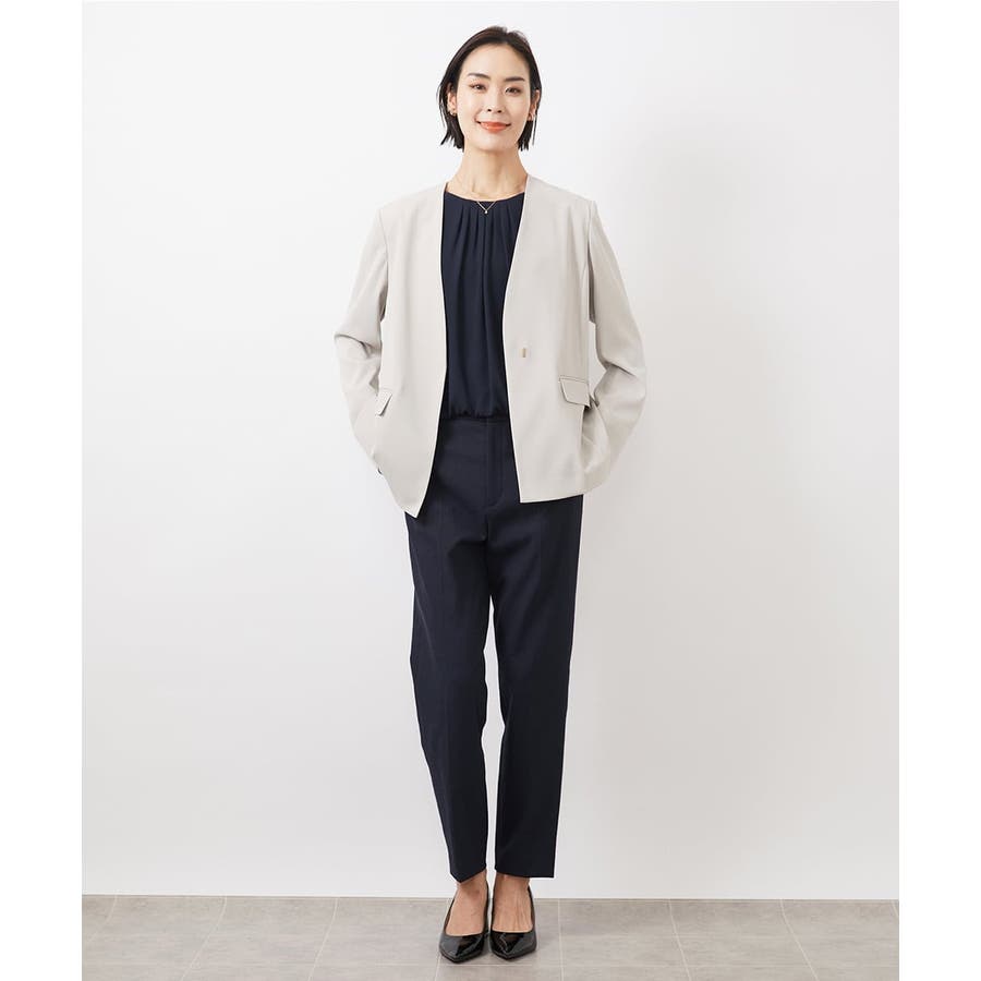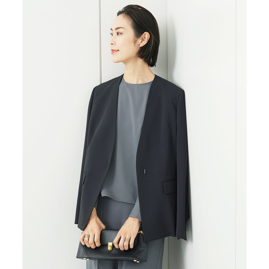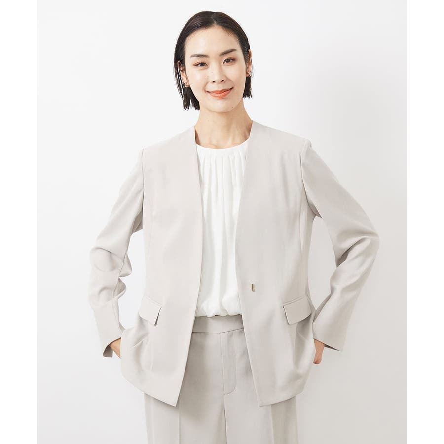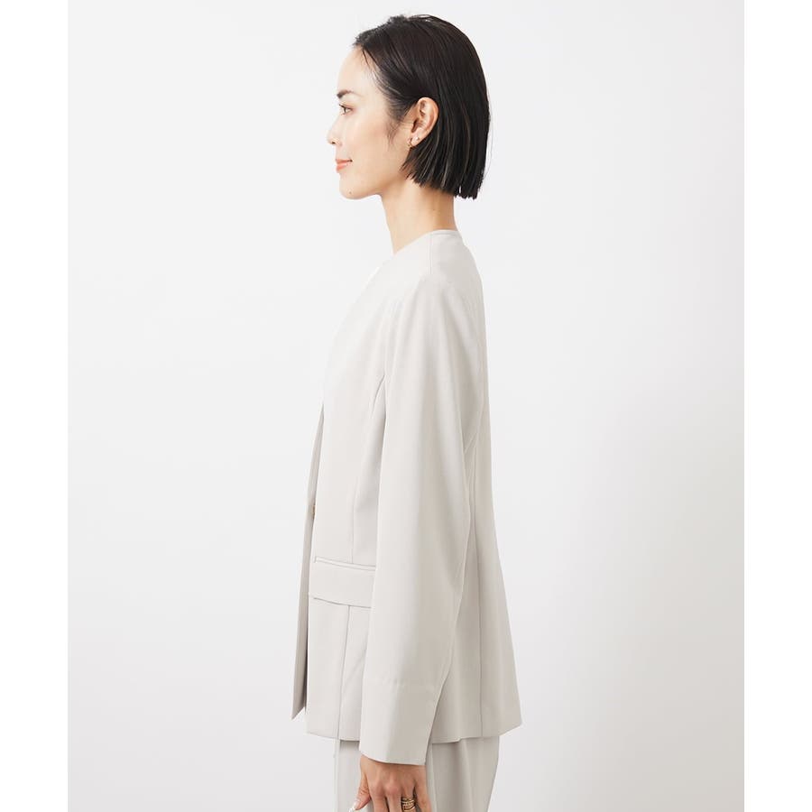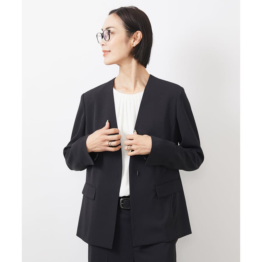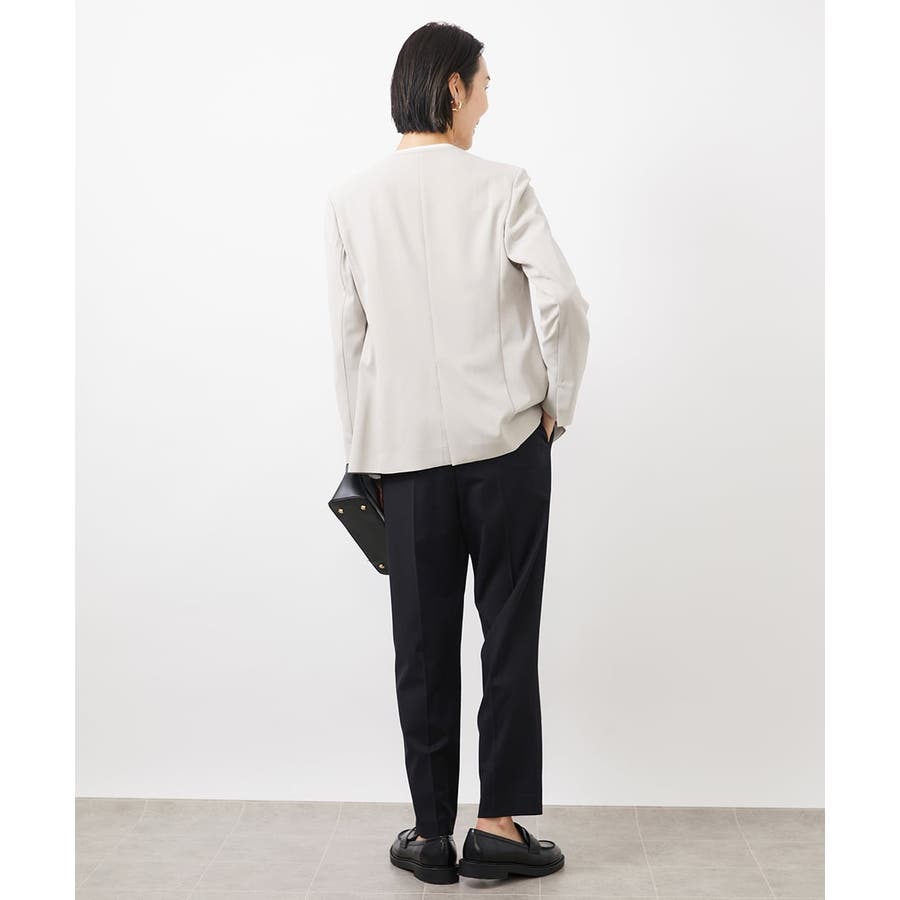 すっきりしたノーカラーのジャケット。スタイルが良く見えるように少しだけウエストを沿わせたシルエットがスタイルアップ効果を与えてくれます。裏なしで軽く、着用時期も長く見込める点もポイントです。40サイズは限定店舗展開です。