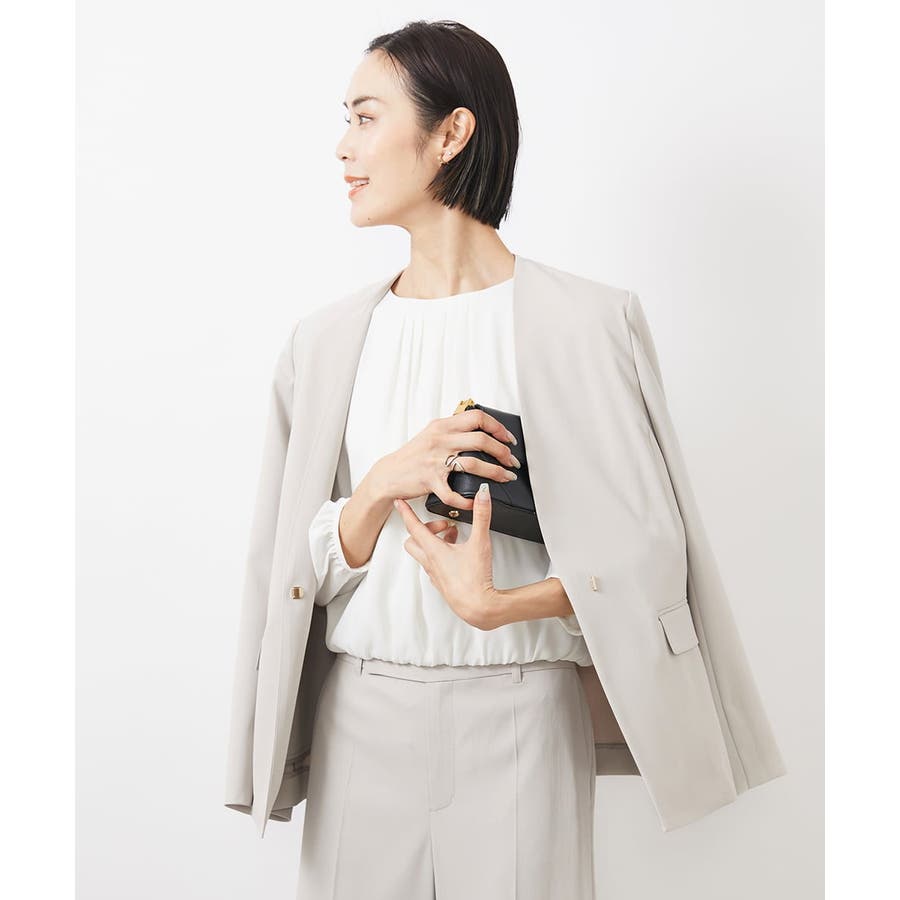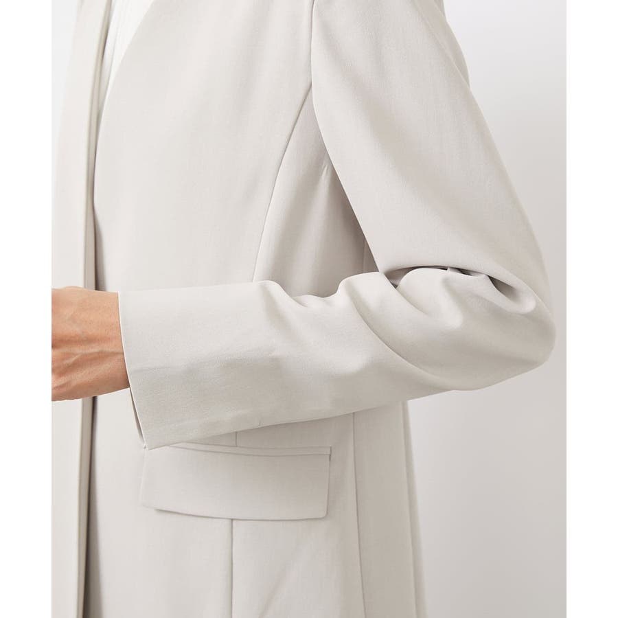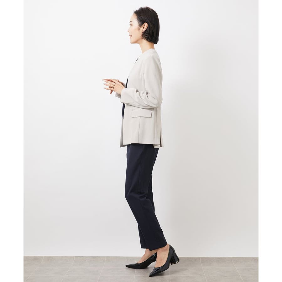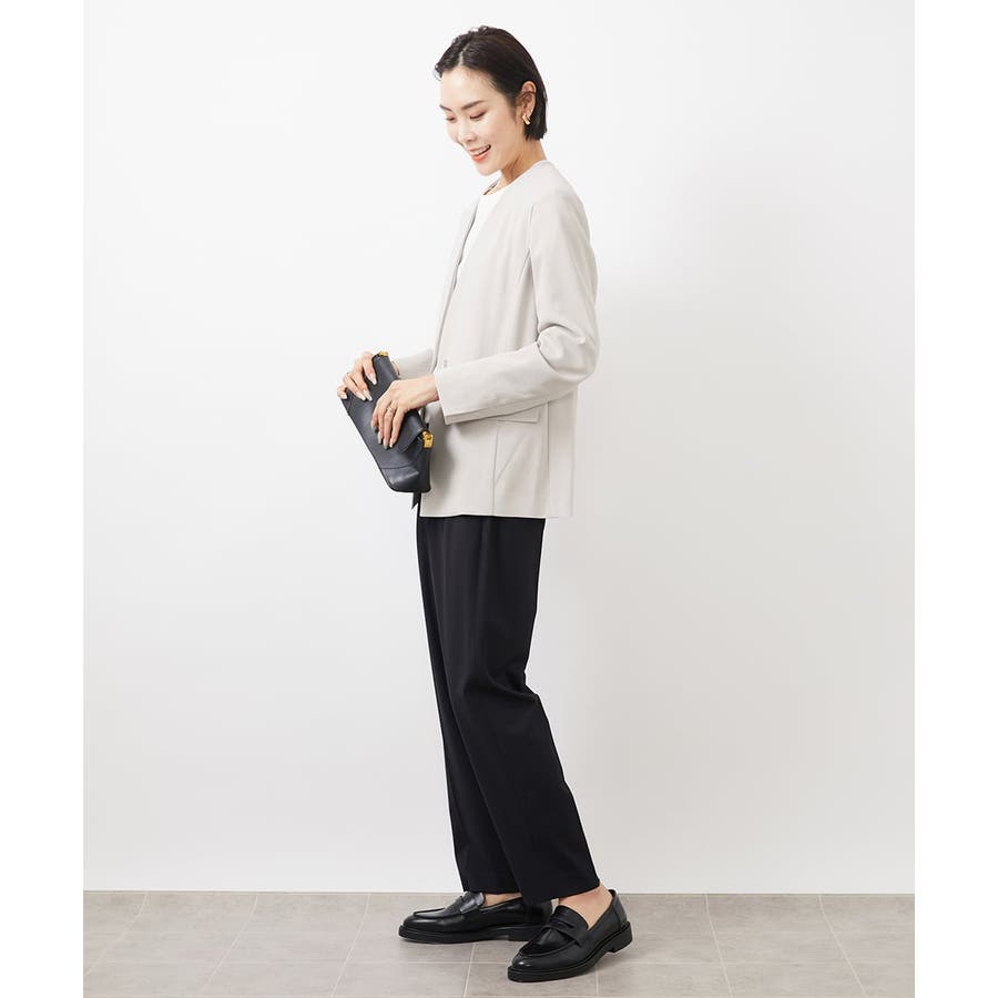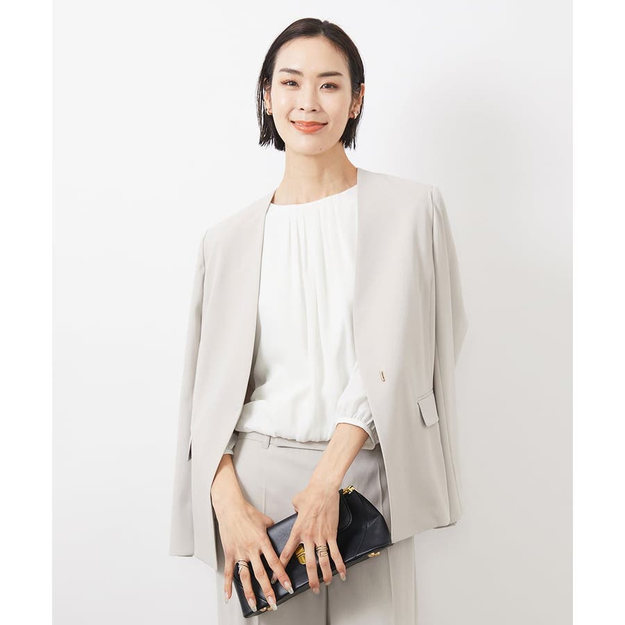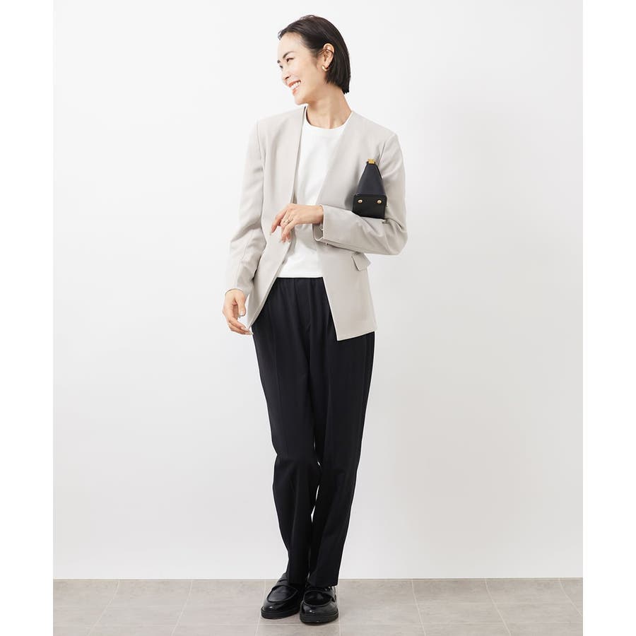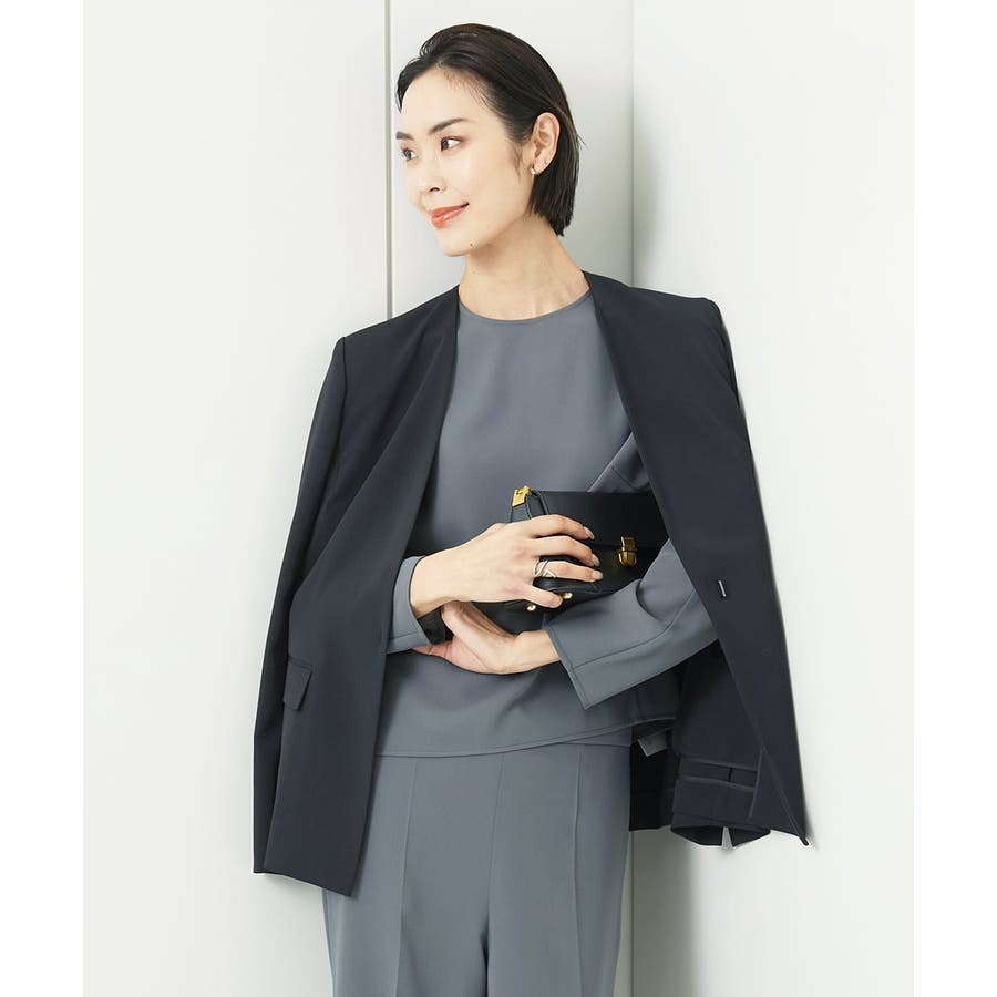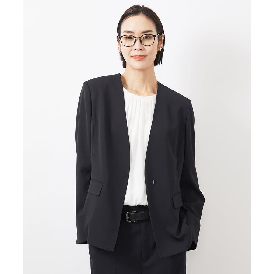 すっきりしたノーカラーのジャケット。スタイルが良く見えるように少しだけウエストを沿わせたシルエットがスタイルアップ効果を与えてくれます。裏なしで軽く、着用時期も長く見込める点もポイントです。40サイズは限定店舗展開です。
