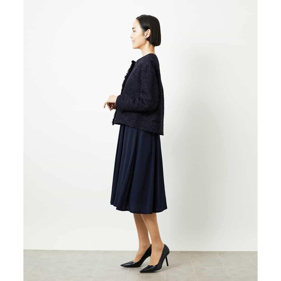 同素材のスカートと合わせたセットアップスタイルがおすすめです。ワンピースの上に羽織ればフォーマルシーンにぴったり。デニムなどと合わせて、きれいめカジュアルに着こなすのも◎。オン・オフ兼用で幅広く着まわせます。