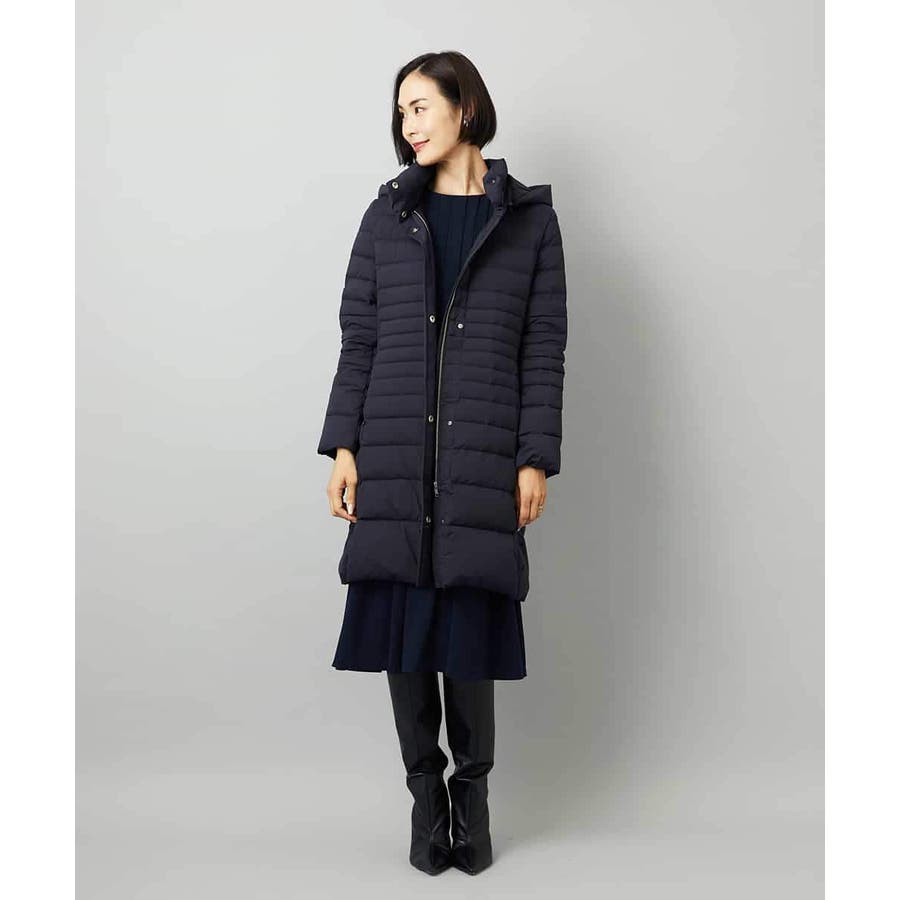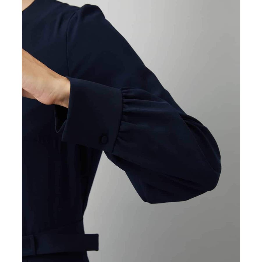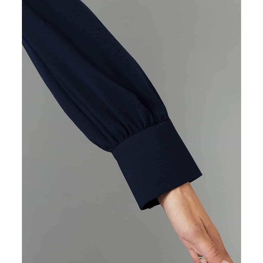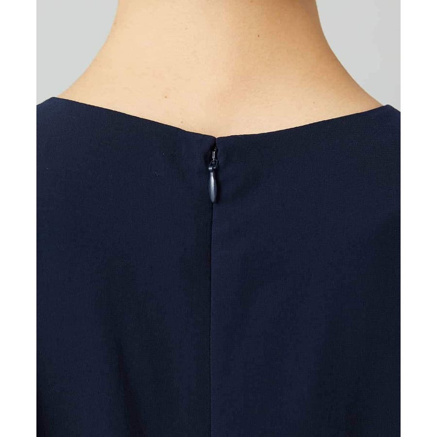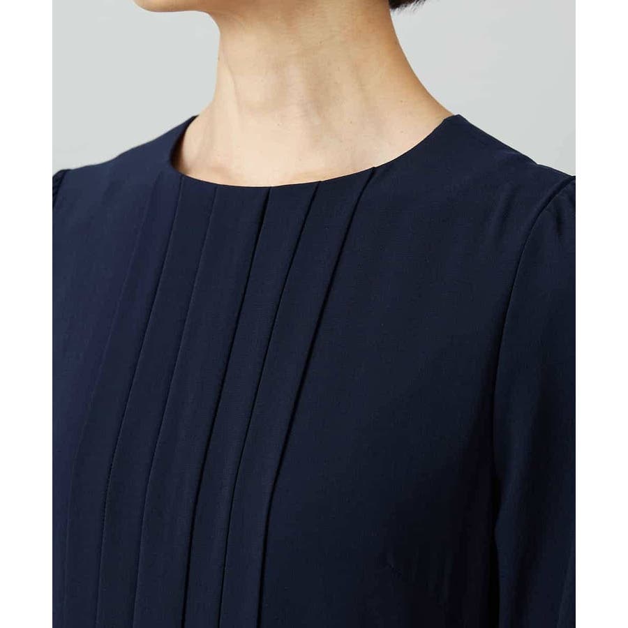 1枚で着てもシンプルになりすぎず、上品な華やかさを演出します。胸元のプリーツが立体感を添え、ストレッチシフォンの透け感を抑さえつつ、ウエストベルトでメリハリのあるシルエットに仕上げました。40サイズは限定店舗展開です。
