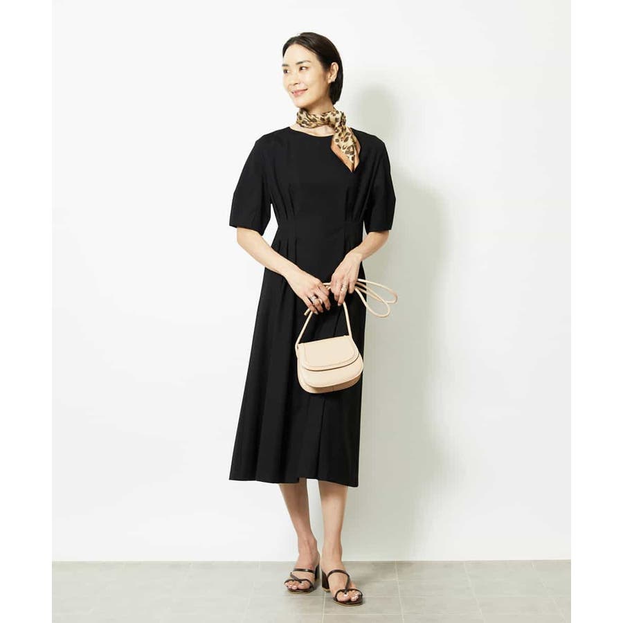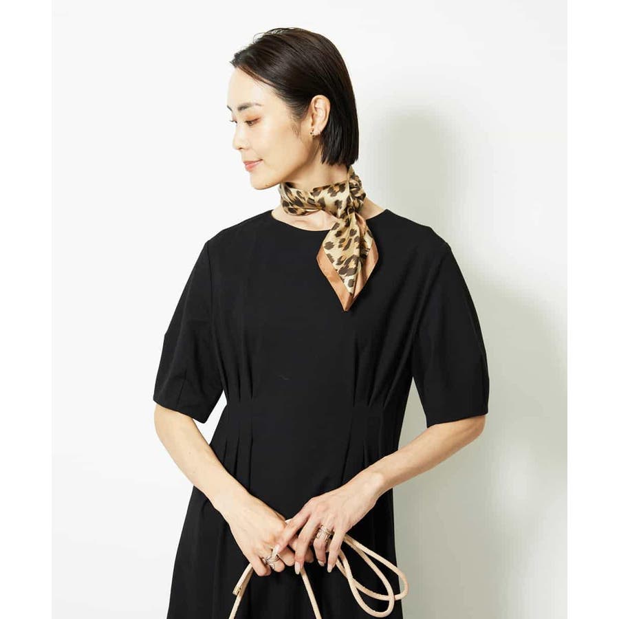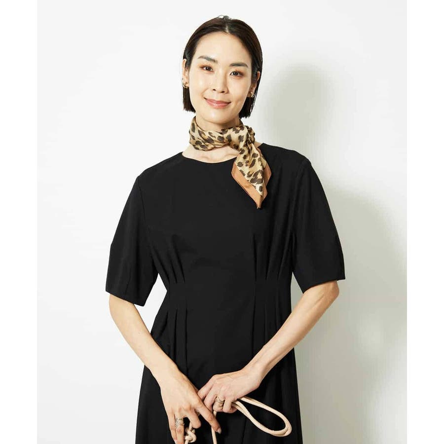 シンプルなジャージーワンピースに、首元スカーフを添えるだけで、一気に華やかさとこなれ感がアップします。