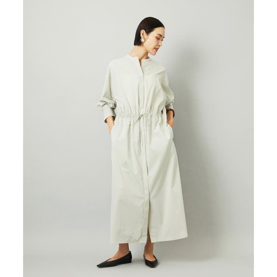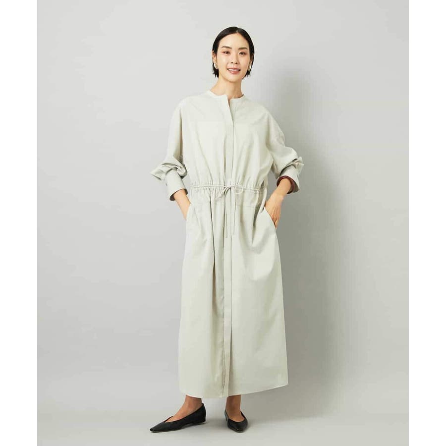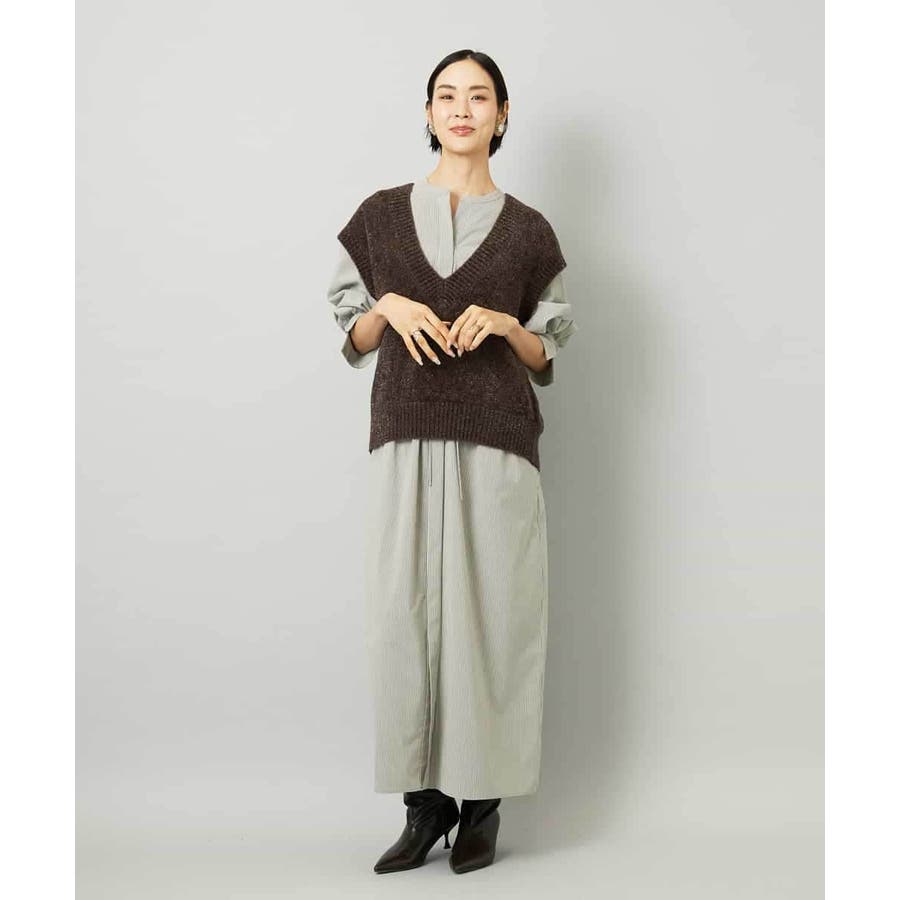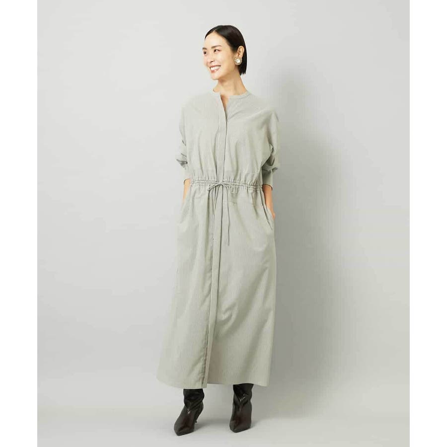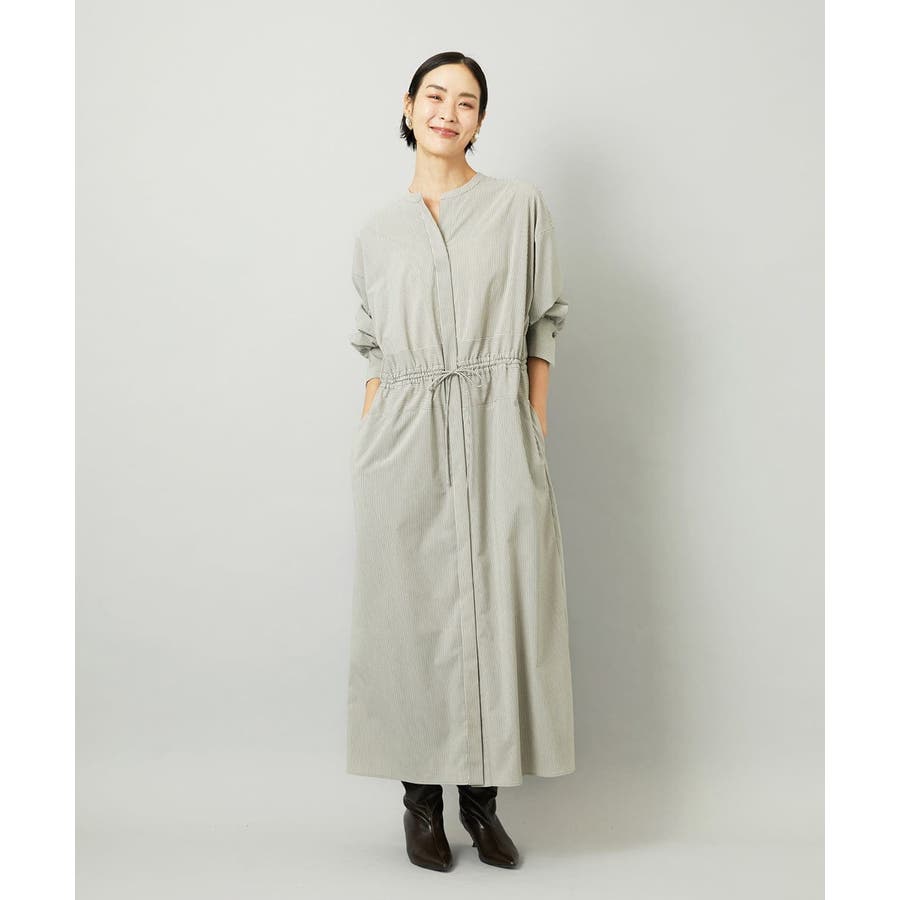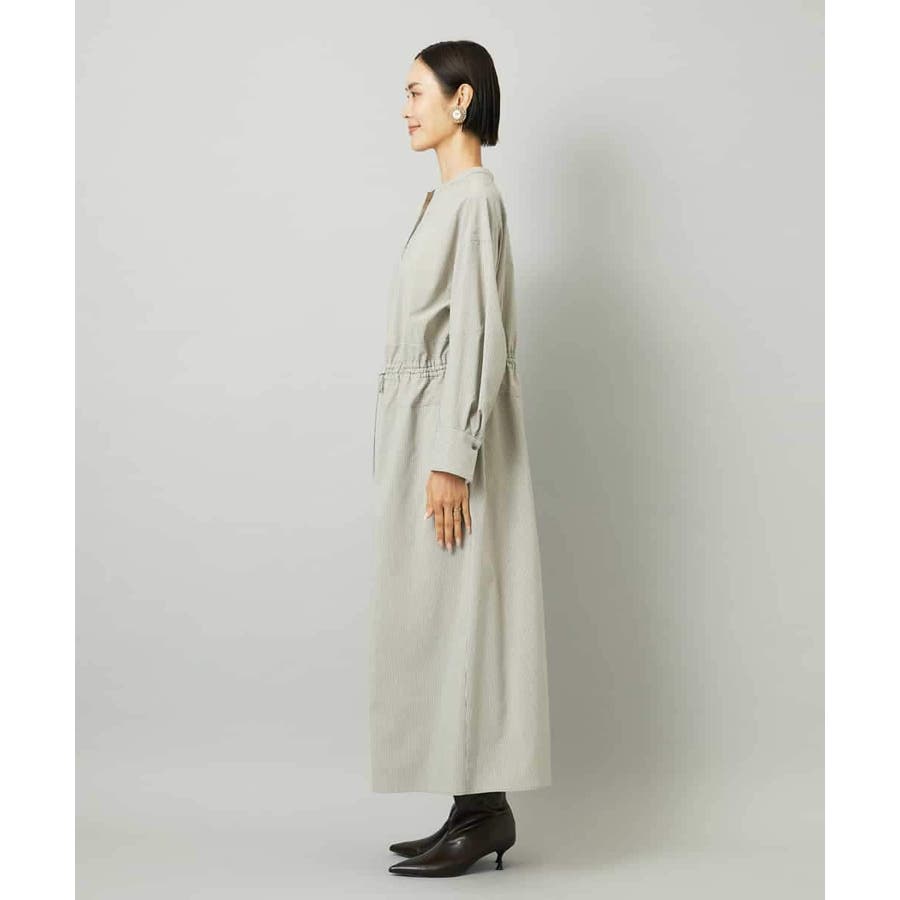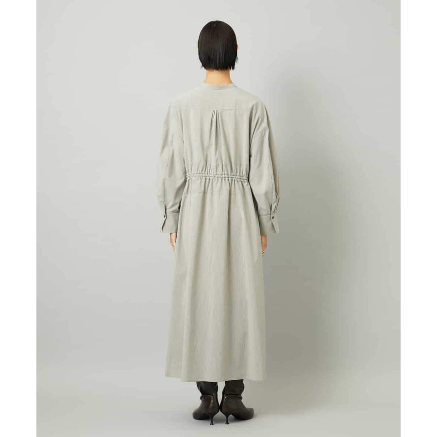 オーバーサイズシルエットのシャツワンピース。パーツごとに柄の向きを変えることで、ウエストの切り替えが立体感を演出します。ドローストリングでシルエットの調整も可能。衿ボタンを外して袖をラフにまくり、ニットジレに合わせれば抜け感のある着こなしに。さらに季節が進めばタートルインナーを重ねられるなど、レイヤードのしやすさから長く活躍する一着です。