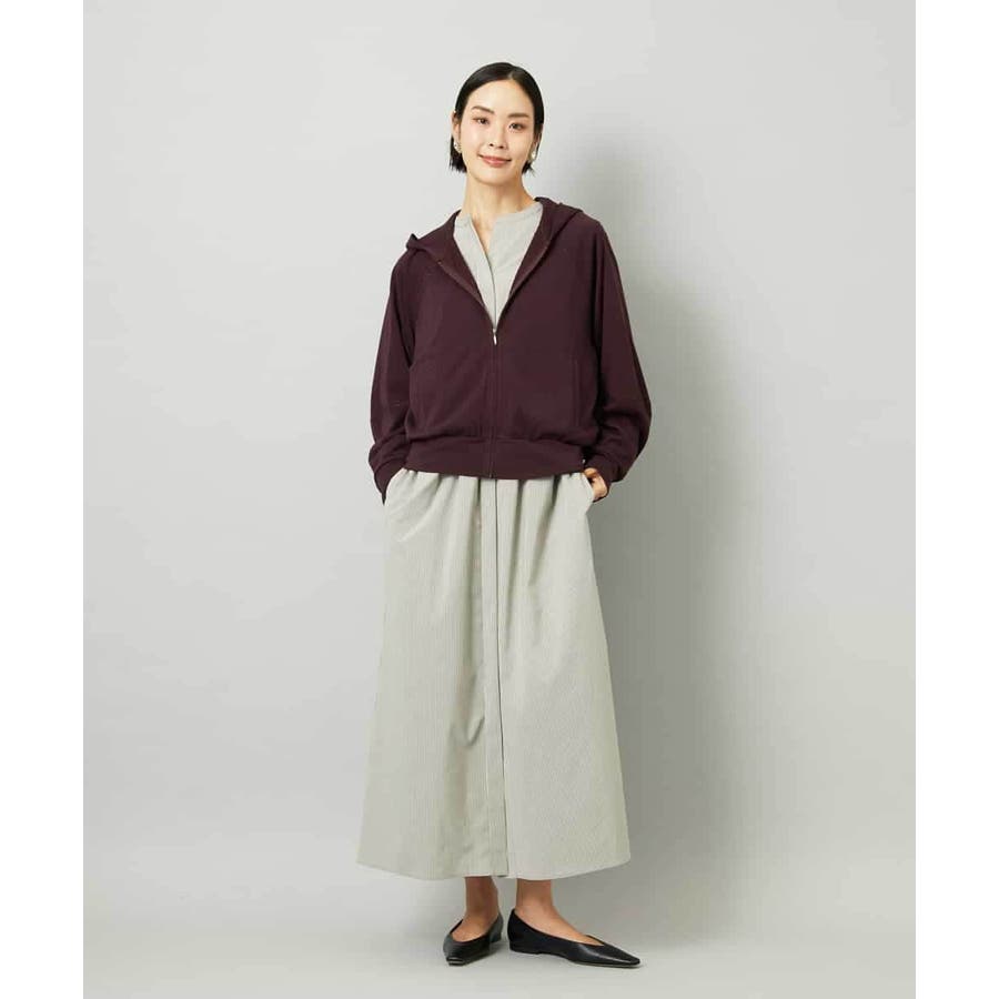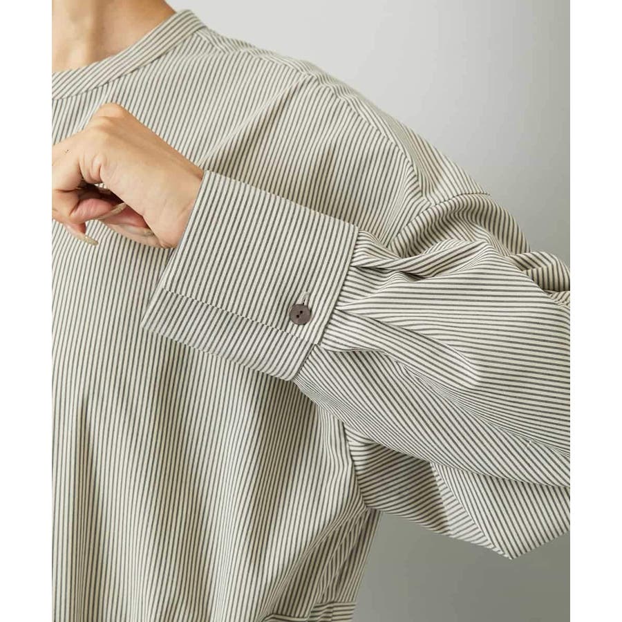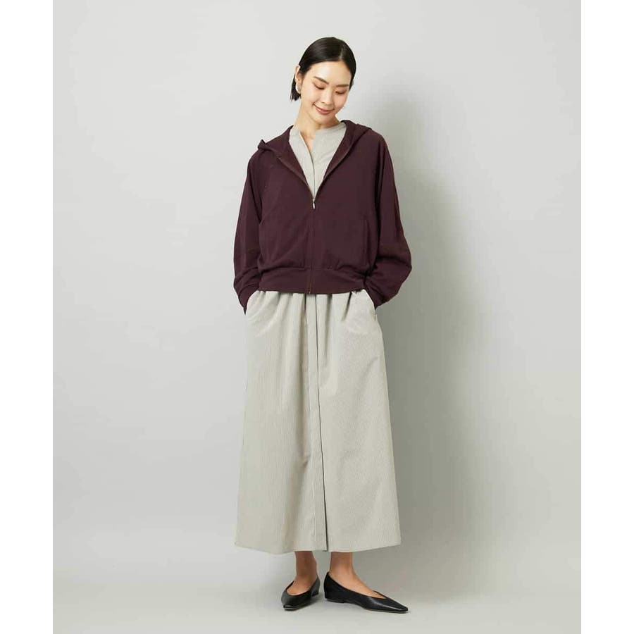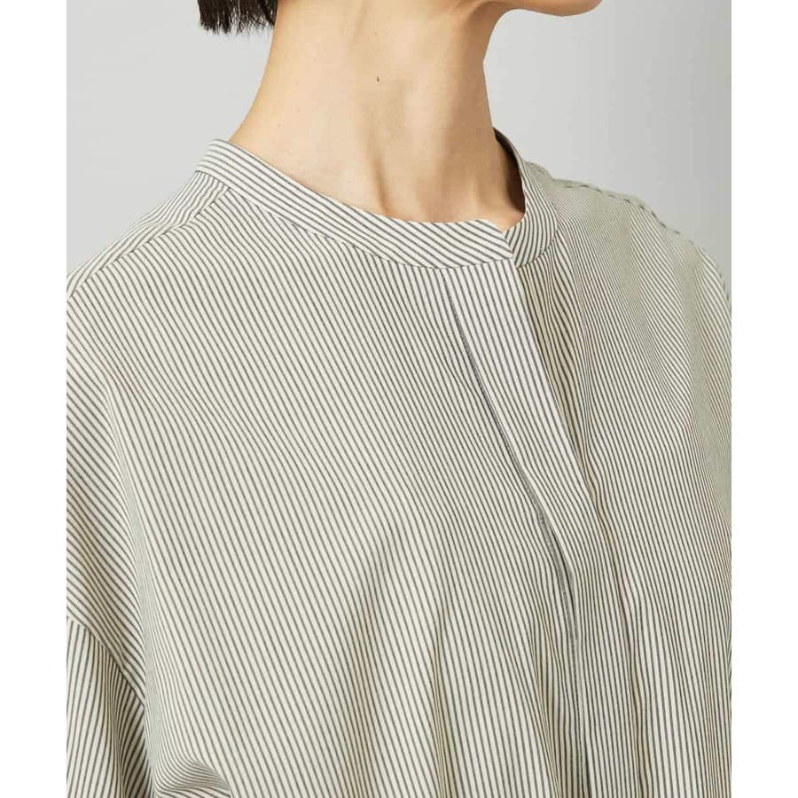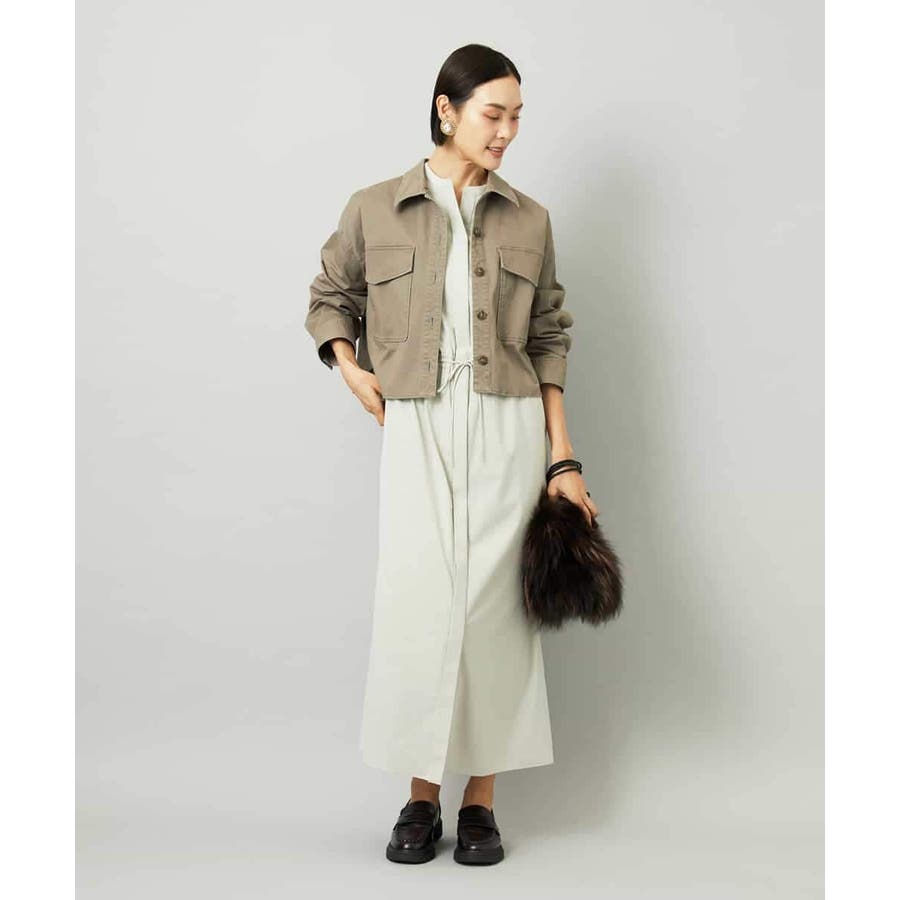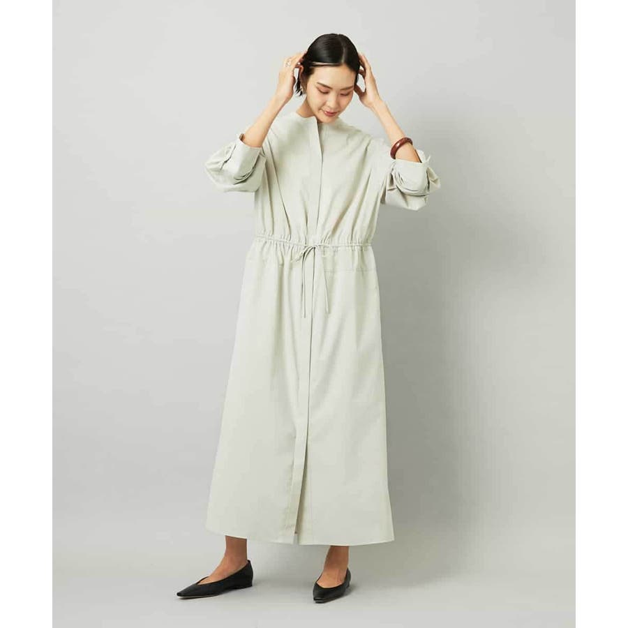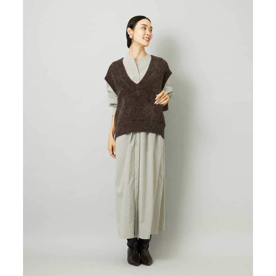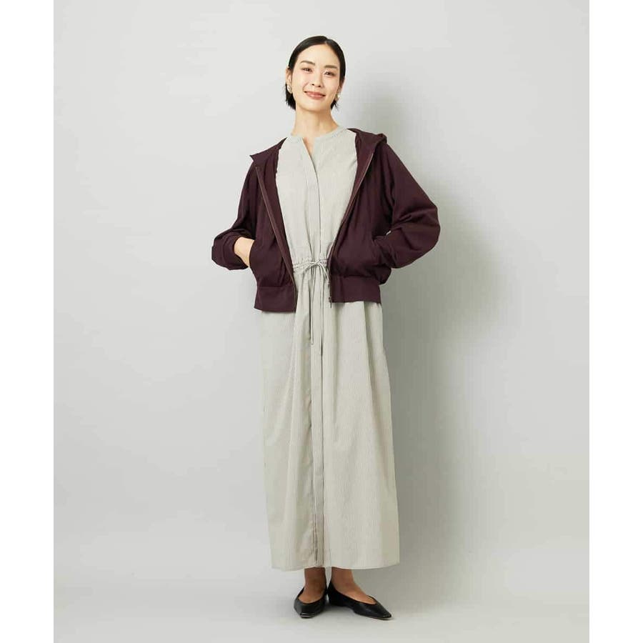 オーバーサイズシルエットのシャツワンピース。パーツごとに柄の向きを変えることで、ウエストの切り替えが立体感を演出します。ドローストリングでシルエットの調整も可能。衿ボタンを外して袖をラフにまくり、ニットジレに合わせれば抜け感のある着こなしに。さらに季節が進めばタートルインナーを重ねられるなど、レイヤードのしやすさから長く活躍する一着です。