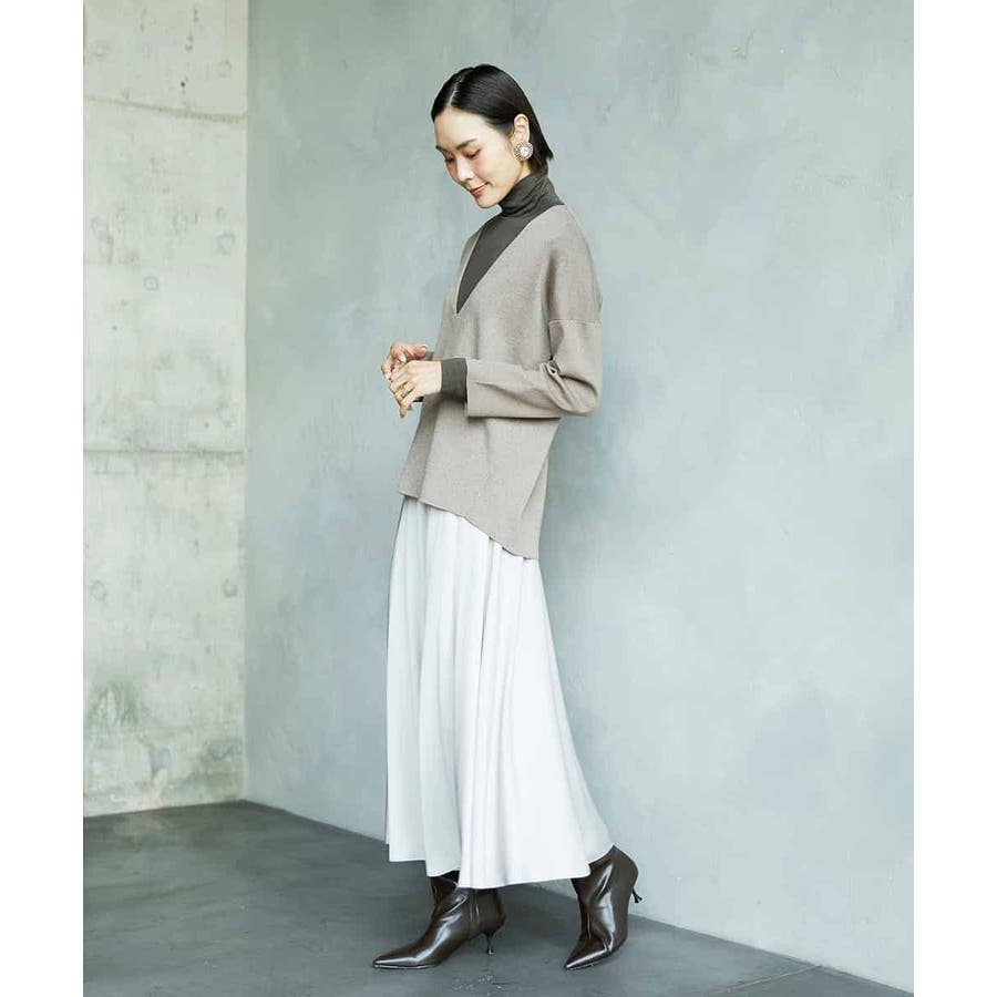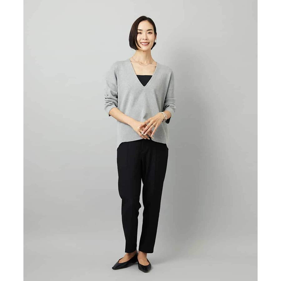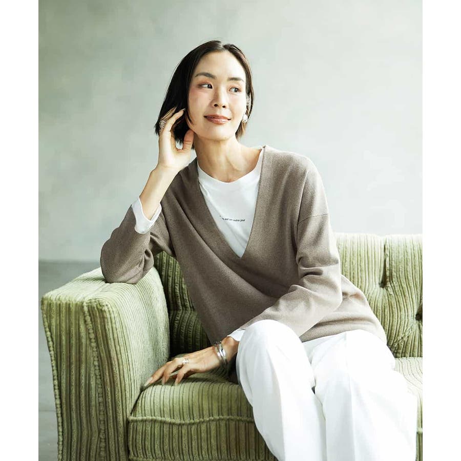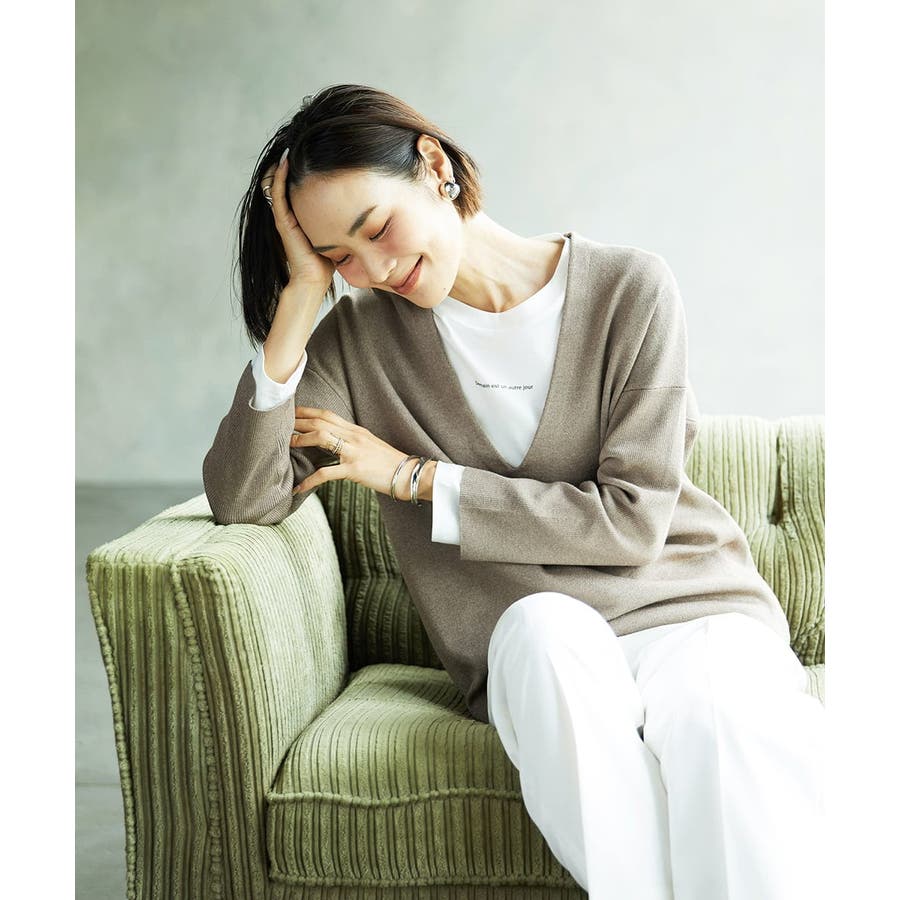 深Vの襟元を活かして、キャミソールやシャツ、ハイネックなど、様々なインナーとのレイヤードコーデが楽しめます。レディーライクなサテンスカートやデニムなどカジュアルなアイテムとあわせても大人の抜け感のあるコーデでおすすめです。