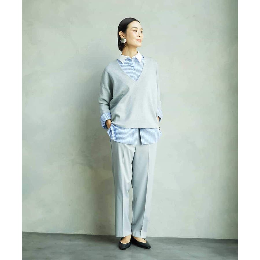 上品でさりげない光沢のある糸を使用し、ほどよいハリと落ち感を備えた素材。きれいめながらも普段のスタイリングに取り入れやすい素材感です。