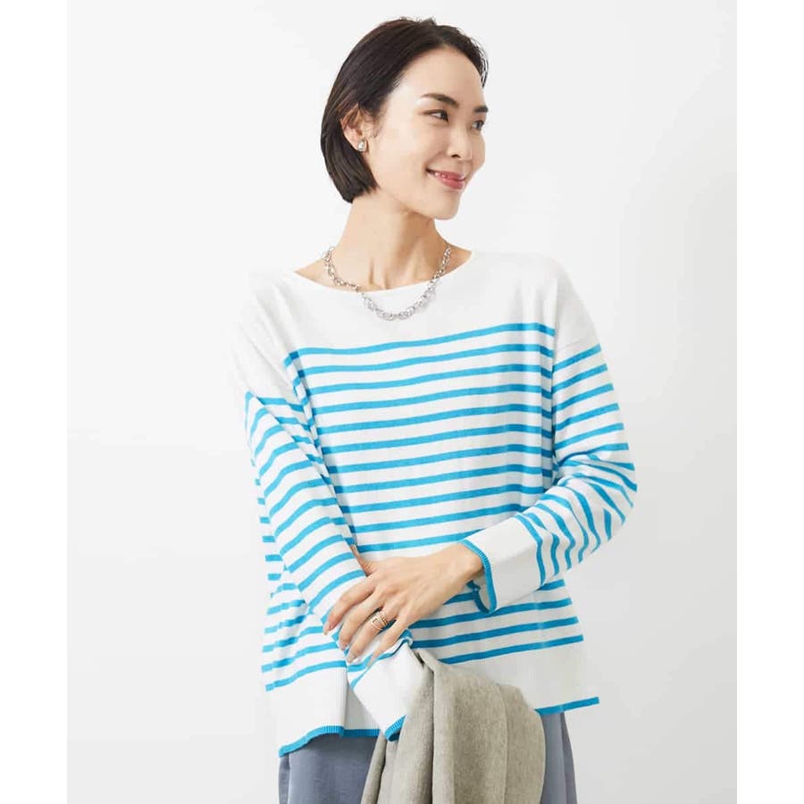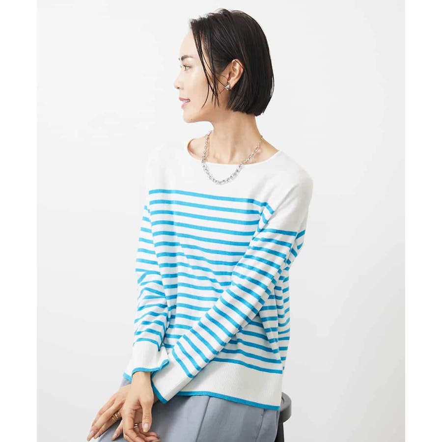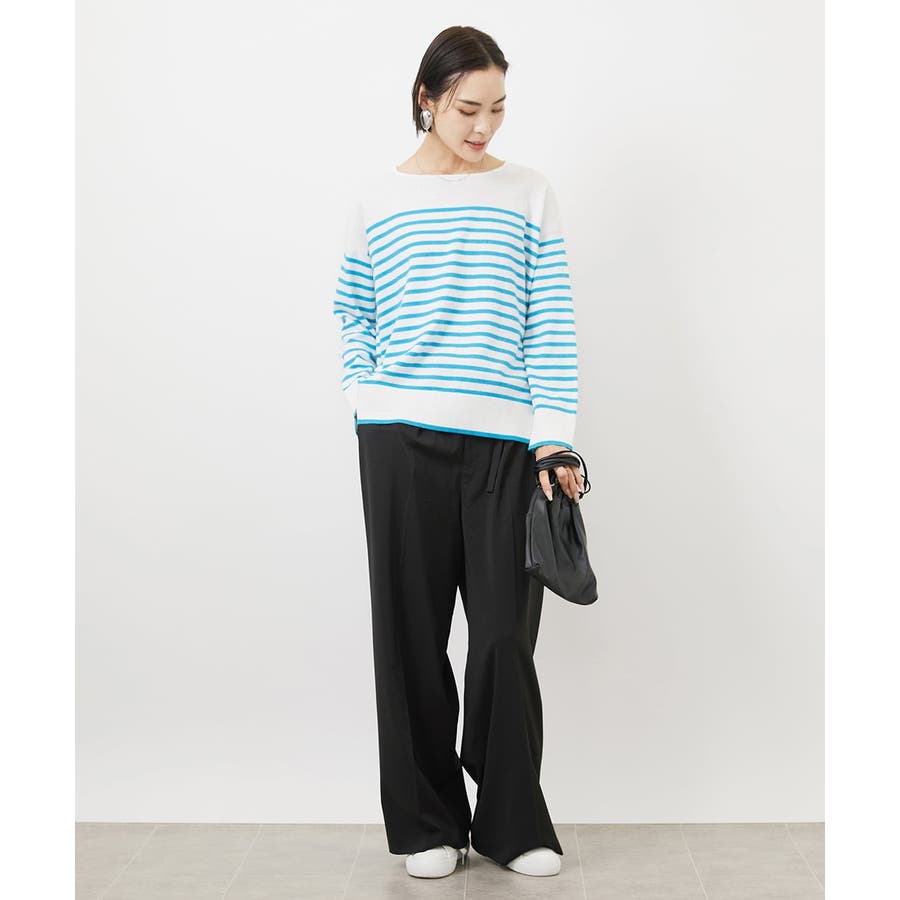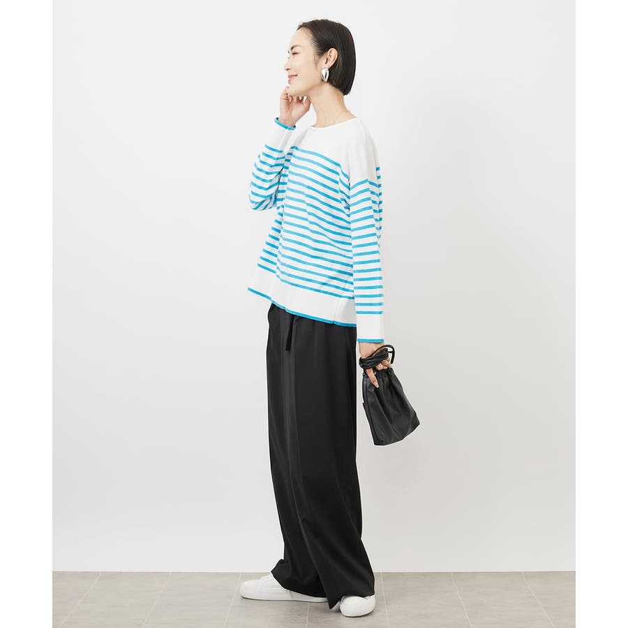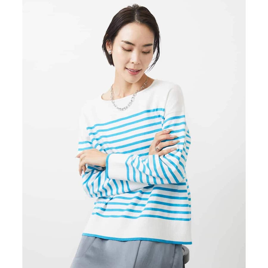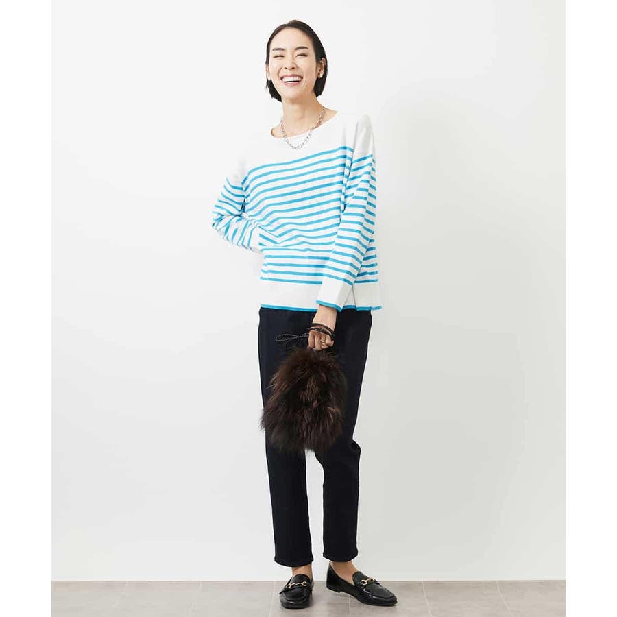 明るめのカラーボーダーはシンプルなスタイリングにプラスするだけでおしゃれ度をあげてくれる1枚。パンツにもスカートにも合わせやすくオフィスから普段使いまで幅広く活躍します。