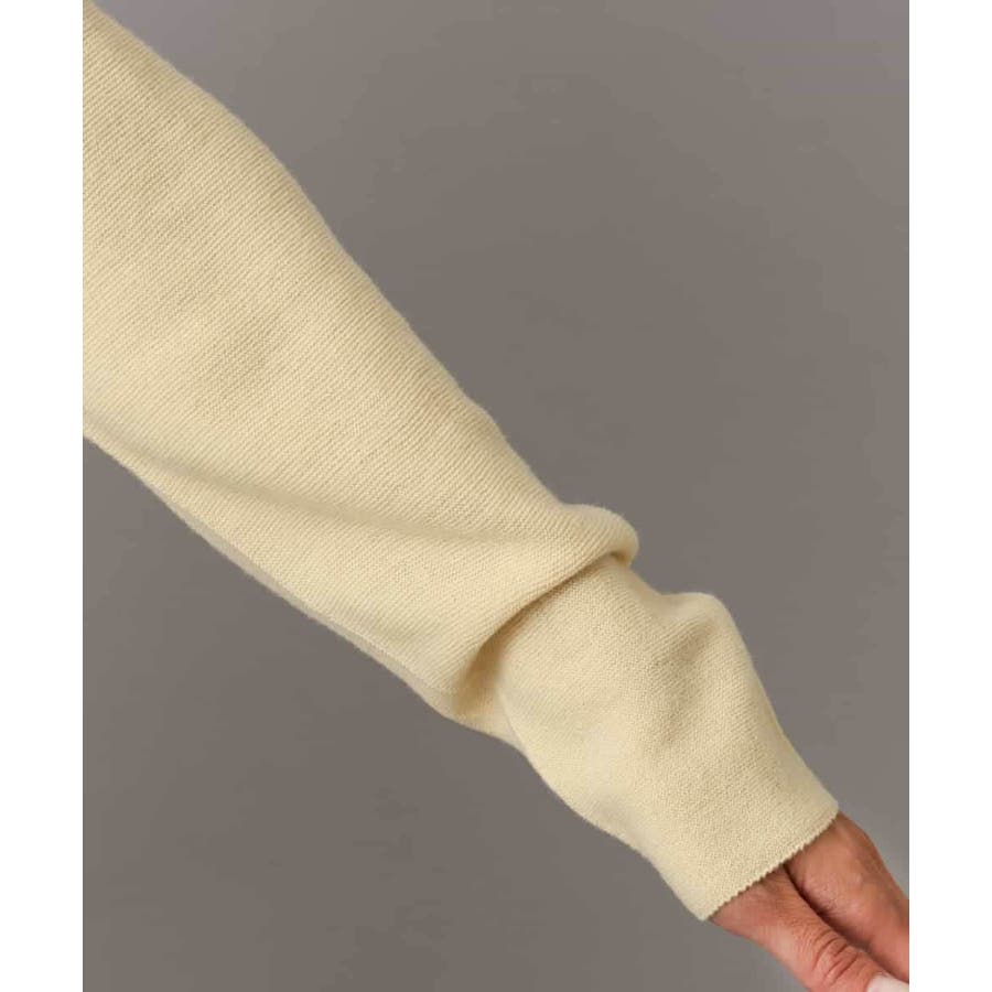 ウール100%の2種類の糸を引きそろえて編み上げたニット素材。杢調のTOP糸とソリッドな無地糸を組み合わせることで、上品で自然なMIX感のある表情を生み出しています。軽やかさと温かみを兼ね備え、季節感を楽しめる一枚です。