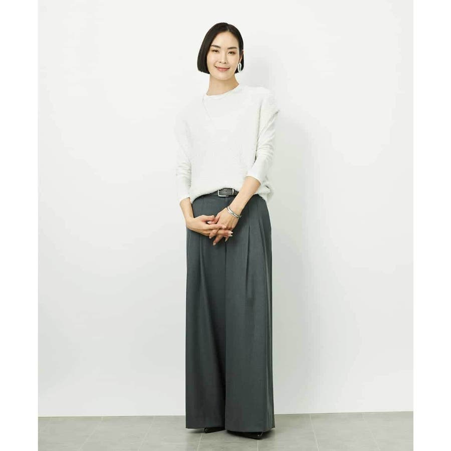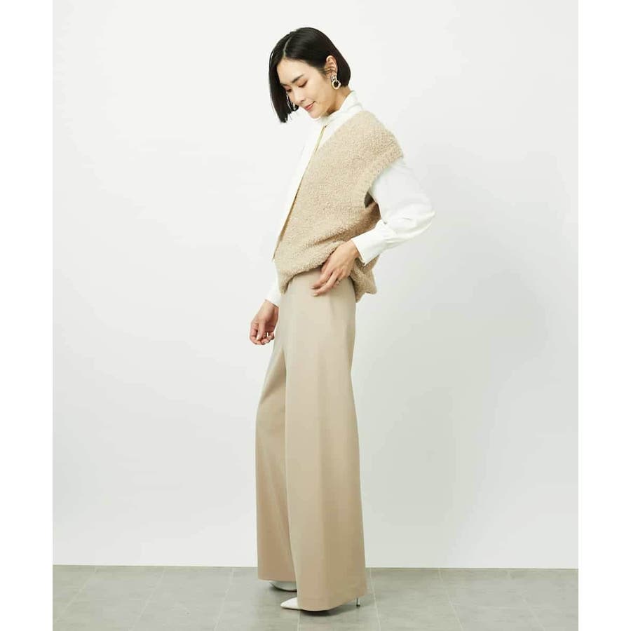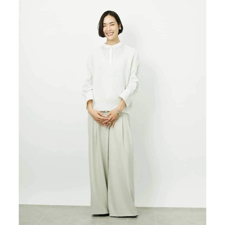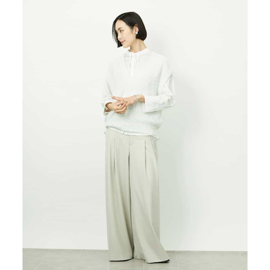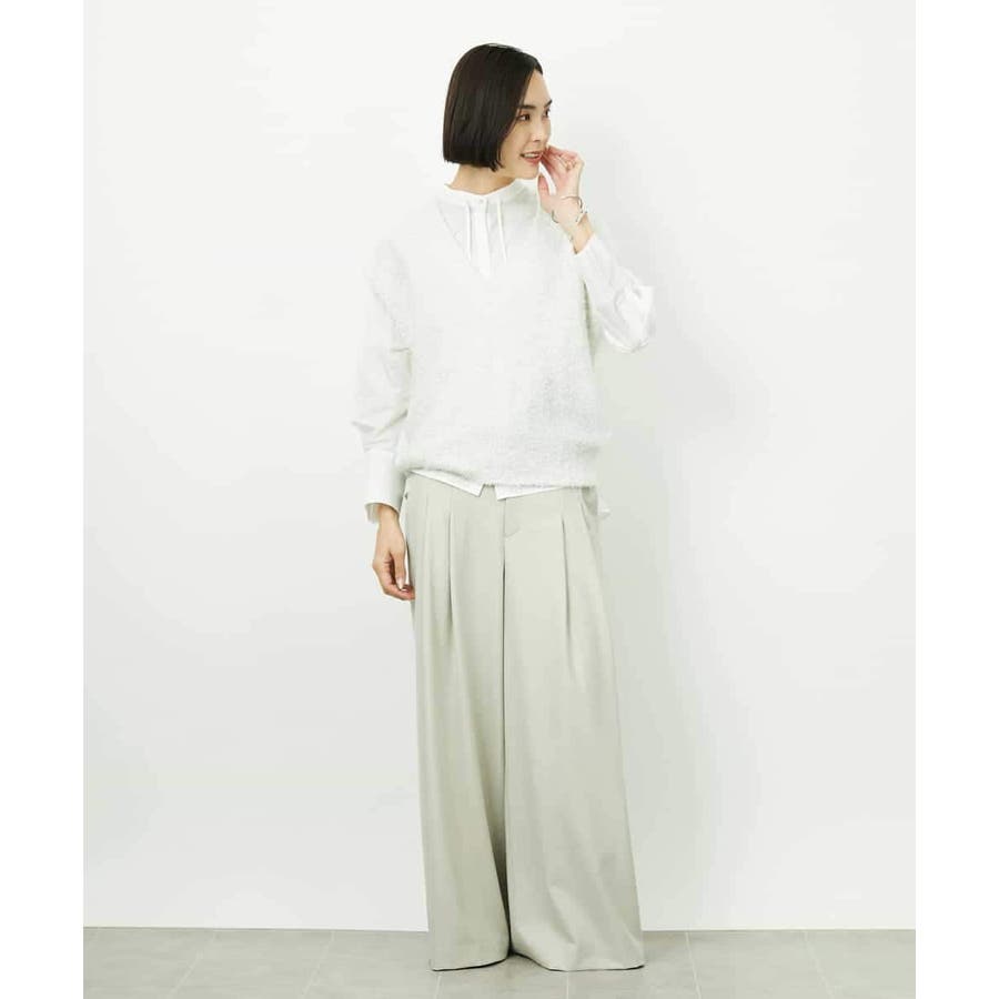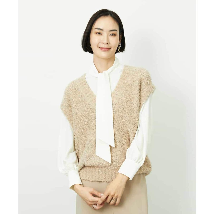 深めのVネックがすっきりとした印象を与え、ボウタイブラウスと合わせればエレガントに、シンプルなシアーのロンTとレイヤードしてデニムパンツと合わせれば程よくカジュアルダウンした着こなしも楽しめます。