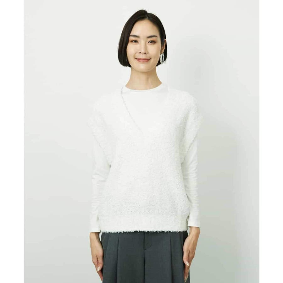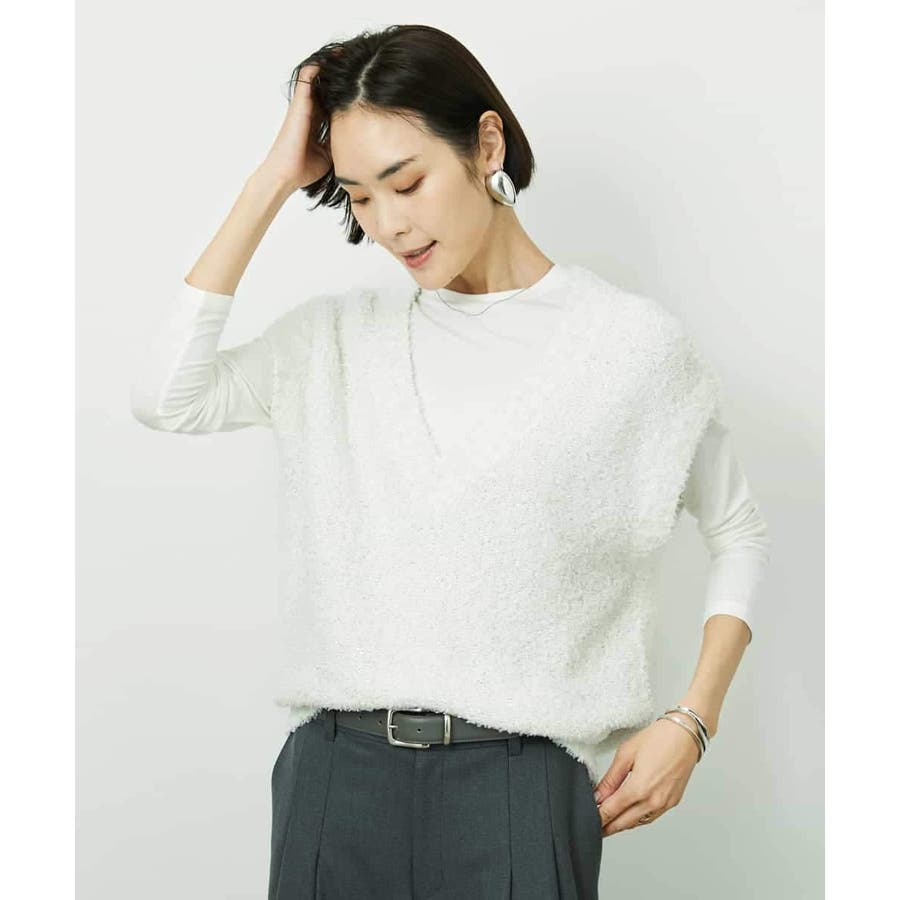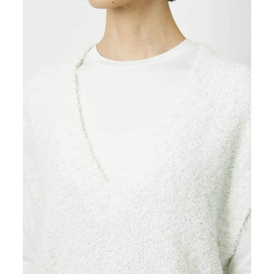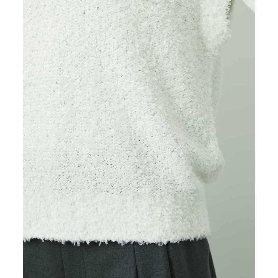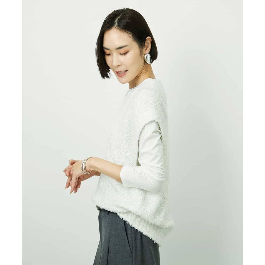 スパンコールがきらめく、ファンシーツイードのような表情が魅力のニットベスト。合わせるインナーやボトム次第で、さまざまな表情を演出でき、コーデのアクセントになる一枚です。