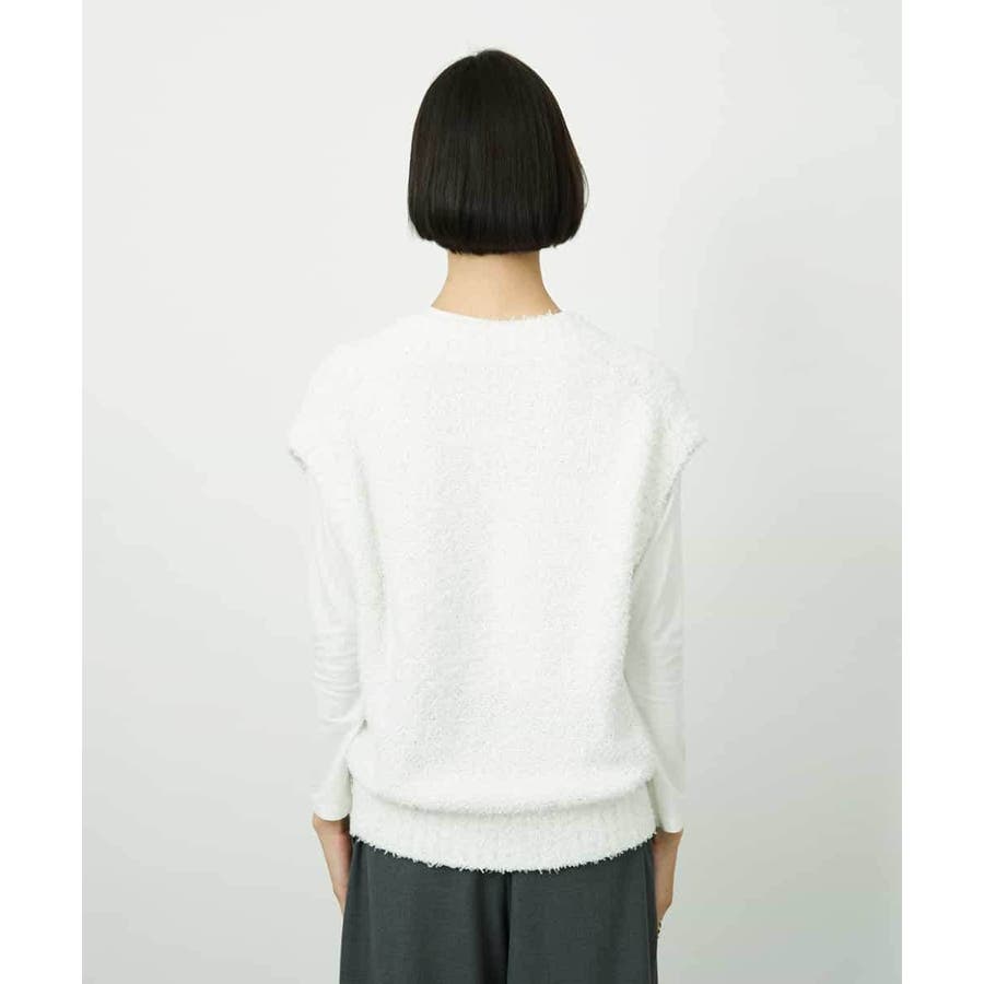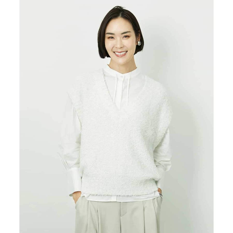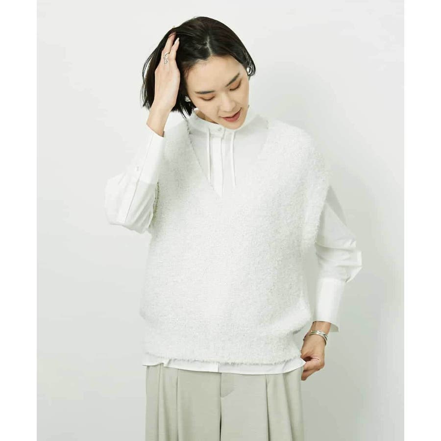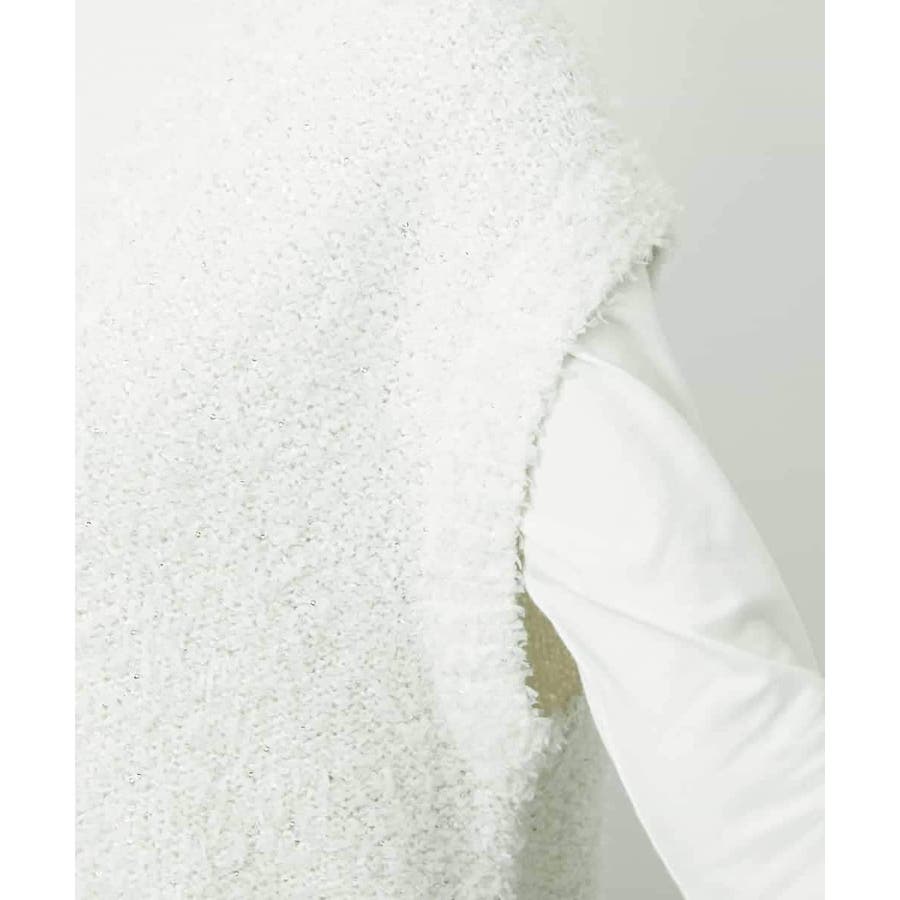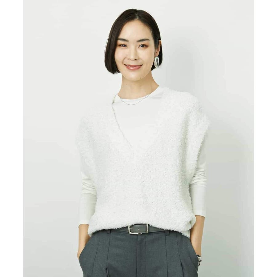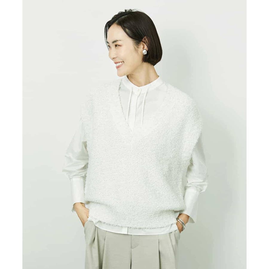 スパンコールがきらめく、ファンシーツイードのような表情が魅力のニットベスト。合わせるインナーやボトム次第で、さまざまな表情を演出でき、コーデのアクセントになる一枚です。