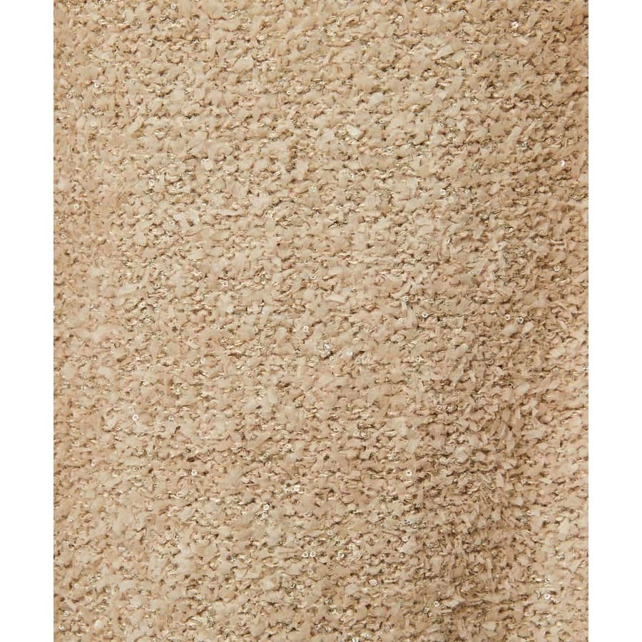 テープ状のナイロンの糸とスパンコールの糸を引き揃えた素材にスパンコールを加えて織りこんだファンシーツィードライクな上品な編地です。