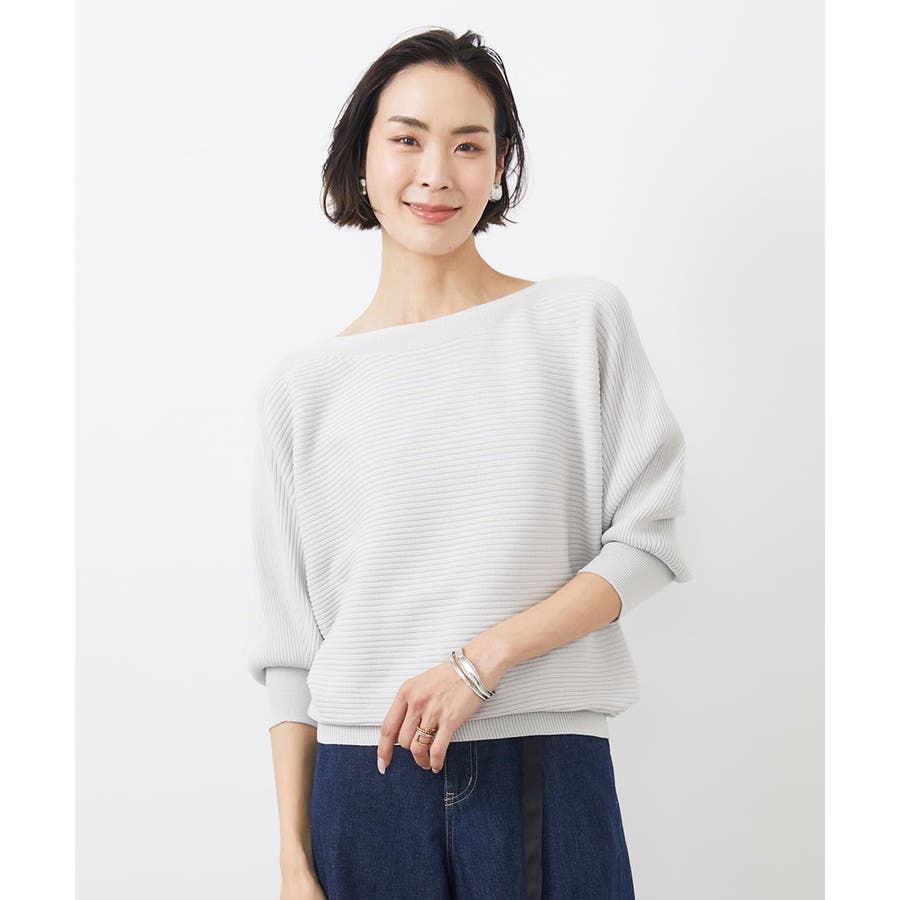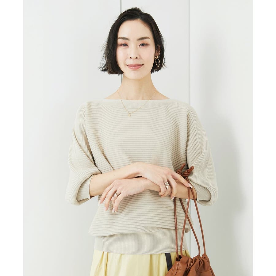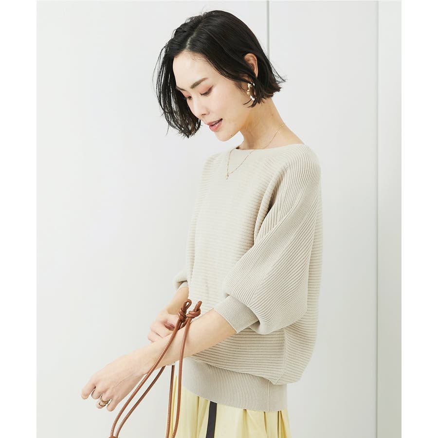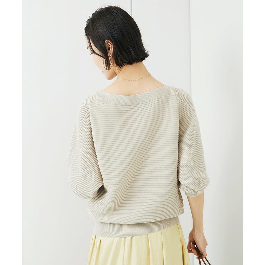シンプルなリブデザインでコーディネートに取り入れやすく、 ボートネックの開きで抜け感が出て首や顔周りをスッキリと二の腕も気にならずに。
