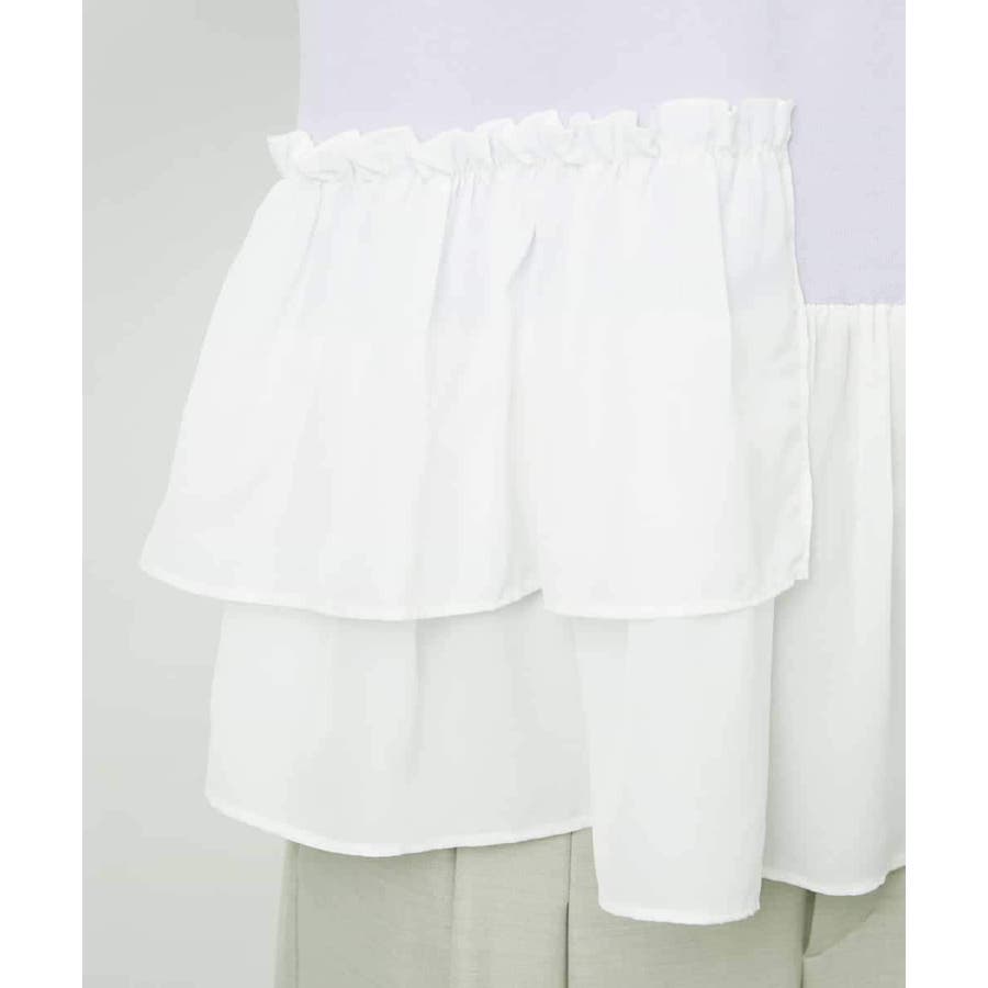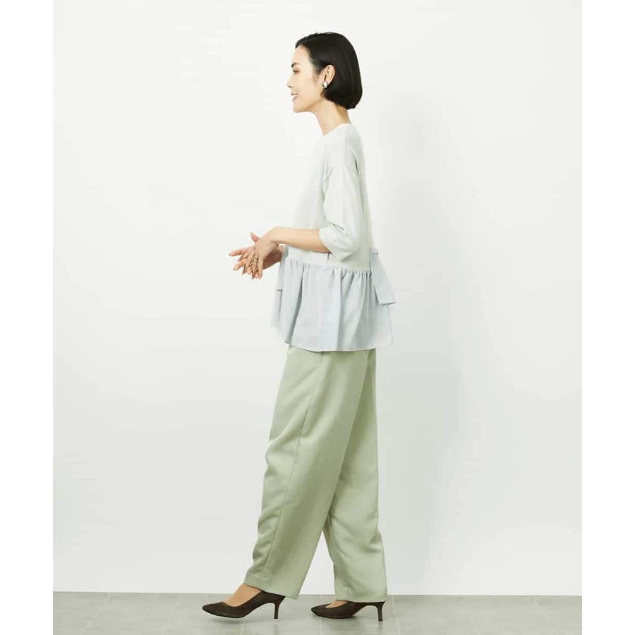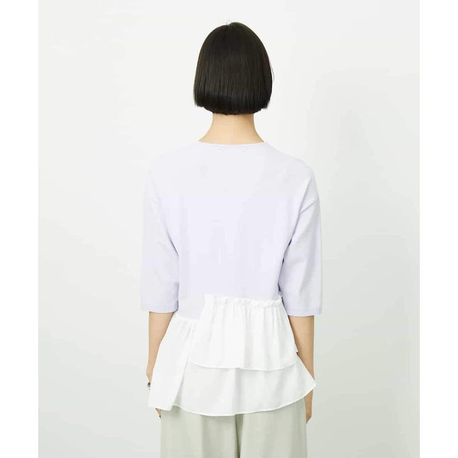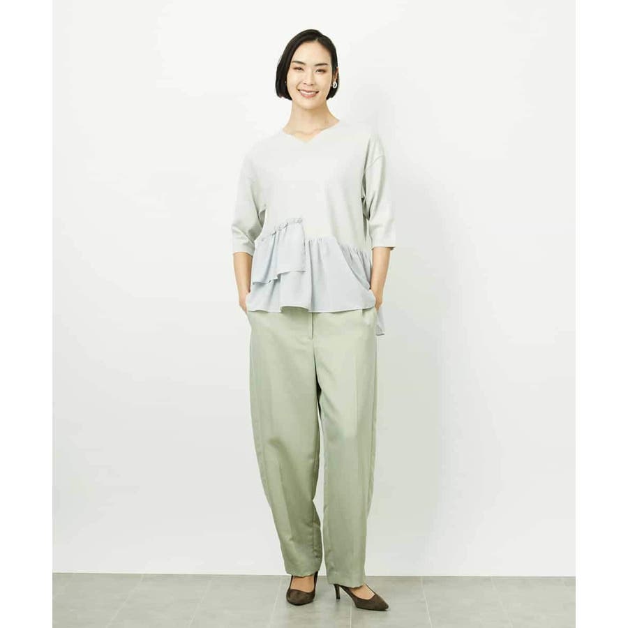 ニット部分には、透け感のないレーヨン・ポリエステル素材を使用し、しなやかな風合いと高いストレッチ性で快適な着心地に仕上げました。 フリル部分は、イージーケアなポリエステルデシンの別布で切り替え、軽やかな表情をプラスしています。