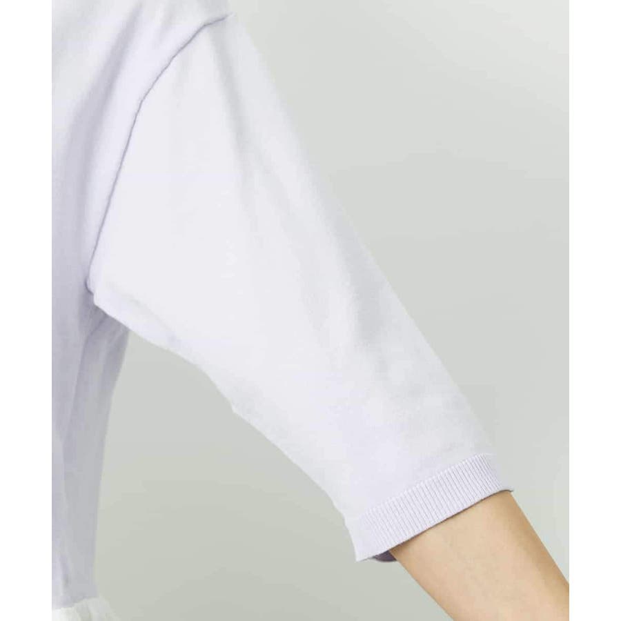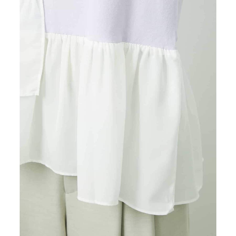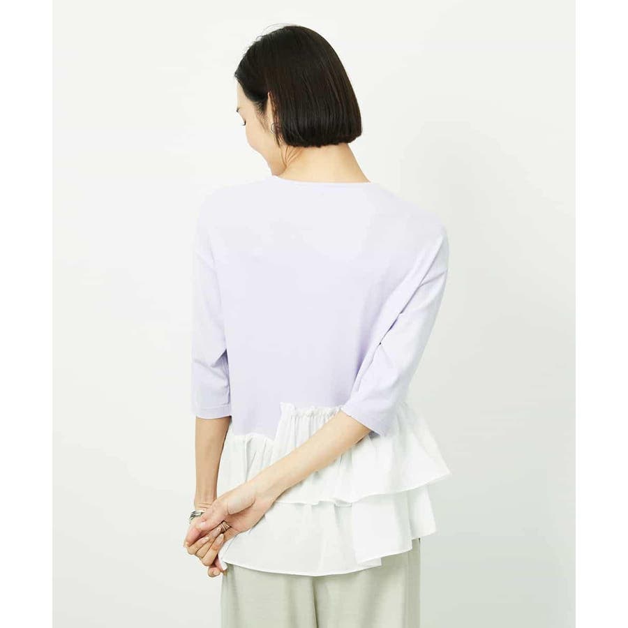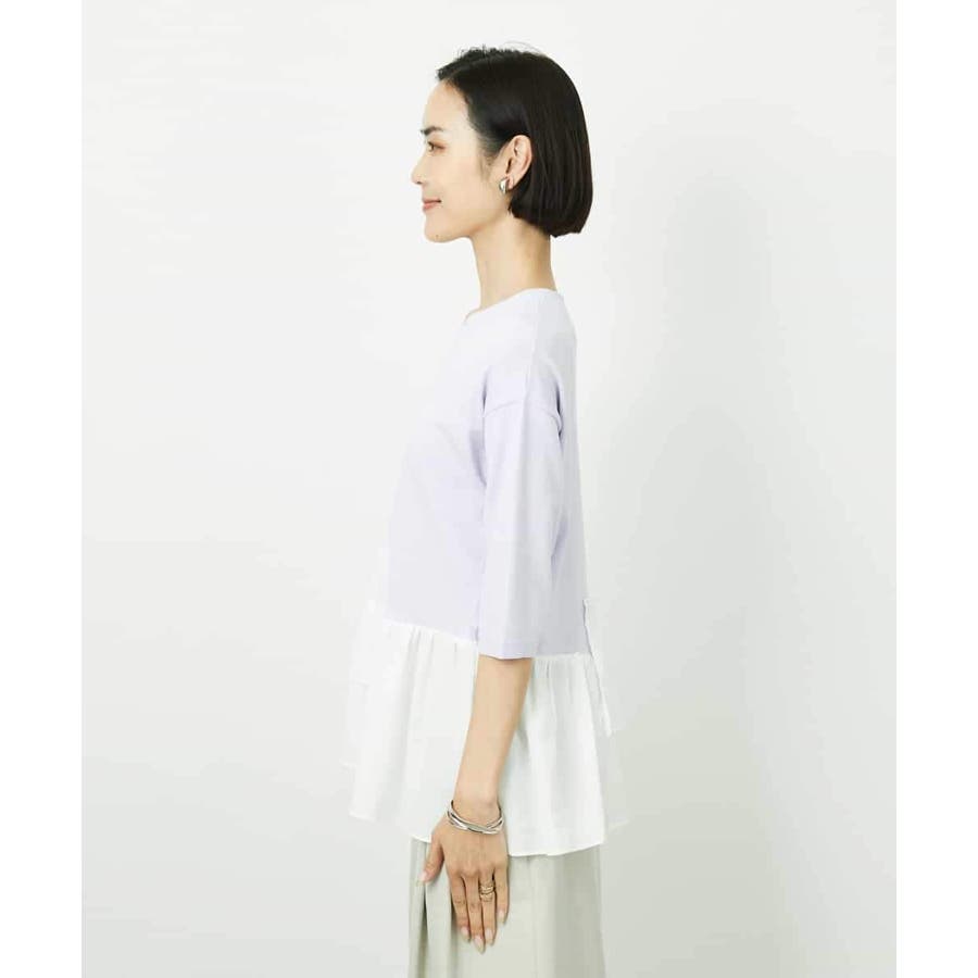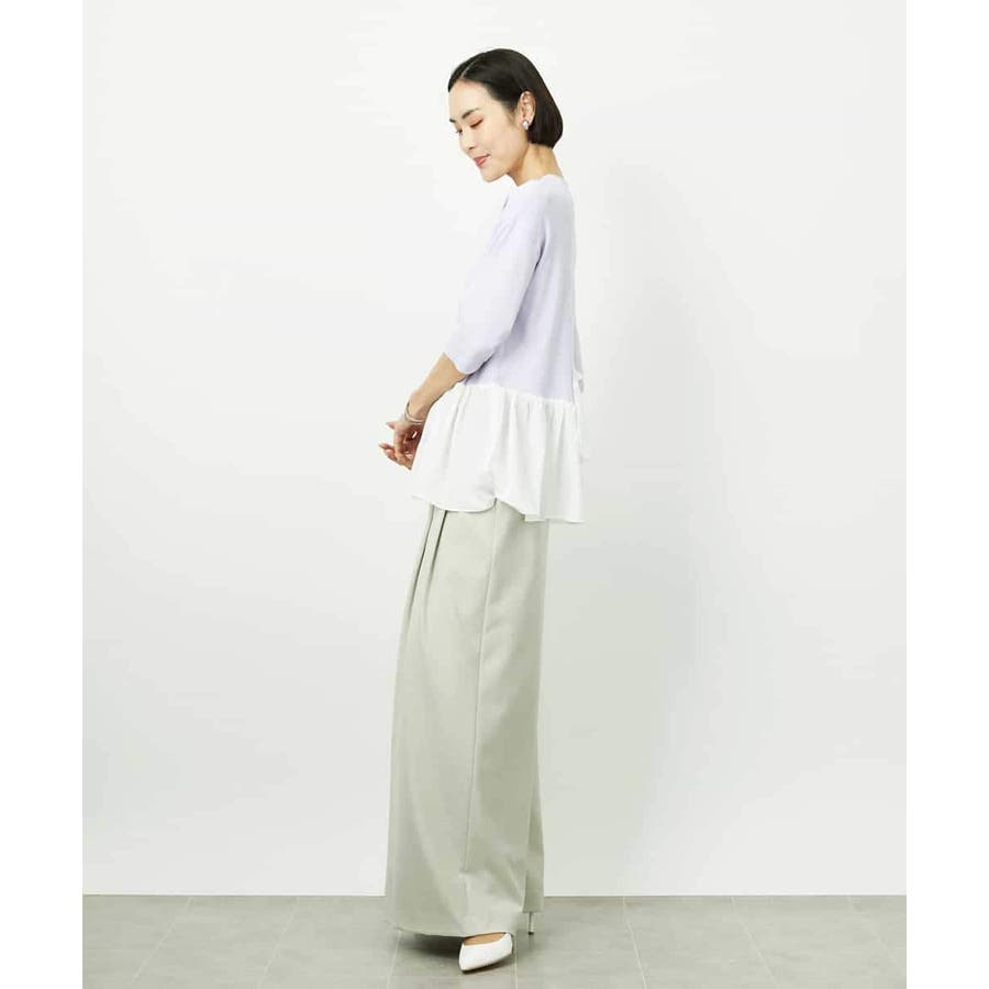 ニット部分には、透け感のないレーヨン・ポリエステル素材を使用し、しなやかな風合いと高いストレッチ性で快適な着心地に仕上げました。 フリル部分は、イージーケアなポリエステルデシンの別布で切り替え、軽やかな表情をプラスしています。