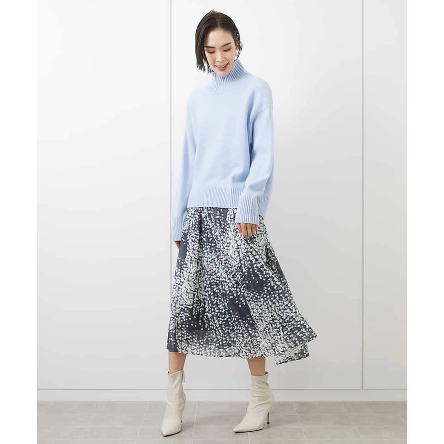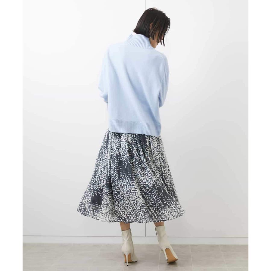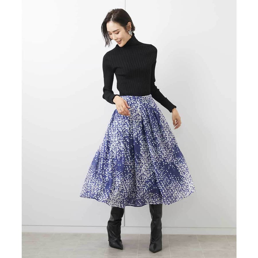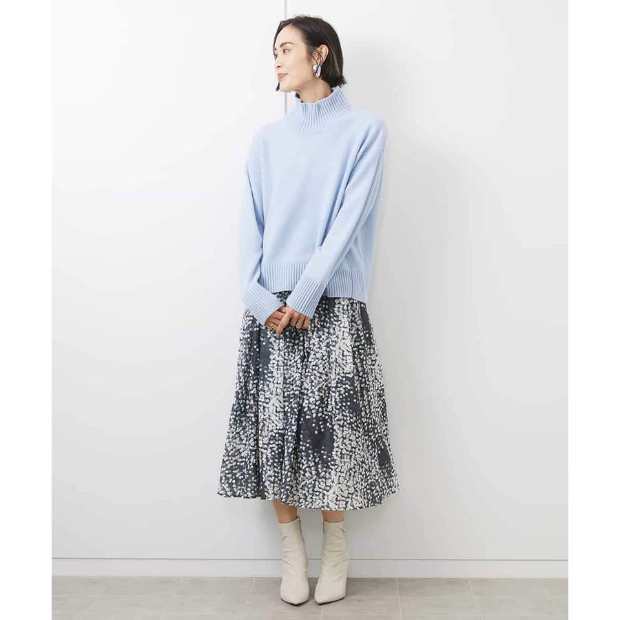 毛足のあるニットと素材のコントラストを活かしたスタイリングがおすすめです。小さめの柄で手持ちのアイテムにも取り入れやすいスカートです。