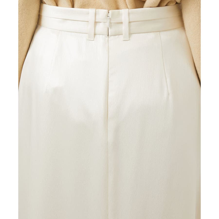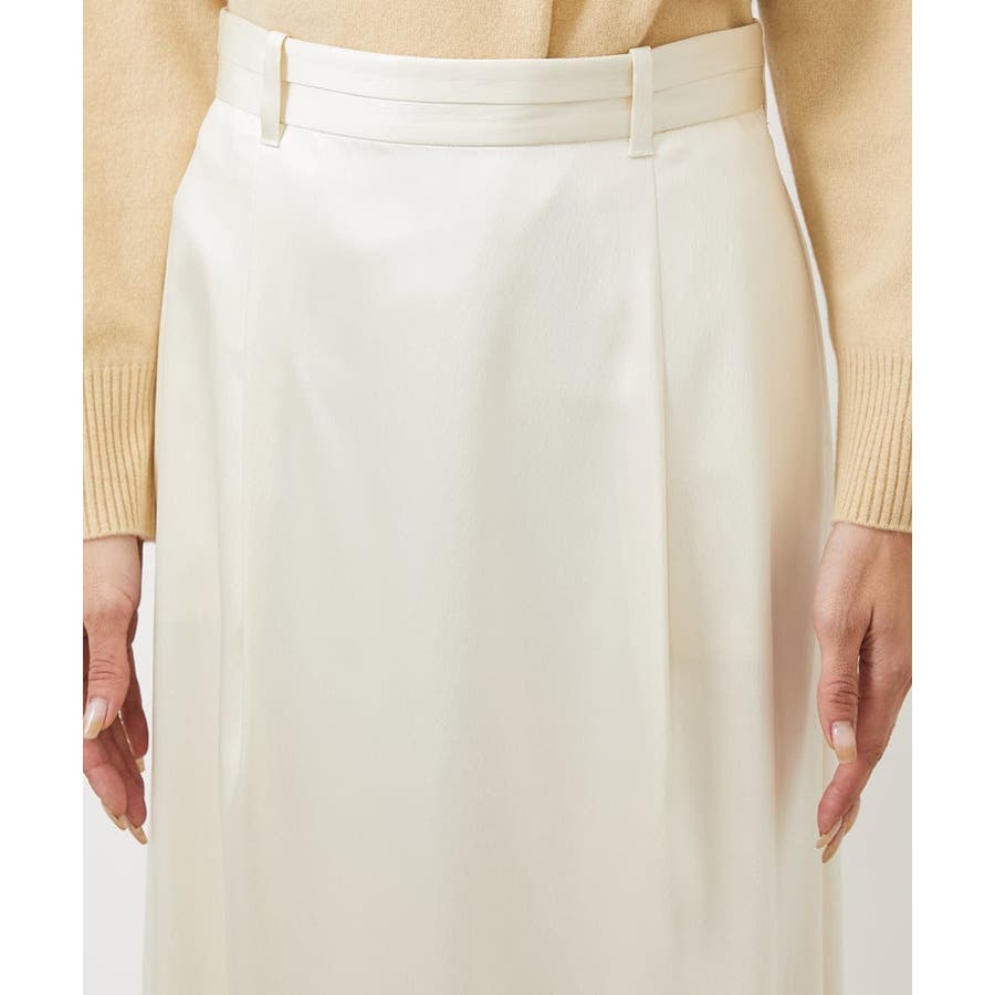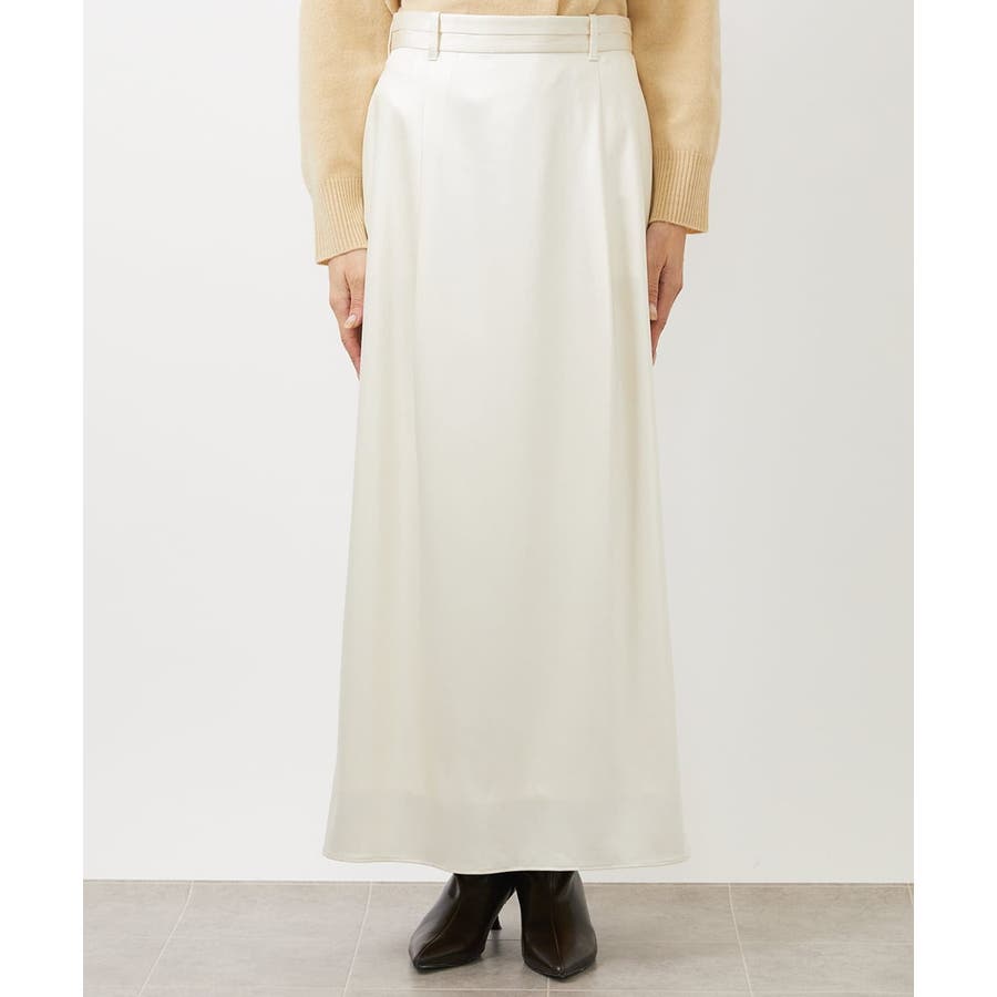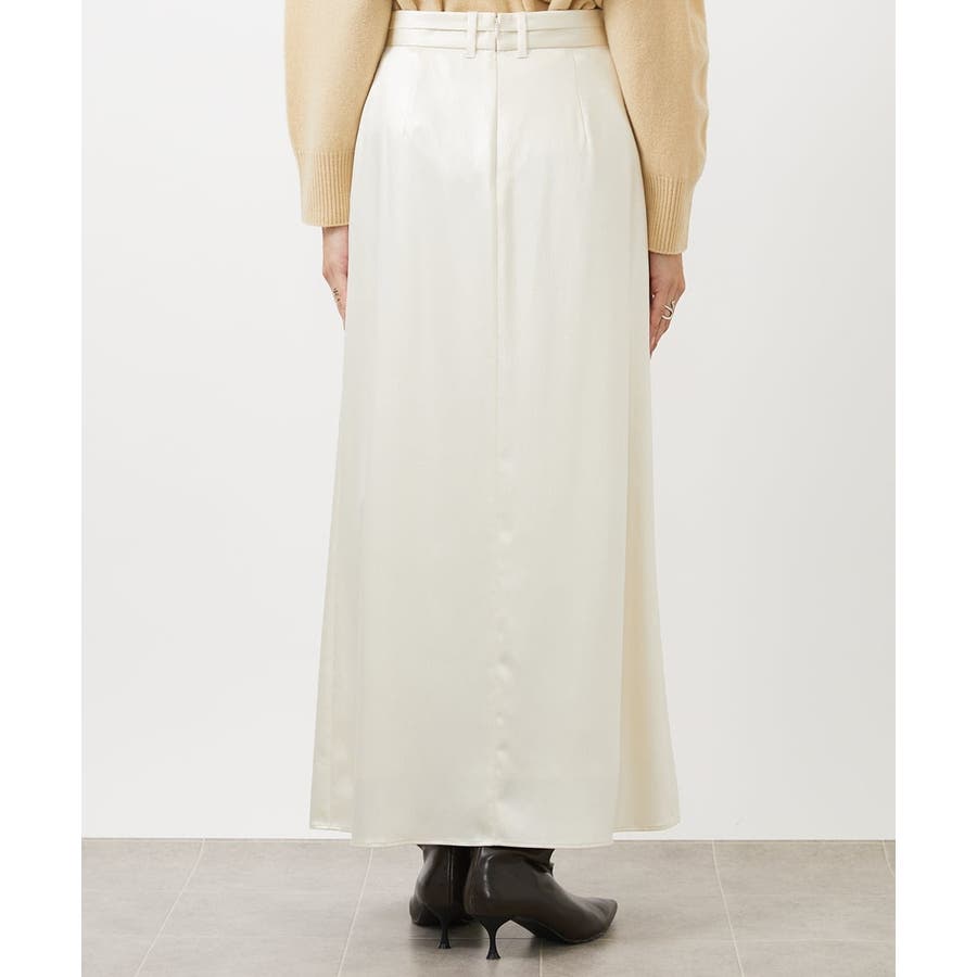 従来より少し低めのウエストに設定されたマキシ丈のロングスカート。すっきりした腰まわりと、ナローななシルエットが特徴のサテンスカートです。少し腰で落として履くデザインなので、ベルトループにベルトを通せば、着用時にウエスト位置の調整も可能です。40サイズは限定店舗展開です。