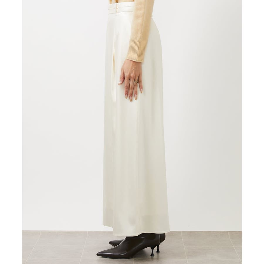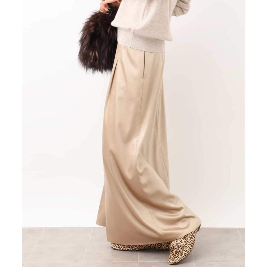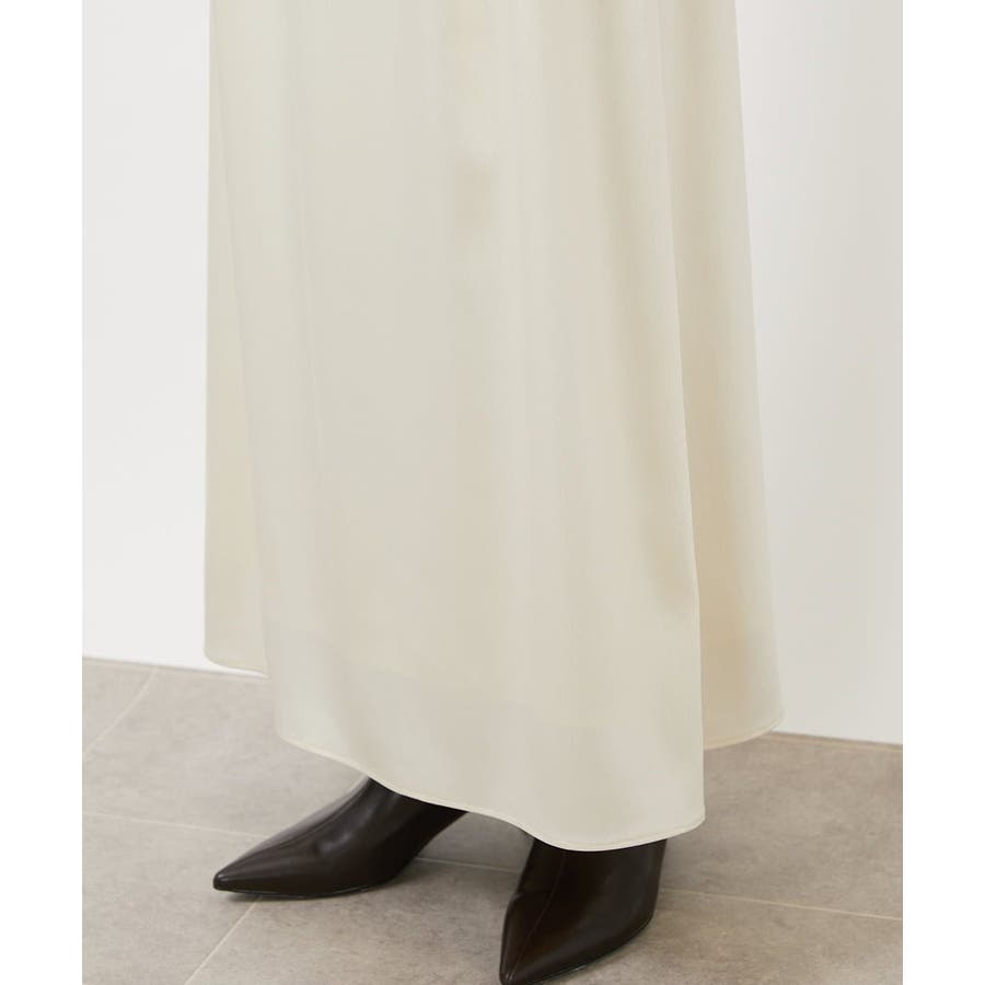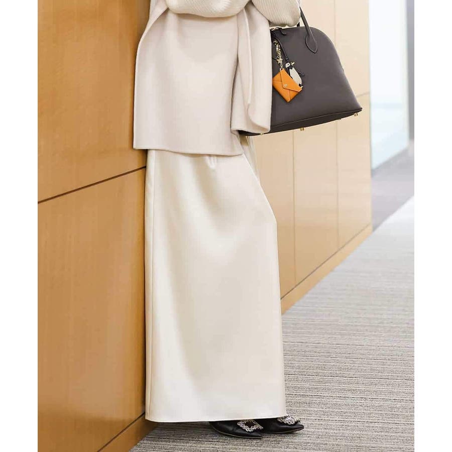 従来より少し低めのウエストに設定されたマキシ丈のロングスカート。すっきりした腰まわりと、ナローななシルエットが特徴のサテンスカートです。少し腰で落として履くデザインなので、ベルトループにベルトを通せば、着用時にウエスト位置の調整も可能です。40サイズは限定店舗展開です。