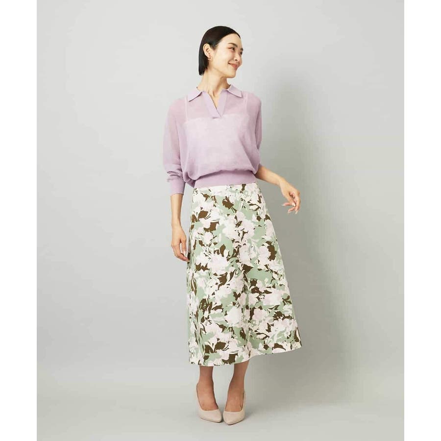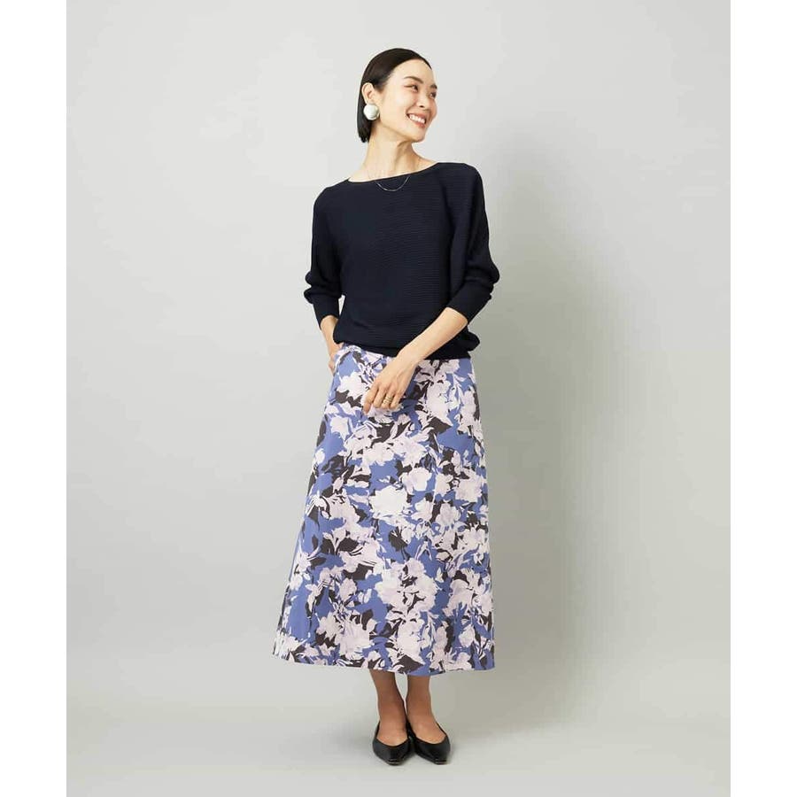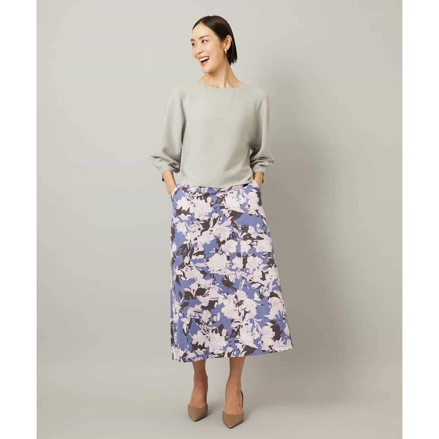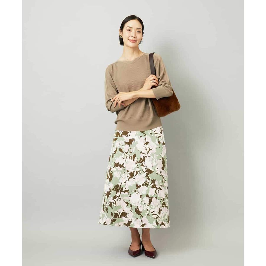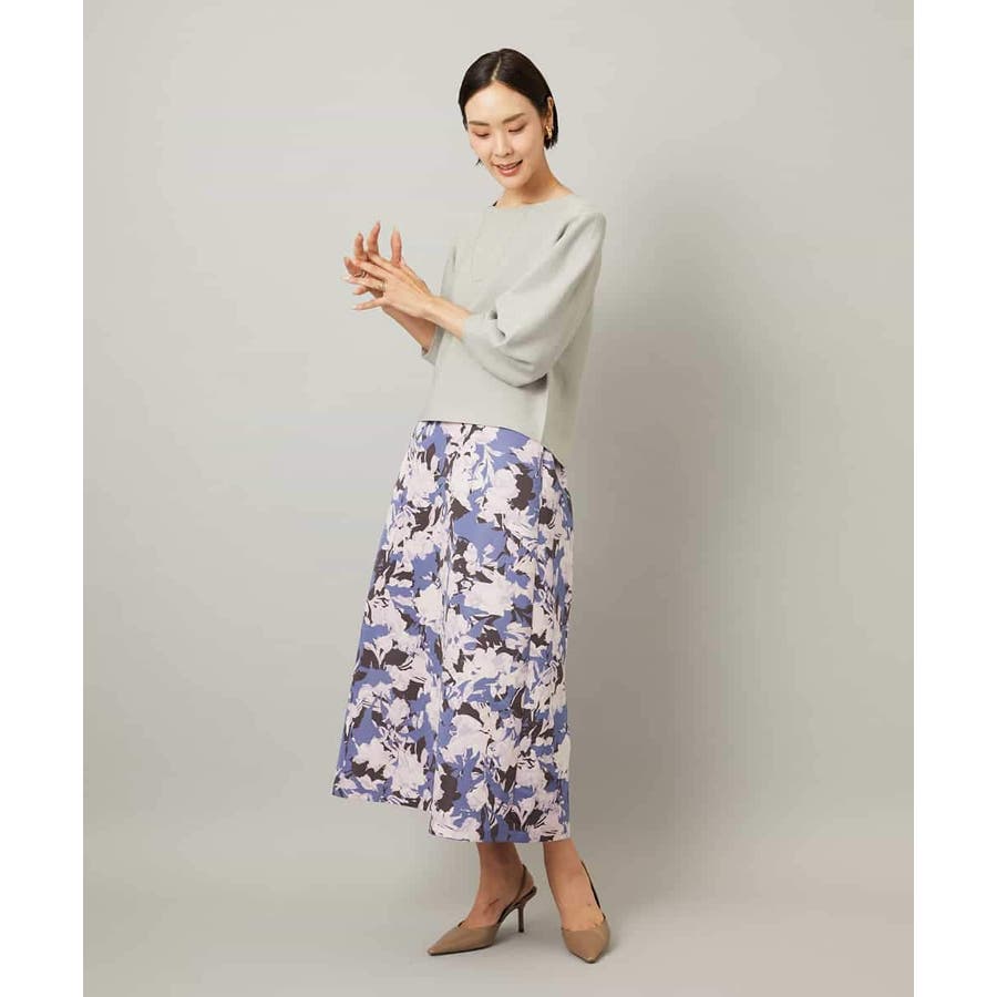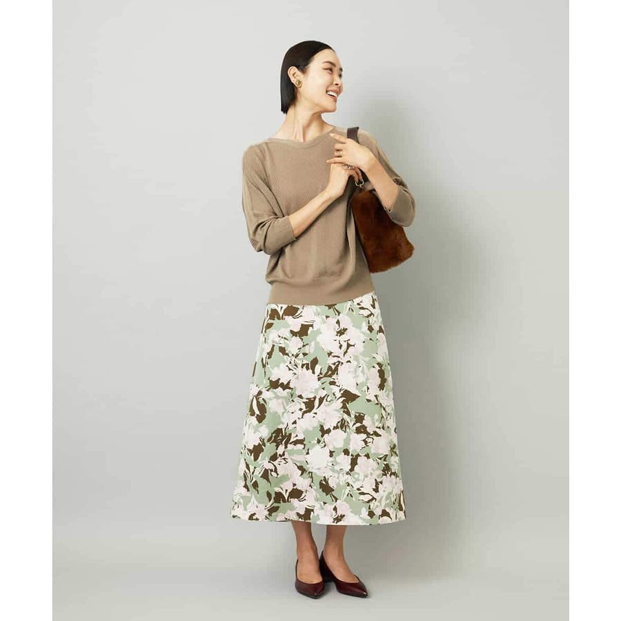 落ち着いたトーンのニットと合わせれば、華やかなプリントが引き立ち、日常にも取り入れやすいスタイルに。ブラウスを合わせて上品にまとめれば、お出かけシーンにも活躍します。足元はフラットシューズで軽やかに、ヒールでエレガントにと、シーンに合わせた着こなしを楽しめる一枚です。