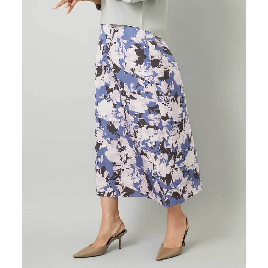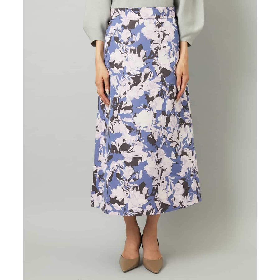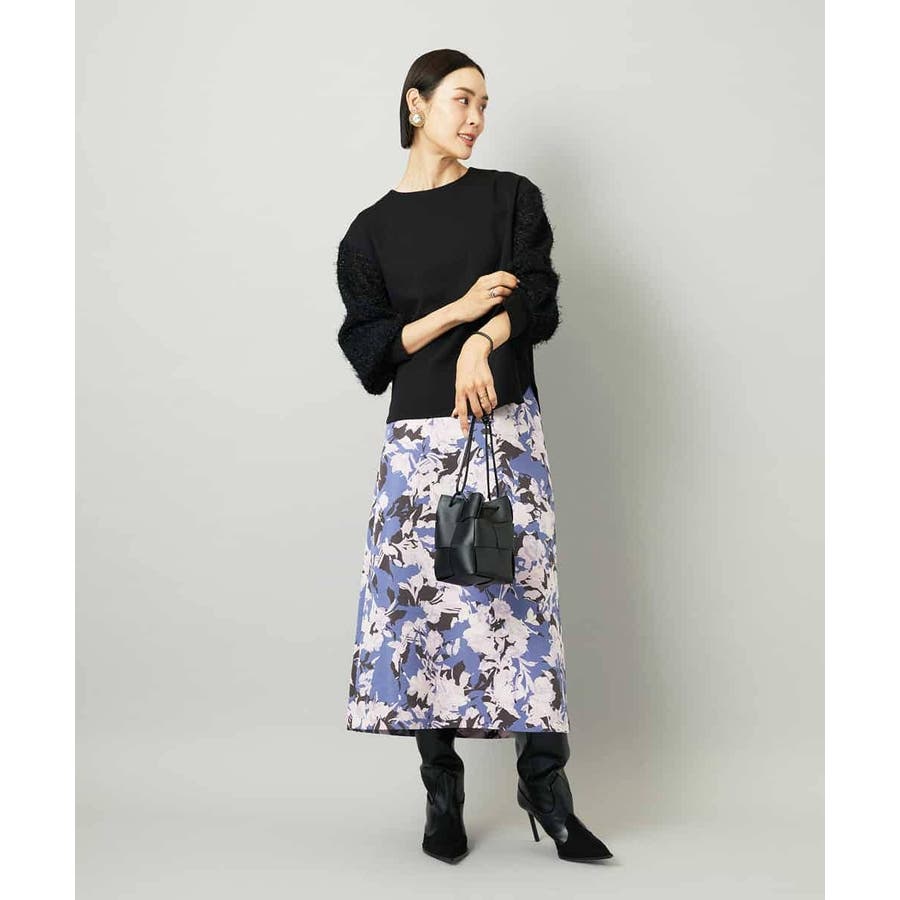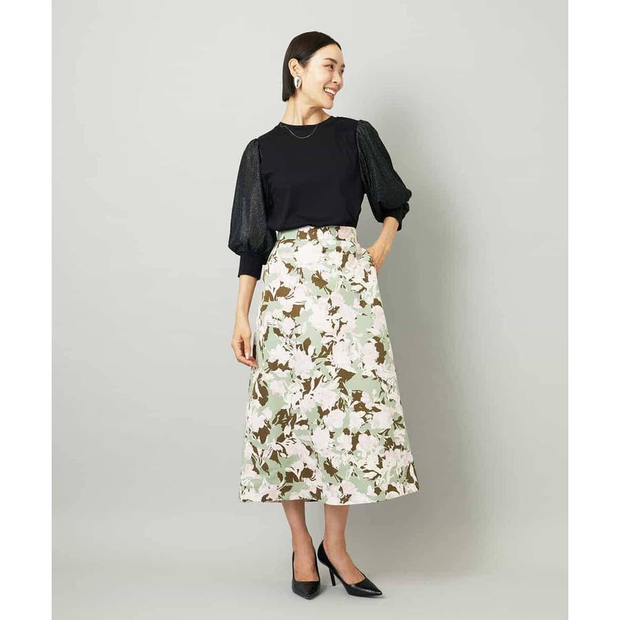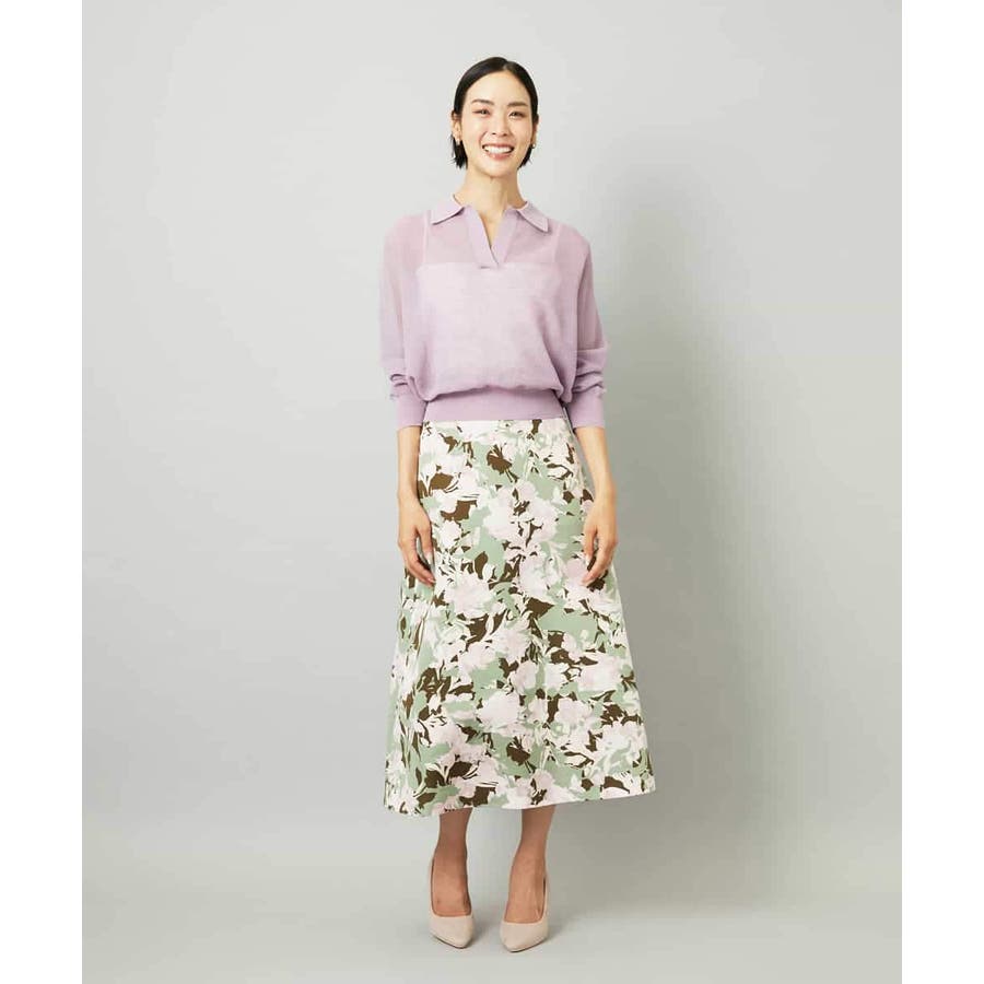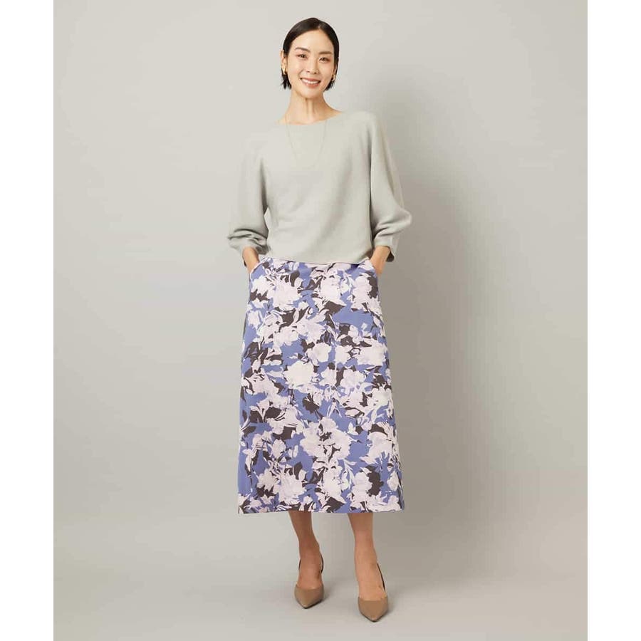 落ち着いたトーンのニットと合わせれば、華やかなプリントが引き立ち、日常にも取り入れやすいスタイルに。ブラウスを合わせて上品にまとめれば、お出かけシーンにも活躍します。足元はフラットシューズで軽やかに、ヒールでエレガントにと、シーンに合わせた着こなしを楽しめる一枚です。
