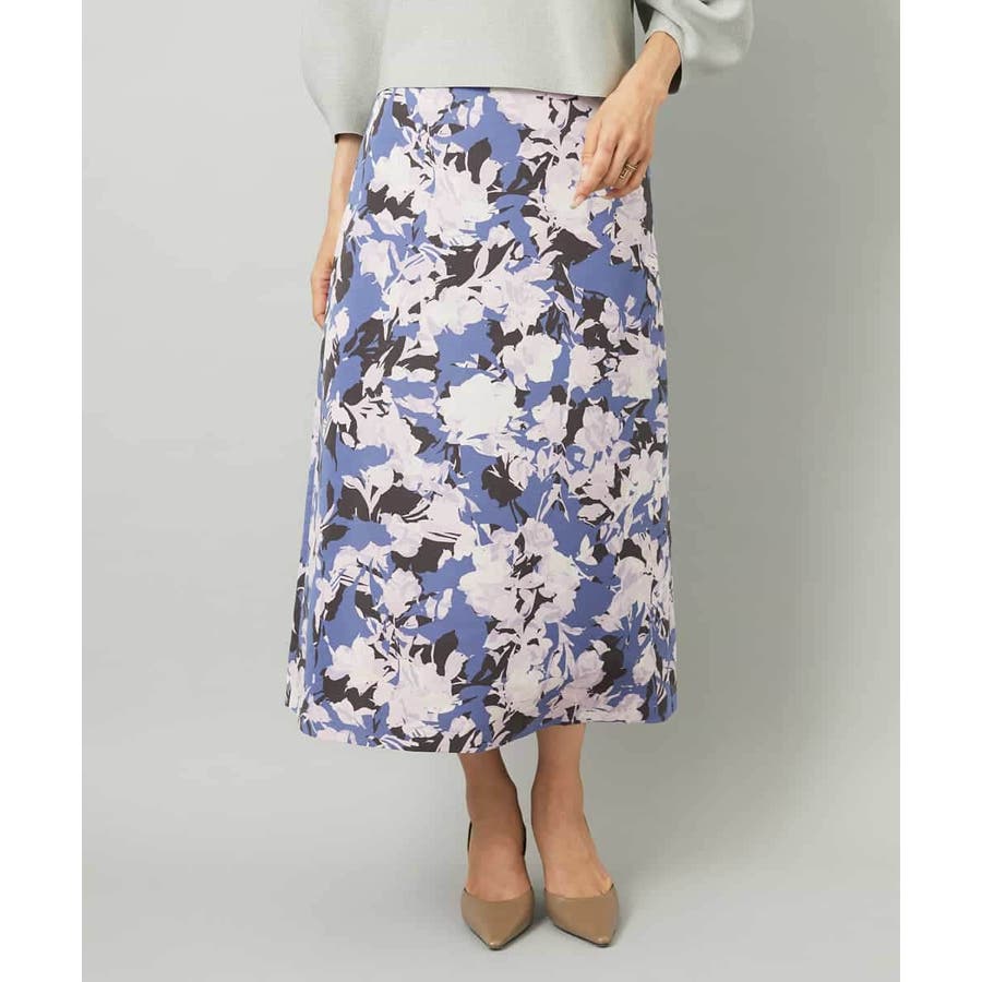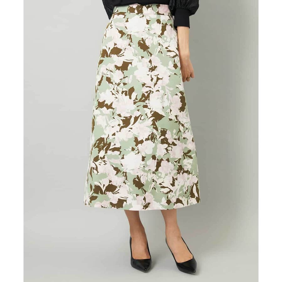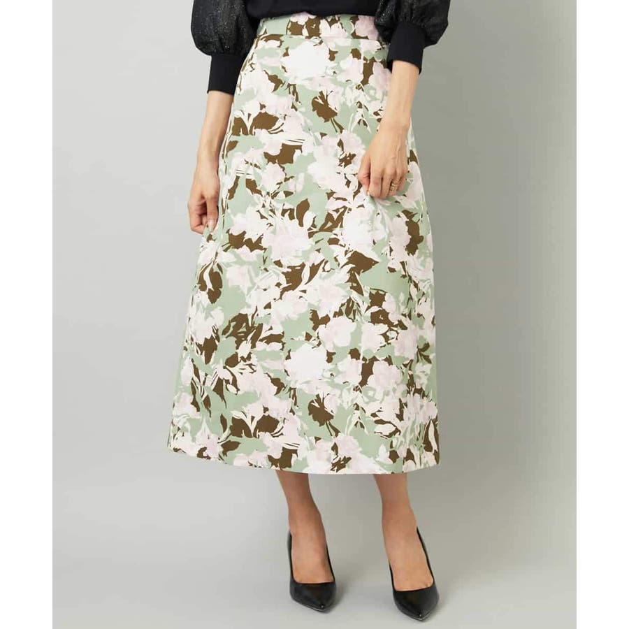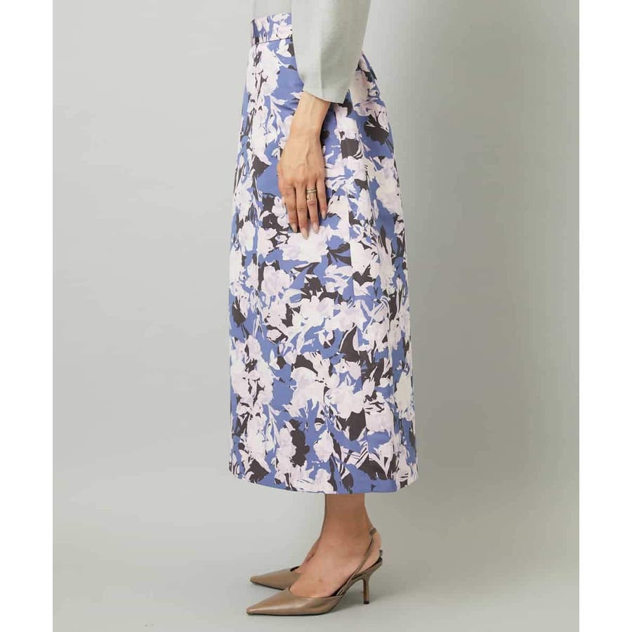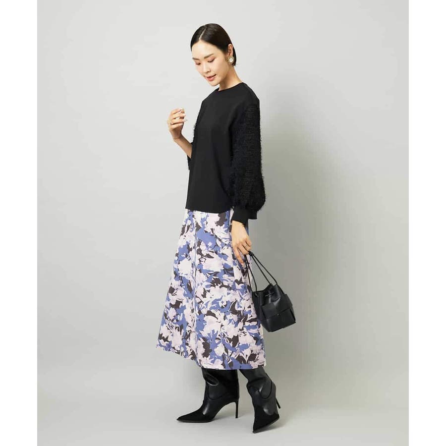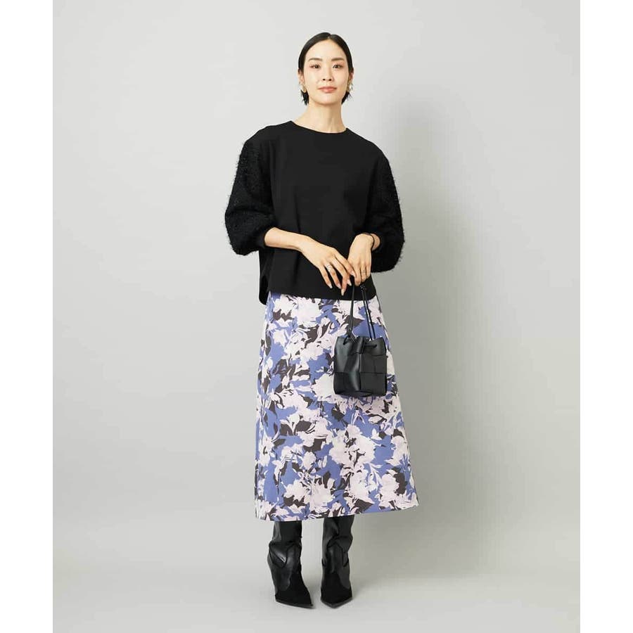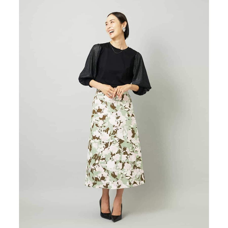 落ち着いたトーンのニットと合わせれば、華やかなプリントが引き立ち、日常にも取り入れやすいスタイルに。ブラウスを合わせて上品にまとめれば、お出かけシーンにも活躍します。足元はフラットシューズで軽やかに、ヒールでエレガントにと、シーンに合わせた着こなしを楽しめる一枚です。