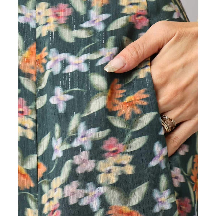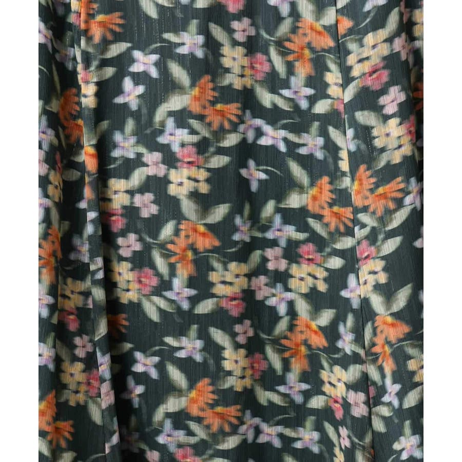 〈BLOEMIST社〉のアトリエで描かれたダークフラワープリントを使用。雨だれのようなストライプが走る薄地に、フィルムラメのきらめきを織り込んだ、上品でヴィンテージ感のあるMICHELオリジナル素材です。大人の女性にふさわしい、甘すぎない華やかさが魅力。