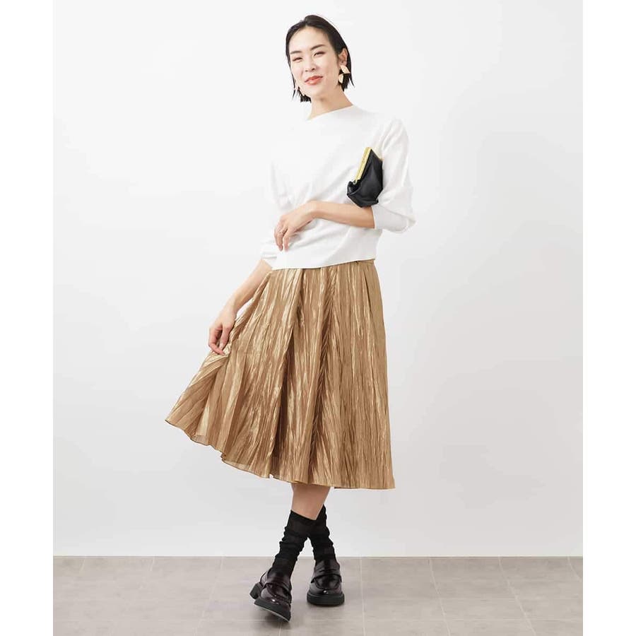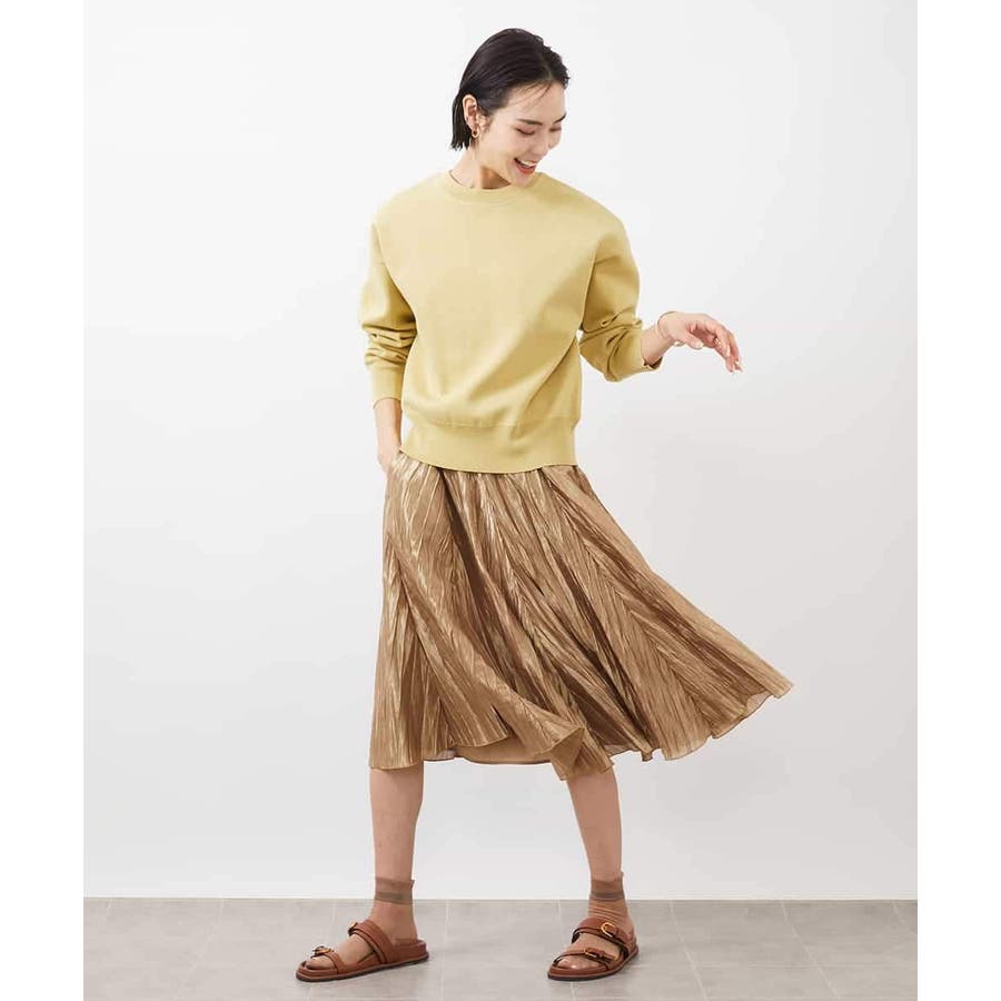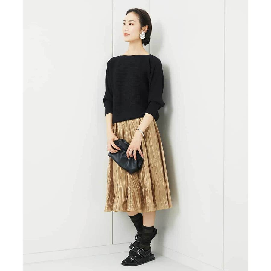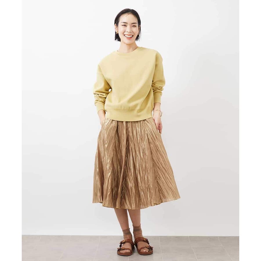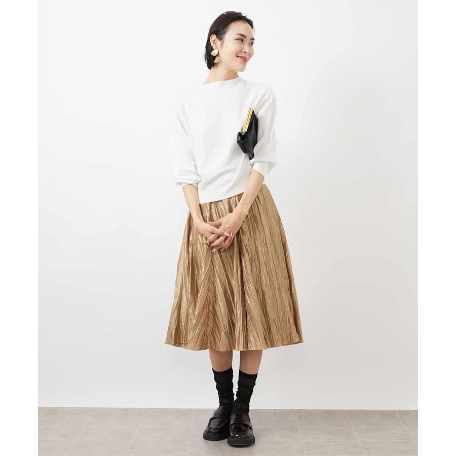 エレガントなスカートはあえてカジュアルなWフェイスのニット・スニーカーと合わせることでバランスが取れ、大人に似合う程よいぬけ感を持たせることが出来ます。