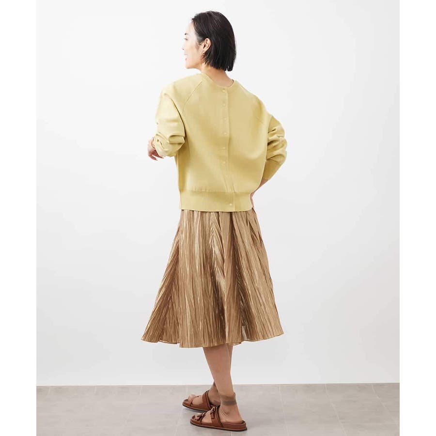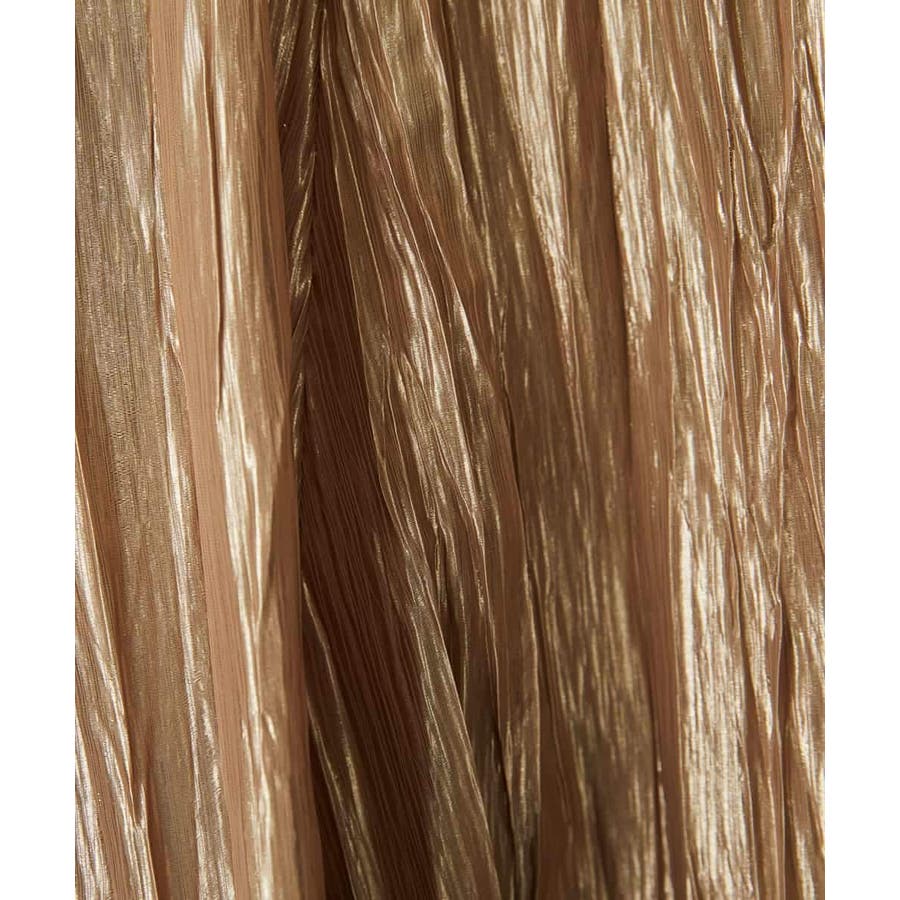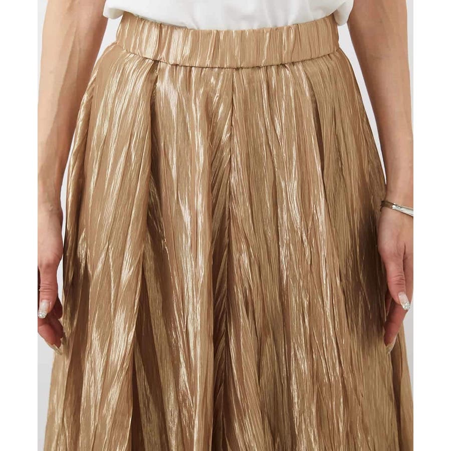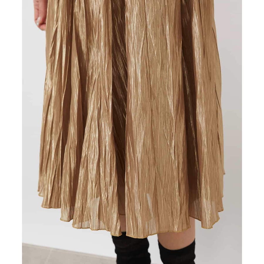 光沢感のある特殊なブライトポリエステル糸を使用したカールマイヤー。トレンドのメタリックな輝きと、プリーツの様な縦シワ加工が特徴の素材。軽さと程よいハリ感もトレンドです。・接触冷感