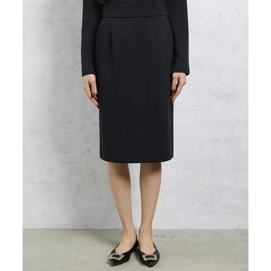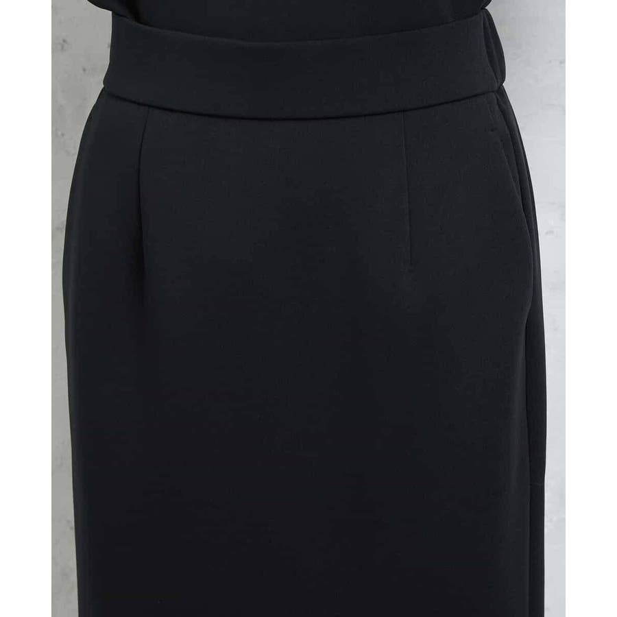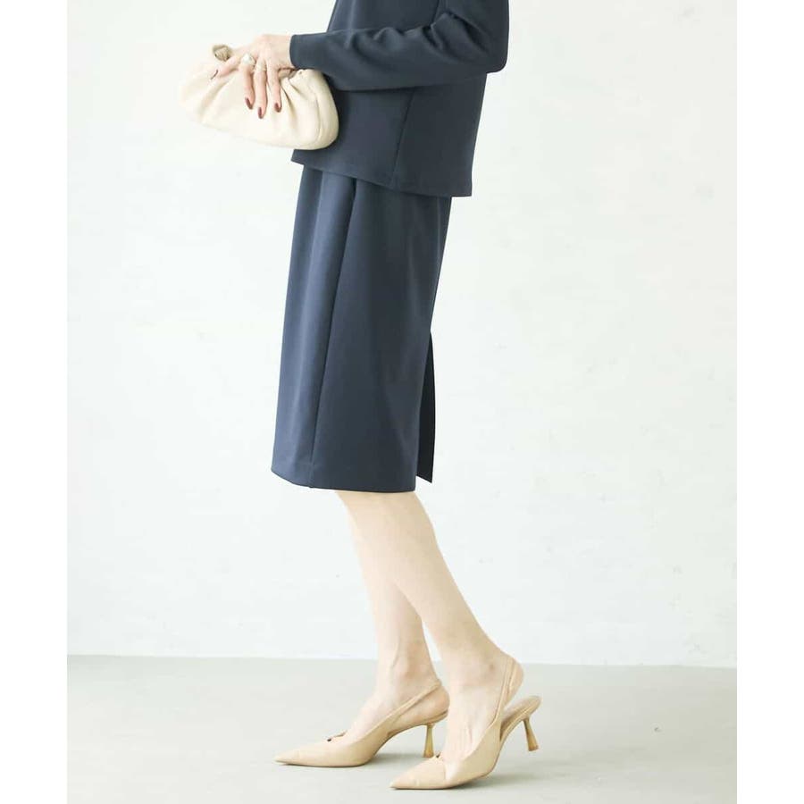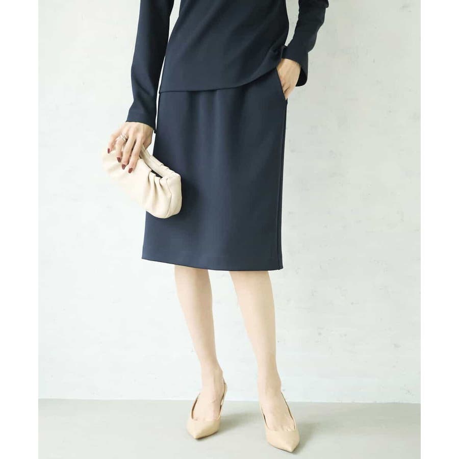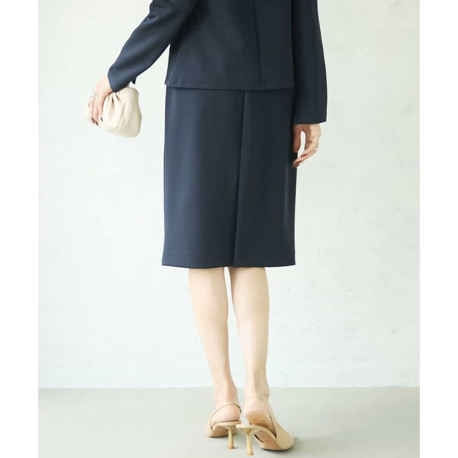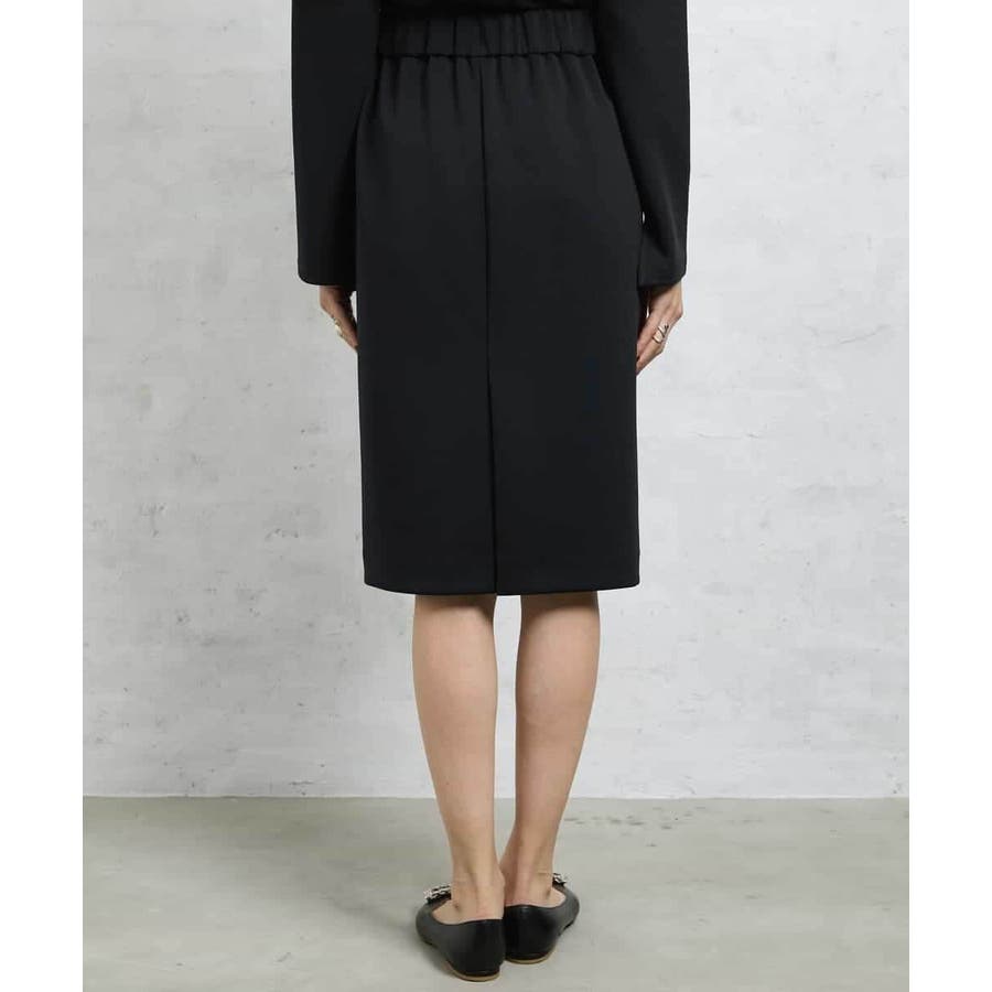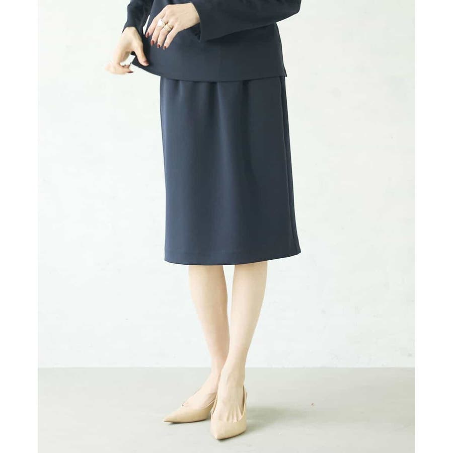 ウエストゴムのあき無しのリラックスした履き心地のタイトスカート。ラインにこだわり、前はギャザーなし、裾に向けて細くなるシルエットですっきりきちんと見えを叶えます。ウエストゴムの幅を広めにすることで、トップスをインしたときにも見せられるアクセントに。落ち感がありストレッチ性も高い素材で、スリットもしっかりと入れることではきやすさにもこだわりました。40サイズは限定店舗展開です。