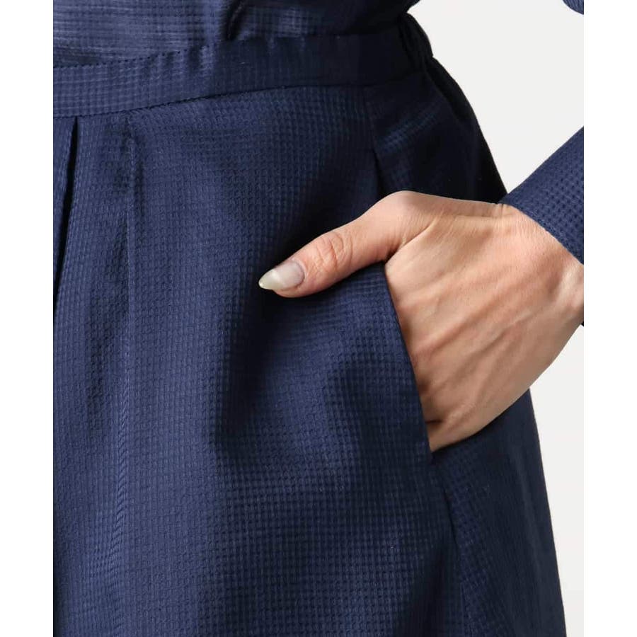 素材のほどよいハリ感とシアー感を活かした、軽やかな表情のスカート。分量感のあるシルエットながら重く見えず、動きに合わせて生まれる柔らかな揺れ感が魅力です。ネイビーベースのワッフル素材が甘さを抑え、落ち着いた大人の雰囲気を演出。きれいめからカジュアルまで、幅広いコーディネートに活躍します。40サイズは限定店舗展開です。