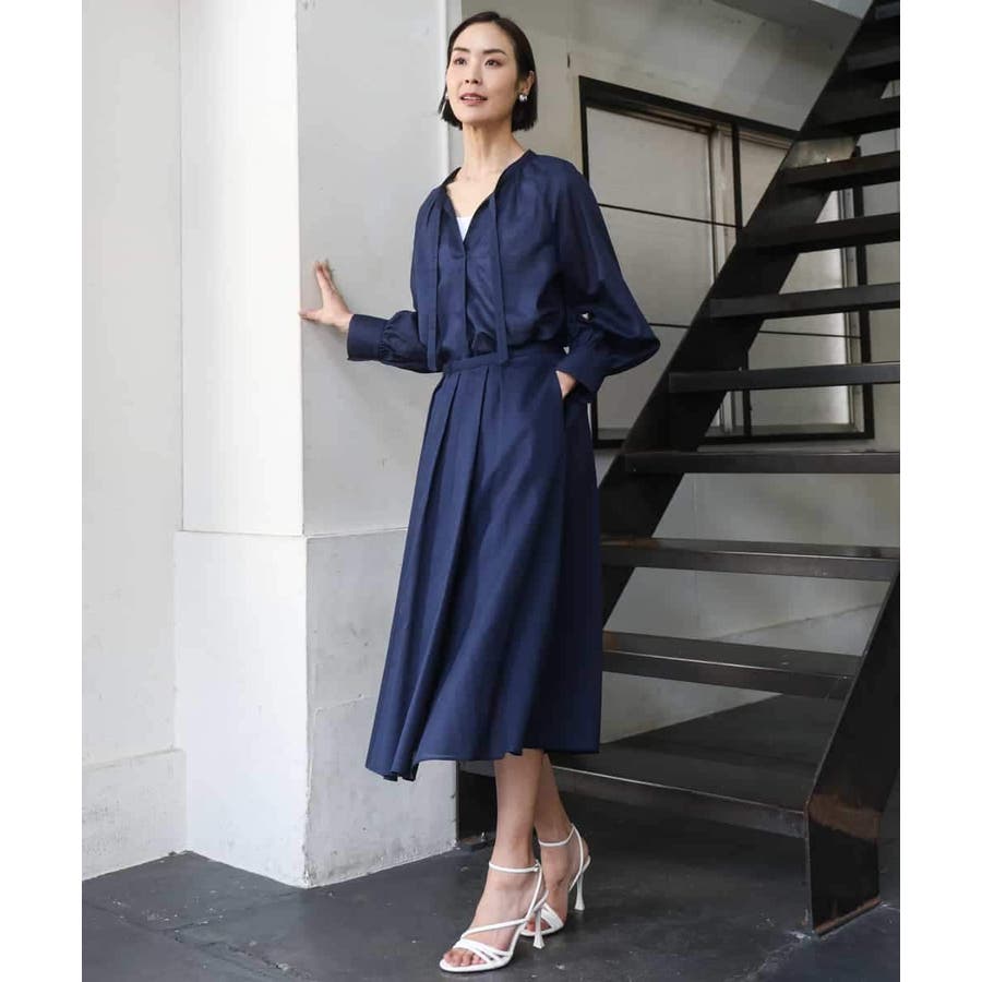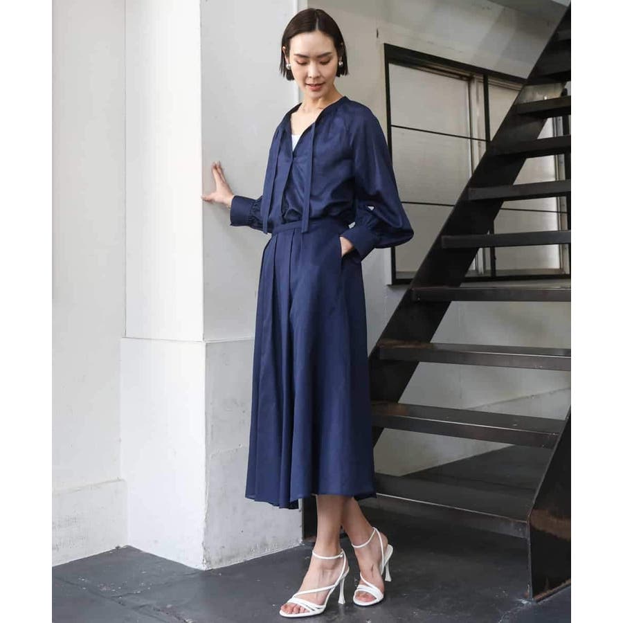 同素材のブラウスと合わせたセットアップスタイルは統一感のある着こなしで、より洗練された印象に仕上がります。ニットやデニムジャケットと合わせたカジュアルスタイルもデイリーにおすすめです。