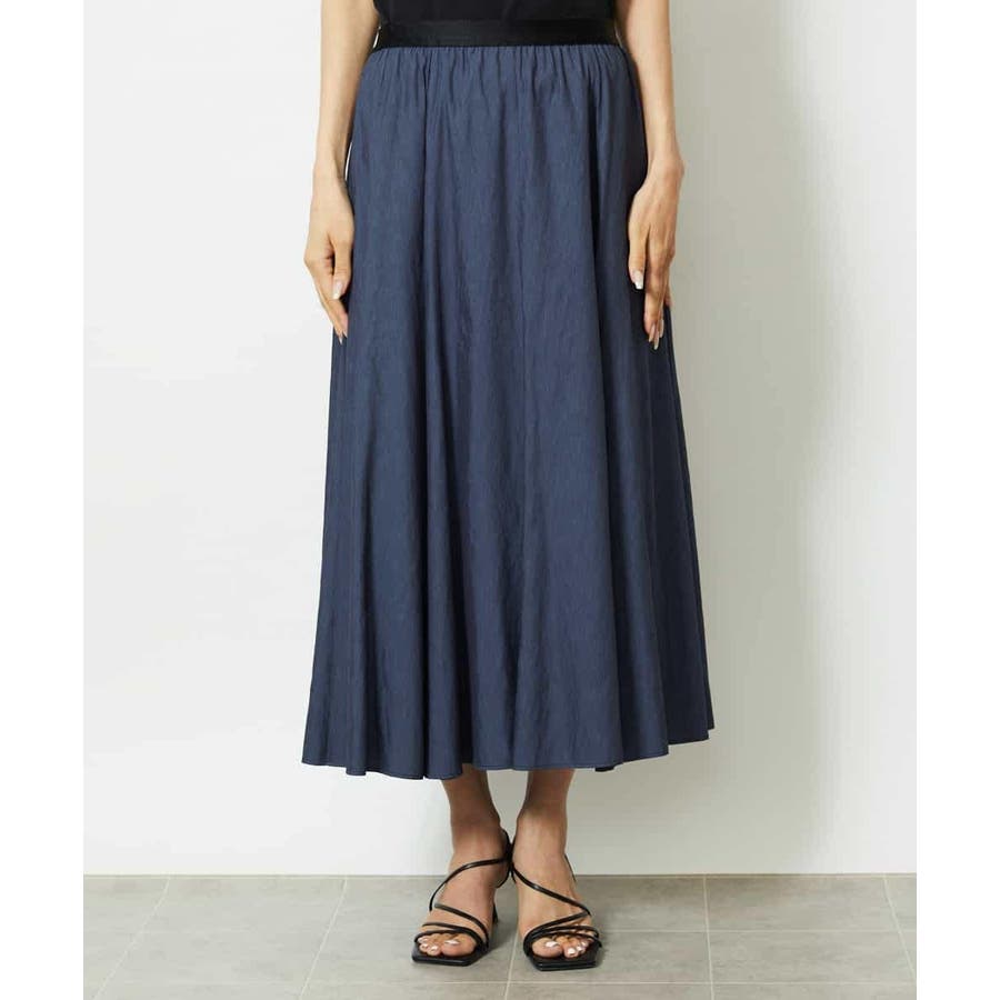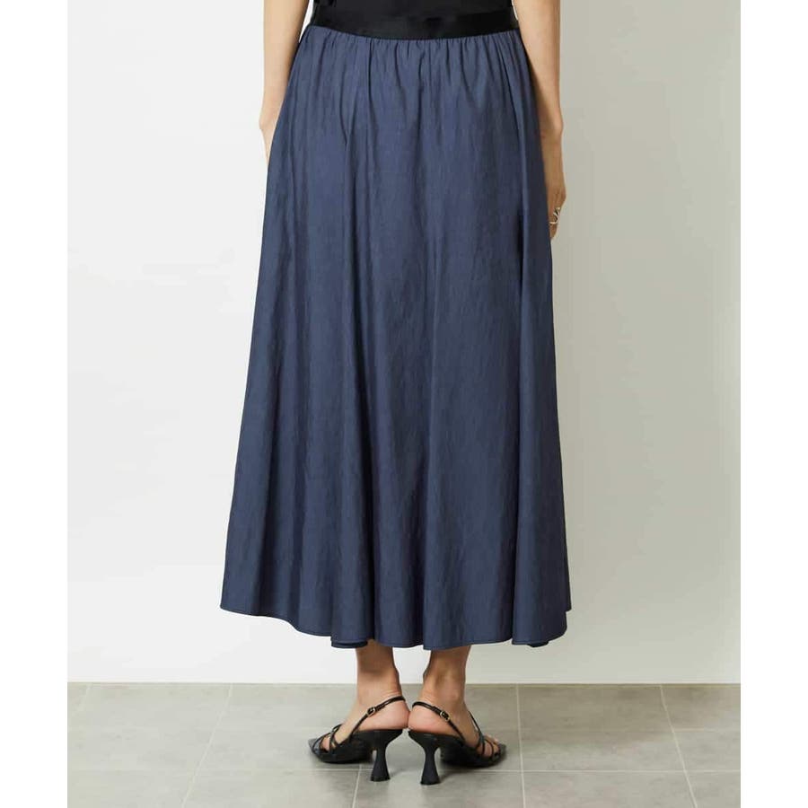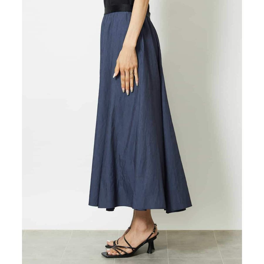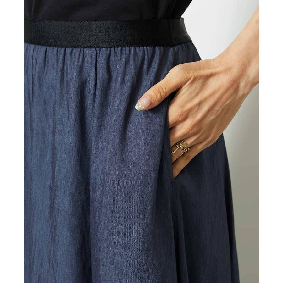 ブラックのサテンベルトがアクセントになった、デザイン性のあるスカート。ウエストはゴム仕様で、ストレスフリーなはき心地ながらも、配色ベルトが全体を引き締め、シャープな印象に仕上げています。腰まわりはすっきりと見えるシルエットで、裾にかけてほんのり広がるマーメイド風のフレアラインが女性らしい動きを演出。トップスをインしたスタイリングも映える、上品さとラクさを兼ね備えた一枚です。36・40サイズは限定店舗展開です。