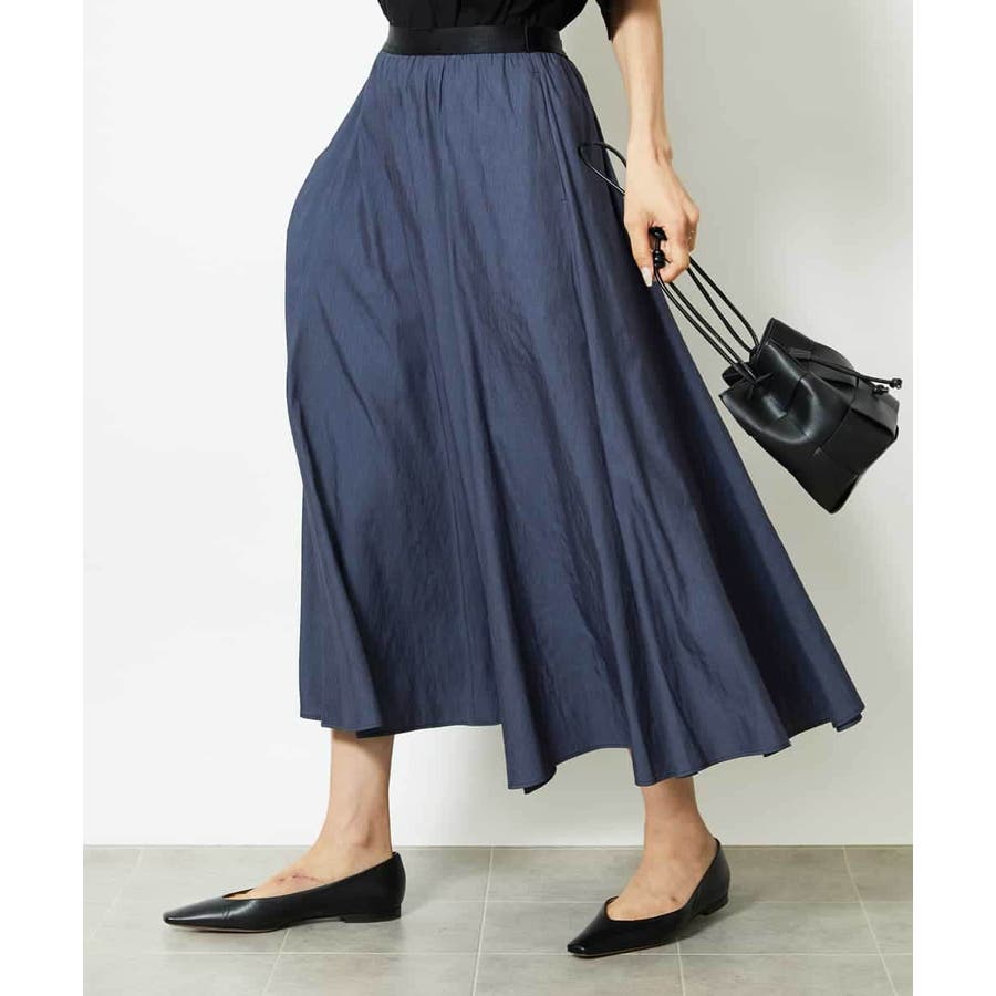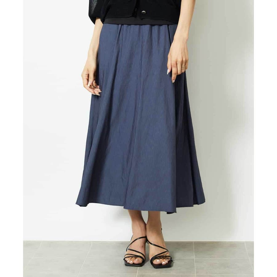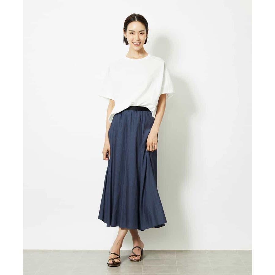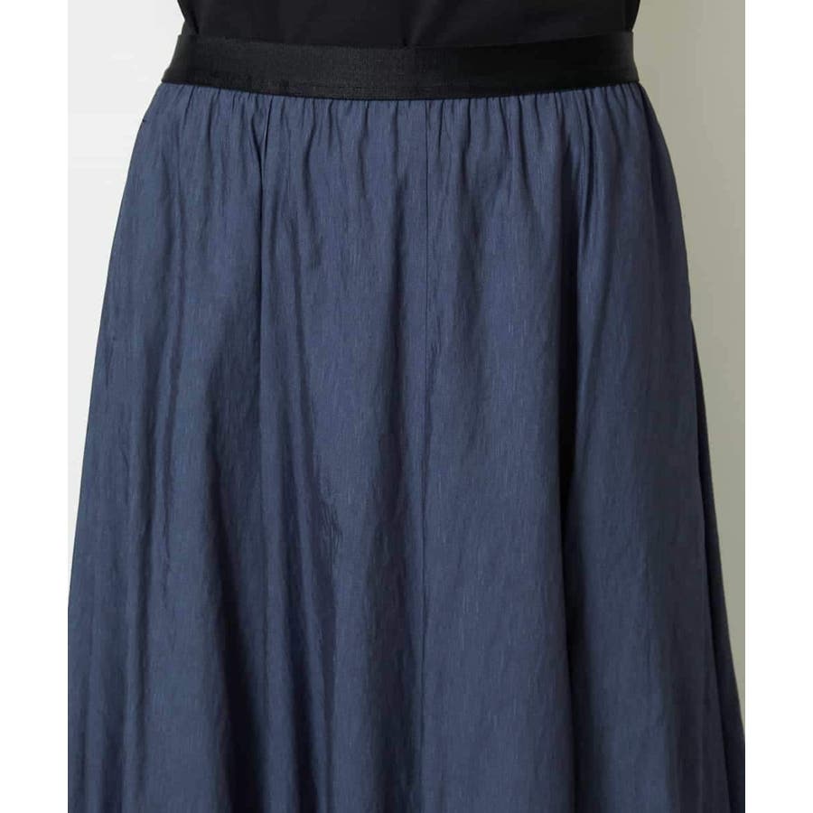 ブラックのサテンベルトがアクセントになった、デザイン性のあるスカート。ウエストはゴム仕様で、ストレスフリーなはき心地ながらも、配色ベルトが全体を引き締め、シャープな印象に仕上げています。腰まわりはすっきりと見えるシルエットで、裾にかけてほんのり広がるマーメイド風のフレアラインが女性らしい動きを演出。トップスをインしたスタイリングも映える、上品さとラクさを兼ね備えた一枚です。36・40サイズは限定店舗展開です。