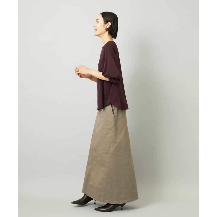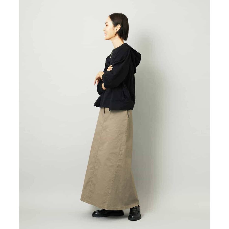 ストレッチの効いたコットンチノを使用したスカートで、製品洗いによるヴィンテージ感と軽やかな穿き心地が魅力です。動きやすく、それでいて大人のカジュアルスタイルにも自然になじむ素材感です。