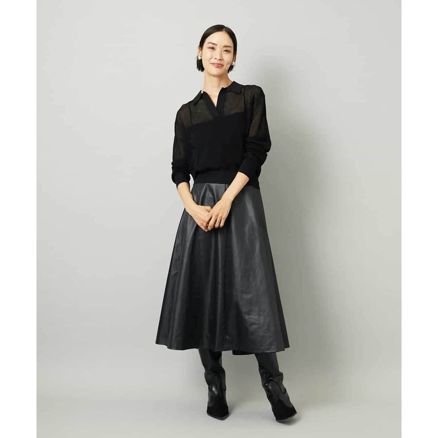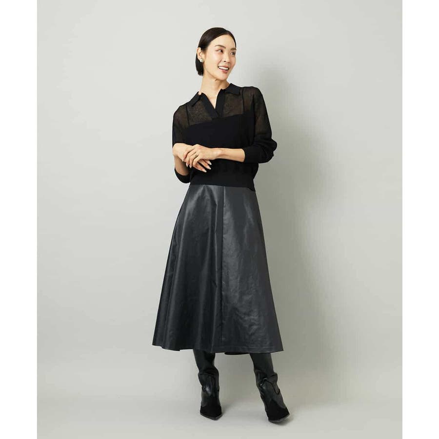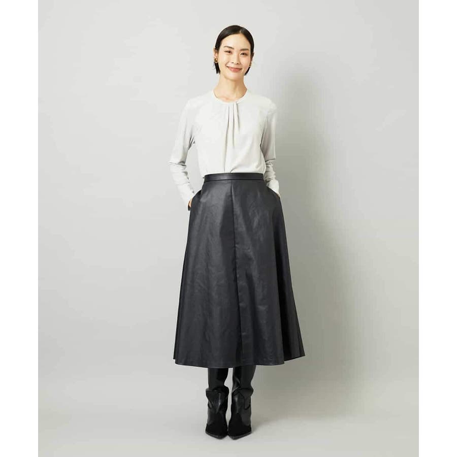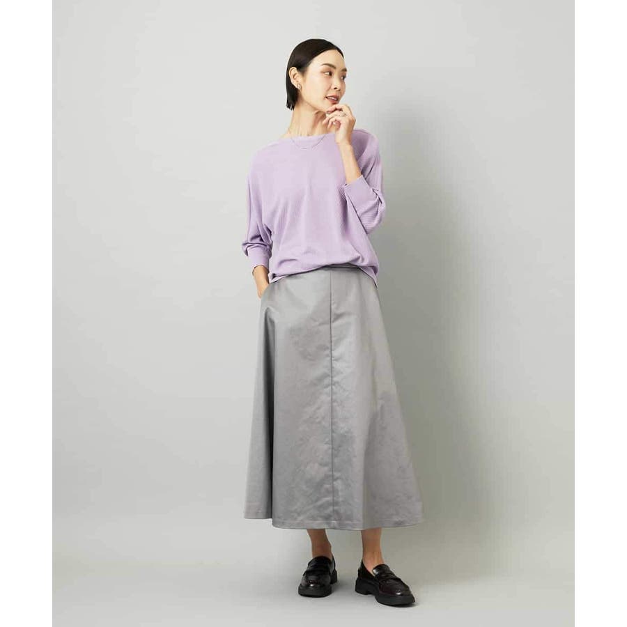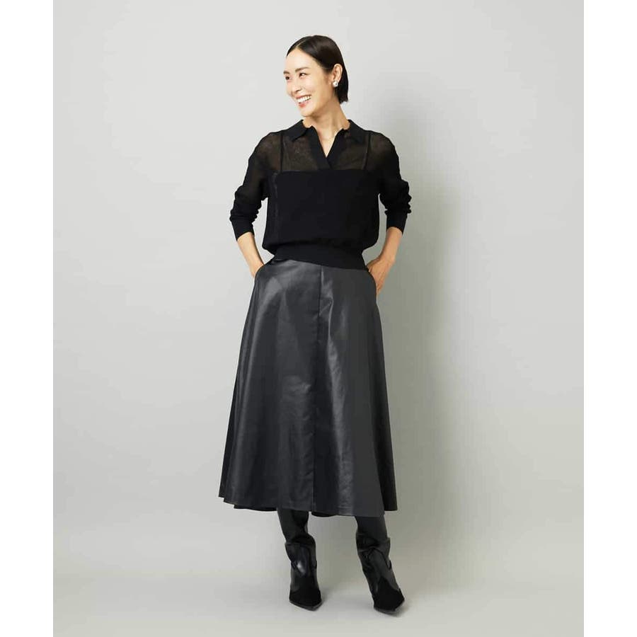 サテンベースのフェイクレザースカートは、モードになりすぎず扱いやすい一枚。すっきりしたミモレ丈フレアで、コンパクトなトップスと合わせればバランスの良いコーデに。シアースキッパーニットプルオーバー[FMFAD22220]と合わせると、<光沢×マット><ライト×ヘビー>のコントラストを効かせたスタイリングも楽しめます。