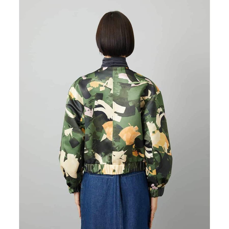 オリジナルプリント素材で仕立てたノーカラーショートブルゾン。素材のハリ感を活かした立体的なフォルムが特徴で、ハードになりすぎず洗練された華やかな印象に仕上げています。40サイズは限定店舗展開です。