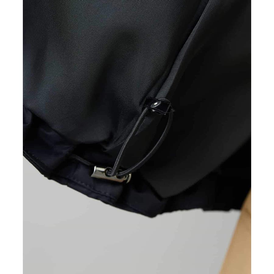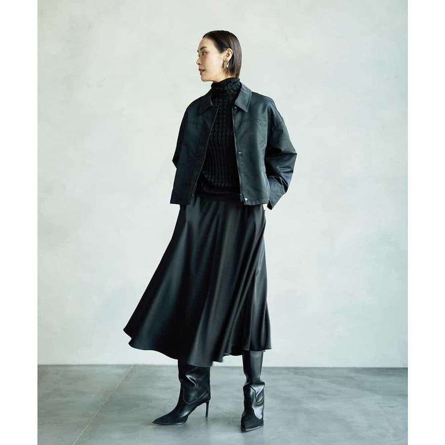 モードな雰囲気のナイロンブルゾンには、フェミニンなラメタートルニットとサテンスカートを合わせるのがおすすめです。また、ワイドパンツと合わせれば、クールで洗練された印象に仕上がります。