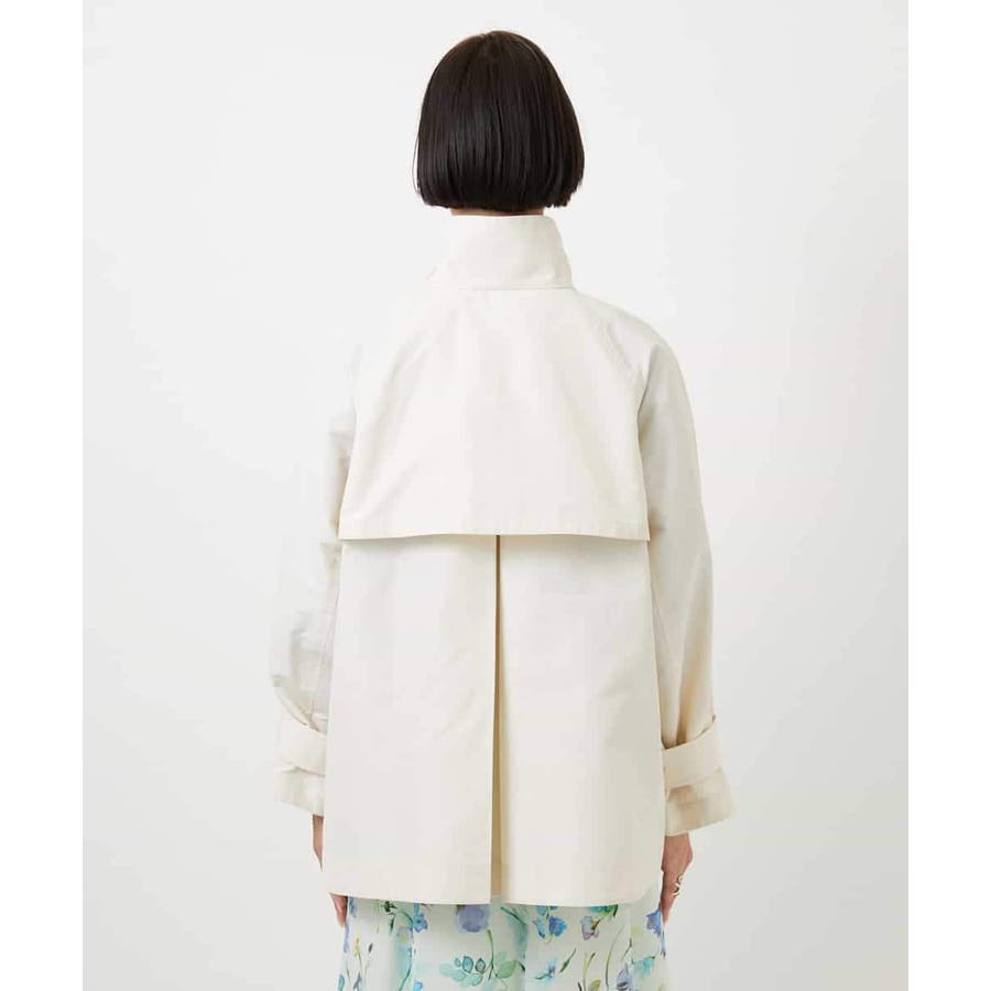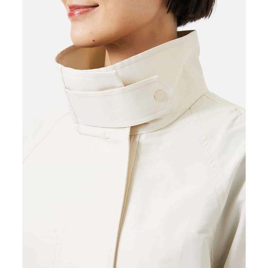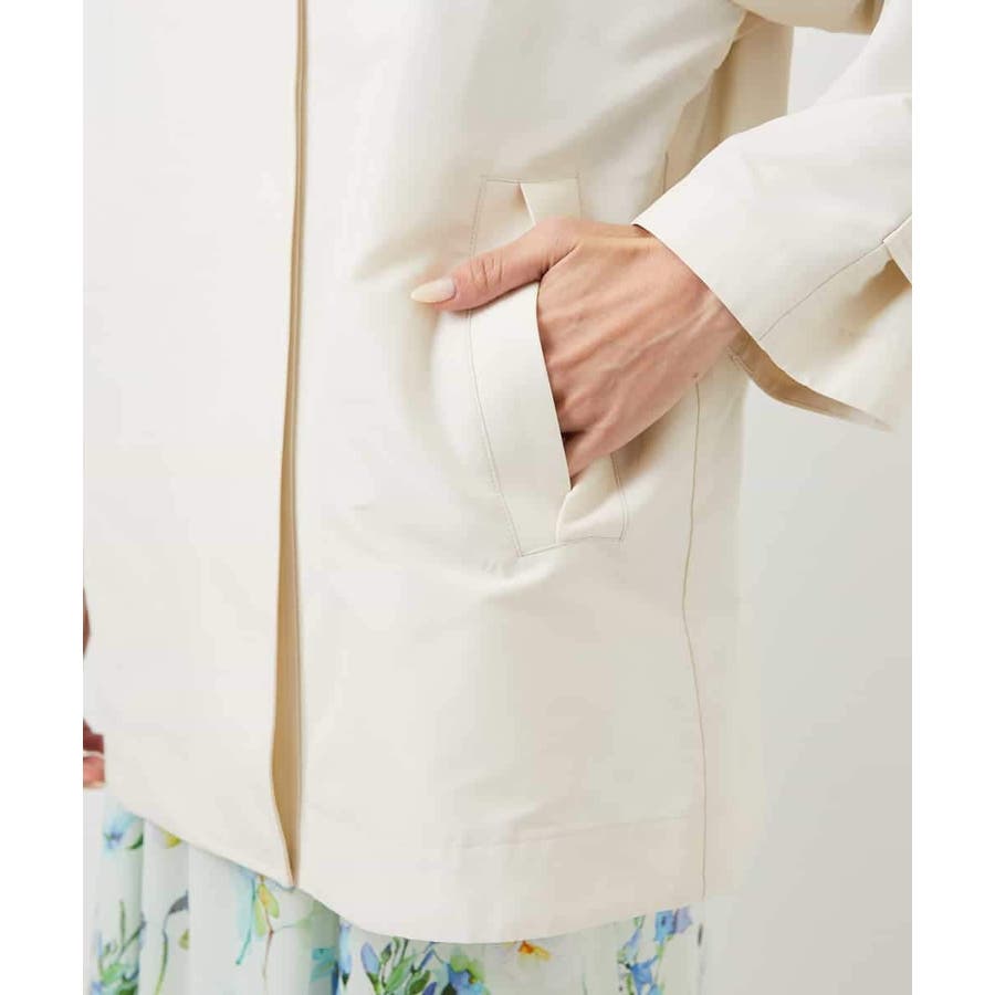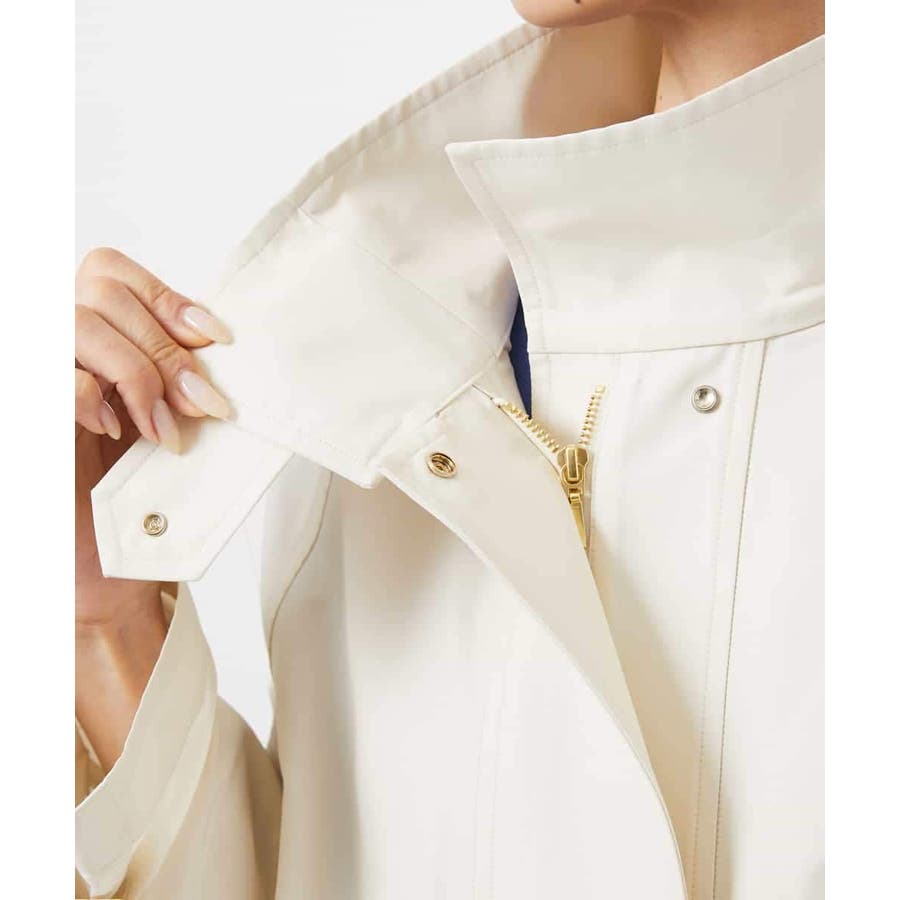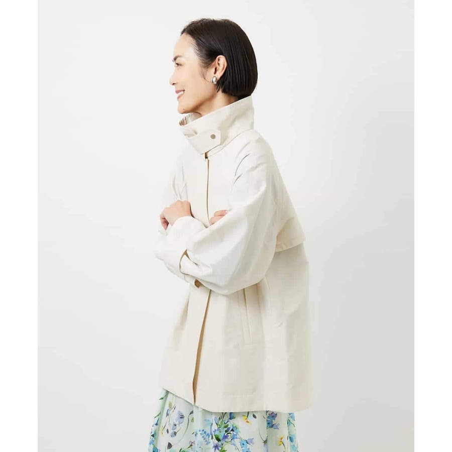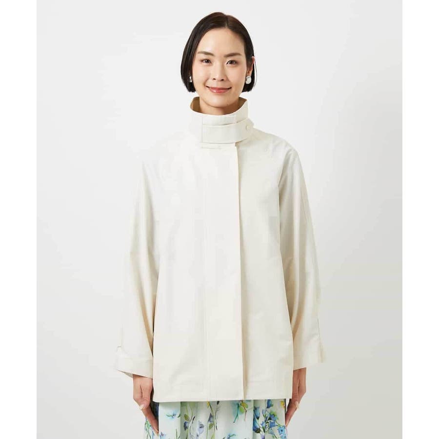 スロートタブのディテールがさりげないアクセントとなる、ミドルレングスのライトアウター。メモリー素材特有のハリとコシを活かし、着るだけで立体感のある美しいフォルムを演出します。衿を立てた際にもメイクが付きにくいよう配慮したパターン設計で、実用性にもこだわりました。袖口のベルトは内側で留める仕様にすることで、自然にボリュームが生まれ、パフスリーブのようなこなれた袖口の表情も楽しめます。軽やかな着心地で、デイリーからきれいめスタイルまで幅広く活躍します。 40サイズは限定店舗展開です。