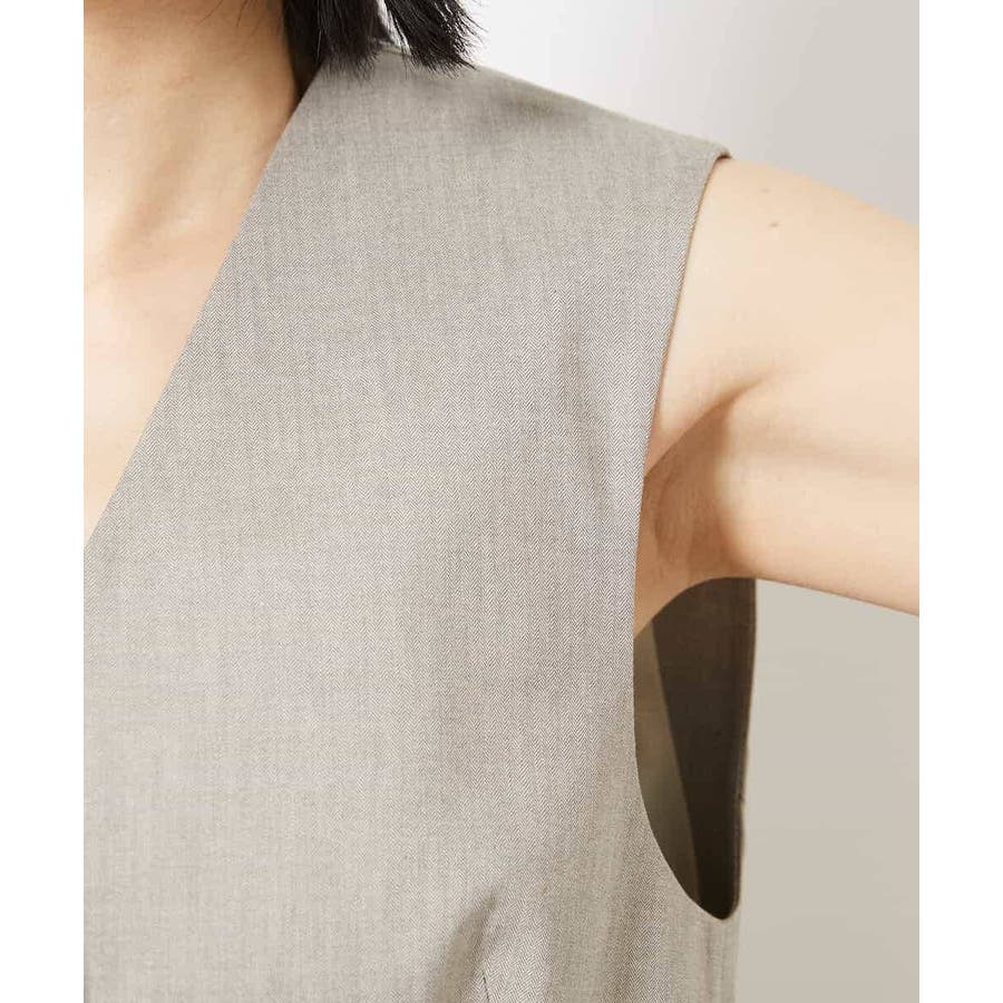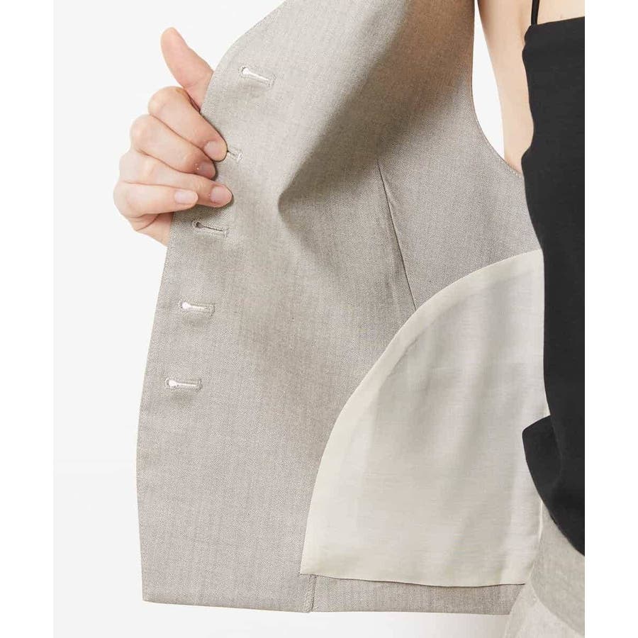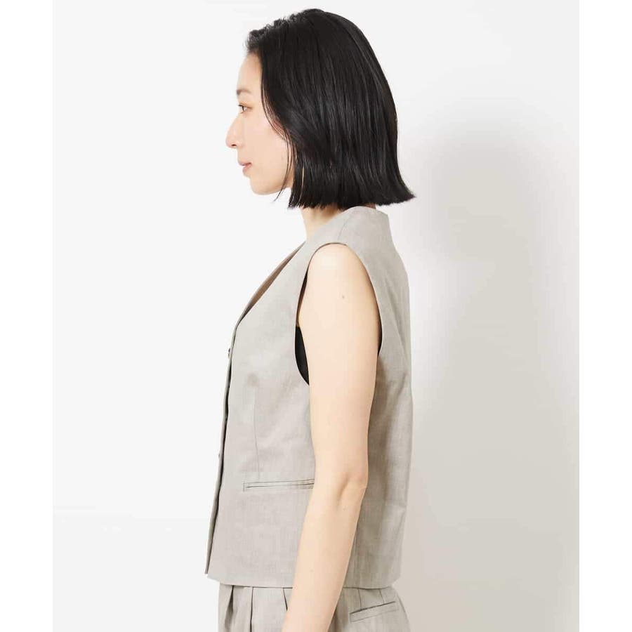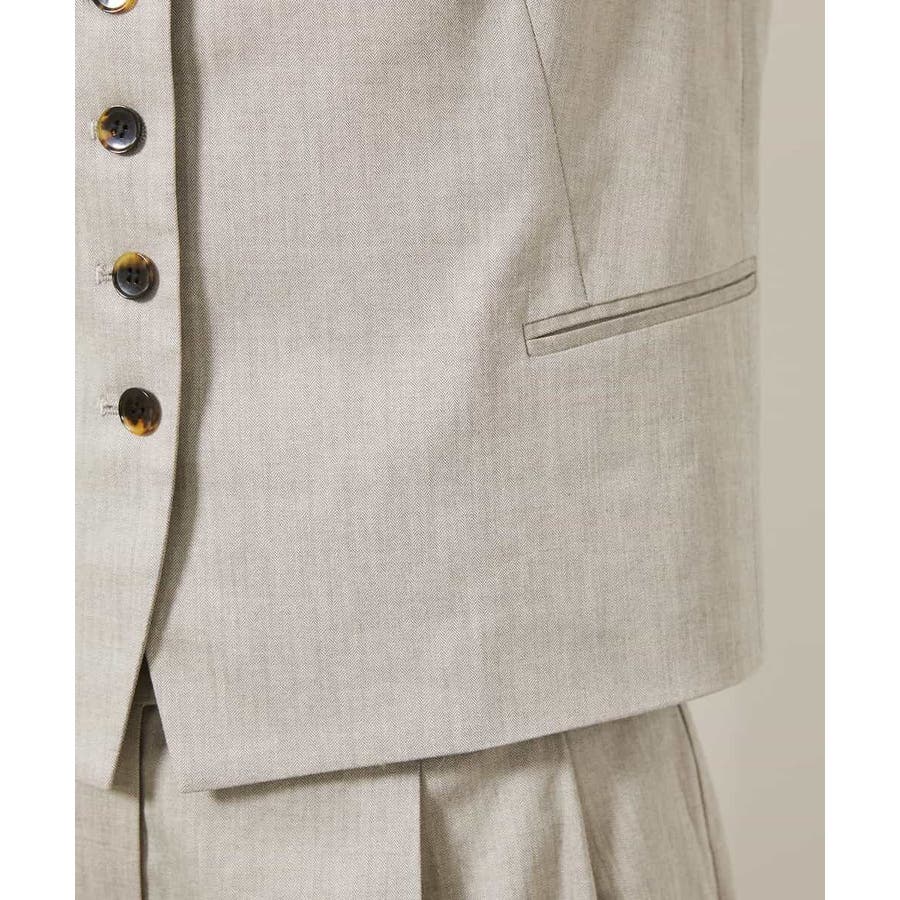 細かなへリンボーン柄が無地ライクで着られるジレベストです。ノーカラーで、首回りをすっきりさせ、暑いシーズンでもお召しいただきやすい一枚です。40サイズは限定店舗展開です。